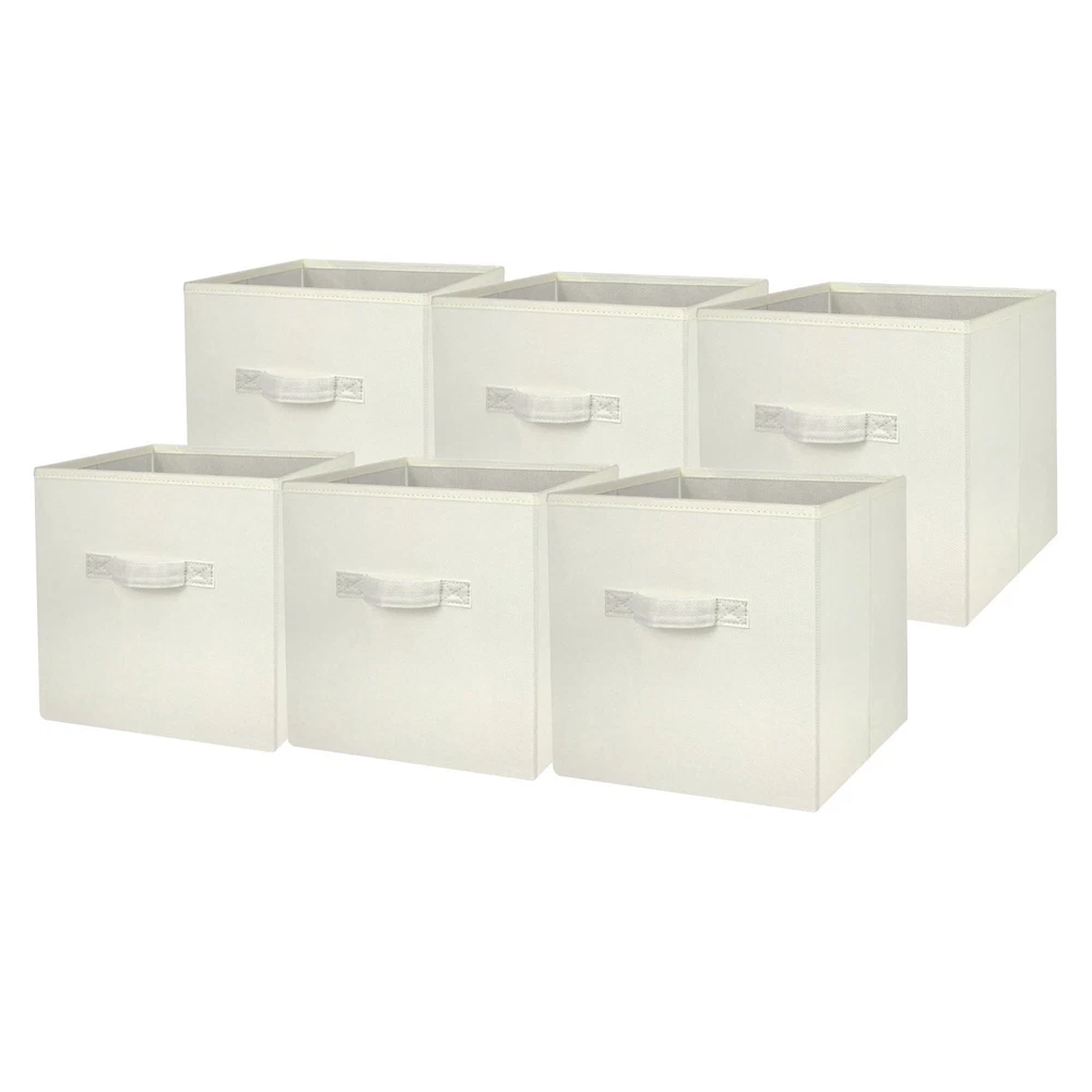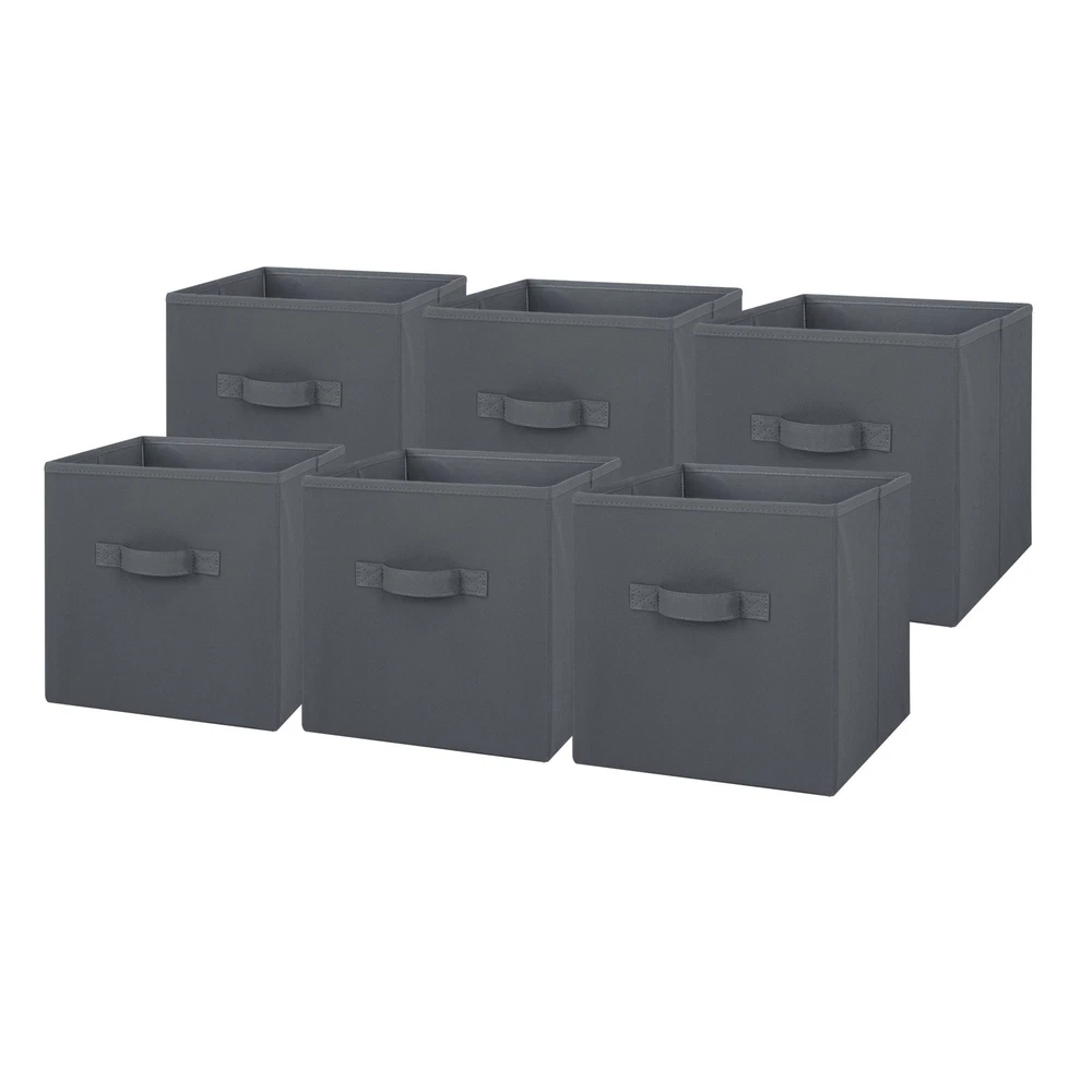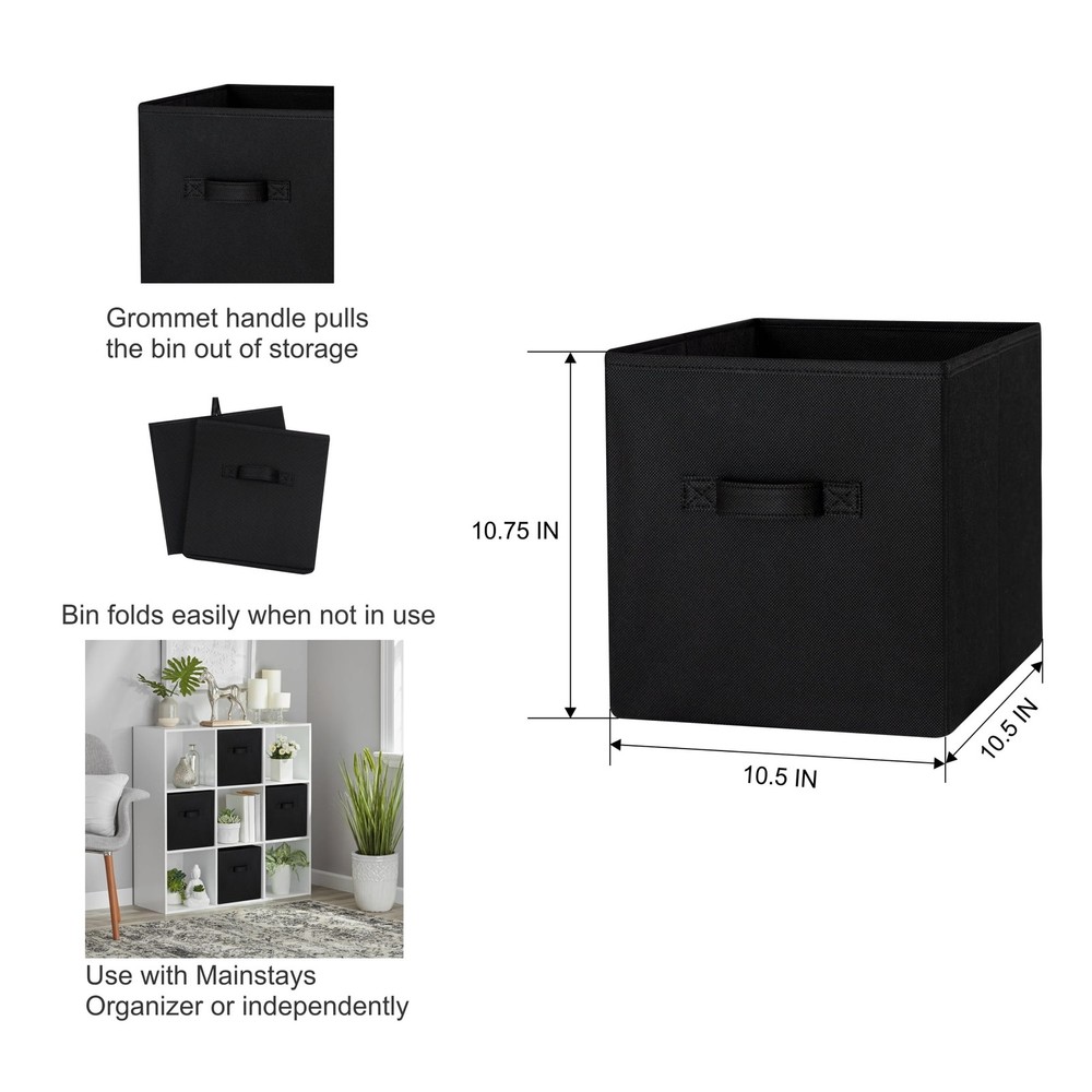 Our Mainstays Rich Black Collapsible Fabric Storage Bins are just what you need to help you create an organized home. Perfect for storing kids to adult clothes, books, electronics and more, these bins' 10.5-inch by 10.5-inch by 10.75-inch size offers plenty of room to keep a wide variety of belongings neatly tucked away and their sturdy handle allows you to pull them off shelves with ease. You can utilize our Mainstays Storage Cube's organizational expertise in your living room, bedroom, laundry room, or dorm room. When not in use, you can easily fold the bin down flat and keep it stored away in your closet for later. The fabric storage cubes are made to fit with our Mainstays Cube Storage Organizers and are designed with a durable fabric that holds up over time. With a variety of colors to choose from, you'll be able to perfectly match your home decor when you get organized with our Mainstays Collapsible Fabric Storage Bins. Helps you to create an organized and comfortable home Includes 6 black cube organizer bins Perfect for pairing with your favorite colors and patterns to mix and match Bin features an easy carry handle on the side that makes it easy to take the bin wherever you need to go Can be used with our Mainstays Cube Storage Organizer units or independently Cubes are collapsible when not in use to maximize your space Ideal for storing books or kids and adult clothing in the bedroom, living room, laundry room or dorm rooms Made of a durable fabric that won't crease easily, has good abrasion resistance and holds its shape Dimensions: 10.5" L x 10.5" W x 10.75" H (26.5 cm x 26.5 cm x 27.3 cm)