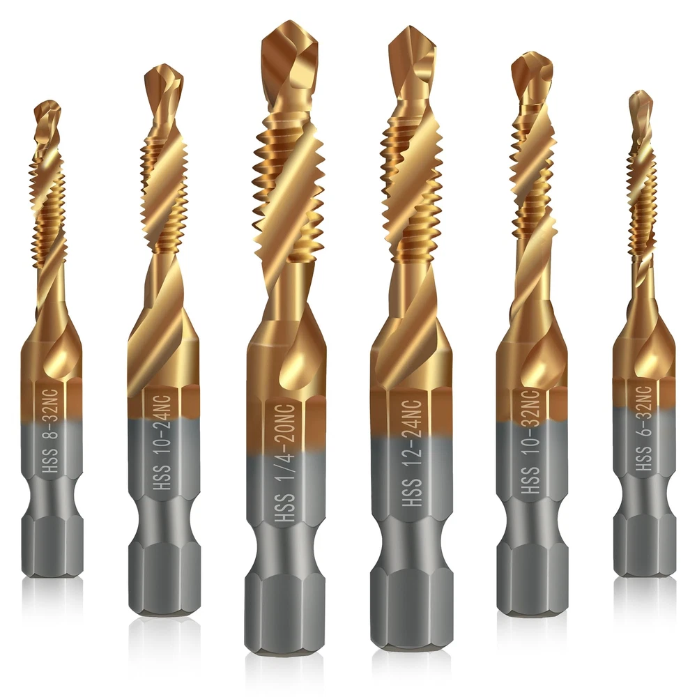 【ALL-IN-ONE HIGH-EFFICIENCY TOOL】 Experience seamless drilling, tapping, and countersinking with our 3-in-1 combination drill tap set. It eliminates the need to switch tools midway, saving you time and costs while boosting work efficiency. A must-have for both DIYers and professionals 【VERSATILE PERFORMANCE】 Perfect for fabricating aluminum, plastic, wood, fiberglass, and other thin soft metals (under 1/8" thick), this tap and drill set delivers reliable performance from workshops to DIY projects. Note: Not suitable for high-hardness metals and stainless steel 【WIDE APPLICATION & COMPATIBILITY】 drill tap bits set including 6 sizes sae tap - 6-32nc 8-32nc 10-32nc 10-24nc 12-24nc 1/4-20nc, with 1/4-inch hex quick-change shank, our drill and tap bit set fits variety power tools, like electric hand drill, impact drill, bench drill, electric screwdriver and other tap machines, ensuring versatility across different applications & scenarioes 【USER-FRIENDLY DESIGN】Each thread tap drill bit is clearly engraved with its size on the hex shank for easy identification. The hex handle’s tapered end minimizes excessive impact, while the extended back taper prevents over-drilling and thread damage. A practical tool for precise and hassle-free use 【IMPORTANT TIPS FOR BEST RESULTS】 Use cutting oil, drill slowly, and ensure the tapping drill bit set is fully aligned and level to ensure straight tapping holes. Apply gentle pressure to prevent thread damage. For safety, always wear protective eyewear while using this threaded drill bits set