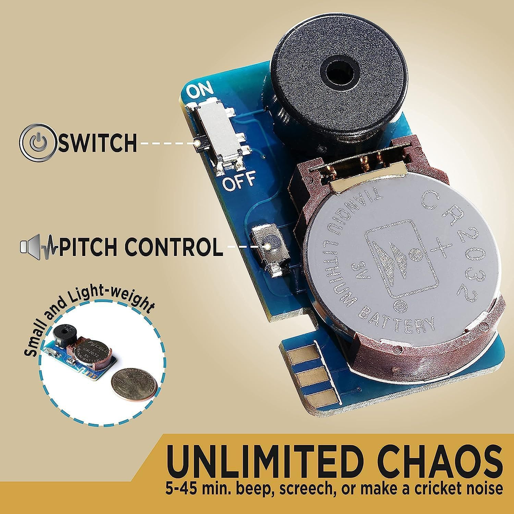 Description: 🔋 Long-Lasting Battery Life Say goodbye to short-lived pranks! Our cricket noise maker prank kit comes with a powerful battery that keeps the fun going for months. No need to worry about the battery dying after just a few days—this prank device is designed to keep chirping and beeping for what feels like forever. 🎯 Easy to Hide, Hard to Find This tiny, lightweight beeping device is the ultimate stealth prank tool. Its compact size allows it to blend seamlessly into almost any environment. Use off-brand tape or a magnet to secure it in place, and watch as your friends or coworkers struggle to locate the source of the mysterious sound. 🔍 Hard to Locate - Random Chirping Intervals The secret to this prank's success lies in its random chirping intervals, which range from 3 to 20 minutes. This unpredictability makes it nearly impossible for anyone to pinpoint where the sound is coming from, ensuring your prank lasts as long as you want it to. 😈 Sinisterly Fun Simply turn it on, choose from multiple sound options (cricket chirps, beeps, and more), and hide it in your target's space. The best part? It will keep sounding off for months, driving your friends, coworkers, or family members absolutely crazy. Perfect for those who are easily creeped out or annoyed by insect sounds! 🎁 Perfect Gag Gift for Adults Looking for a unique and hilarious gift? This cricket noise maker prank kit is ideal for pranking friends, coworkers, or partners. Whether it's for April Fool's Day, a birthday, or just to spice up a boring workday, this prank device is guaranteed to deliver endless laughs.