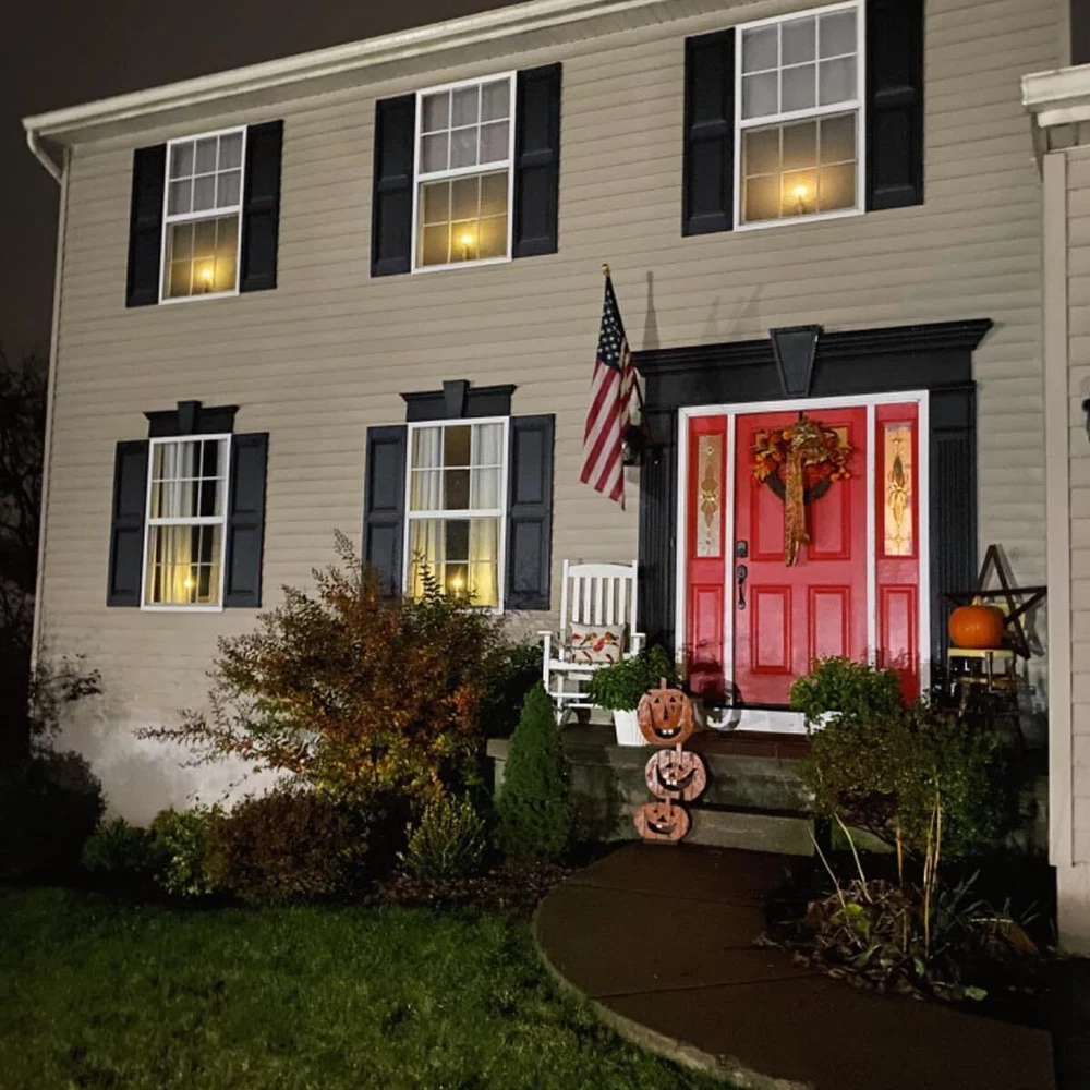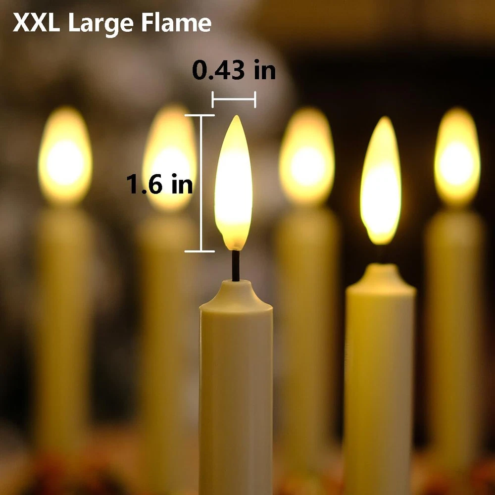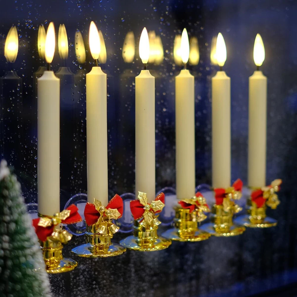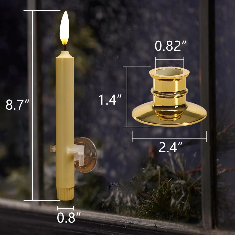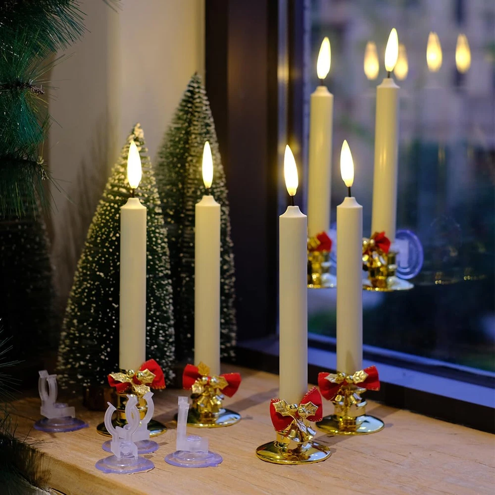 flameless window XXL Large Flame: The newly developed flame lamp perfectly reproduces the shape and size of real flames. The warm white LED light is pretty. they have a more natural flickering light.look and behave more like real candles, add to the ambiance of the holiday Battery Powered: Each candle needs 2 AA batteries, a total of 12(included). The included battery is high capacity and can run more than 400 hours continuously Size: Candle - 0.9" diameter, 8.7" hight; Candlestick - 2.4" diameter, 1.5" hight. No fire, no smoke, no messy dripping wax. Much safer and cleaner than real candles Remote / Timer: 10 key remote control to adjust the candle brightness, and the candles with 2/4/6/8 hours timer function, cycling every 24 hours. Candle will turn itself on every day at the same time and enjoy your warm time. The distance can be 5 meters Include: 6 Window Candles + 12 AA Batteries + 6 Golden Candle Holders + 6 Suction Cups + 6 Red Decor Bows(with Bells) + 1 Remote Control. The included bows and bells, combined with candles, add a celebratory atmosphere to your Christmas or holiday