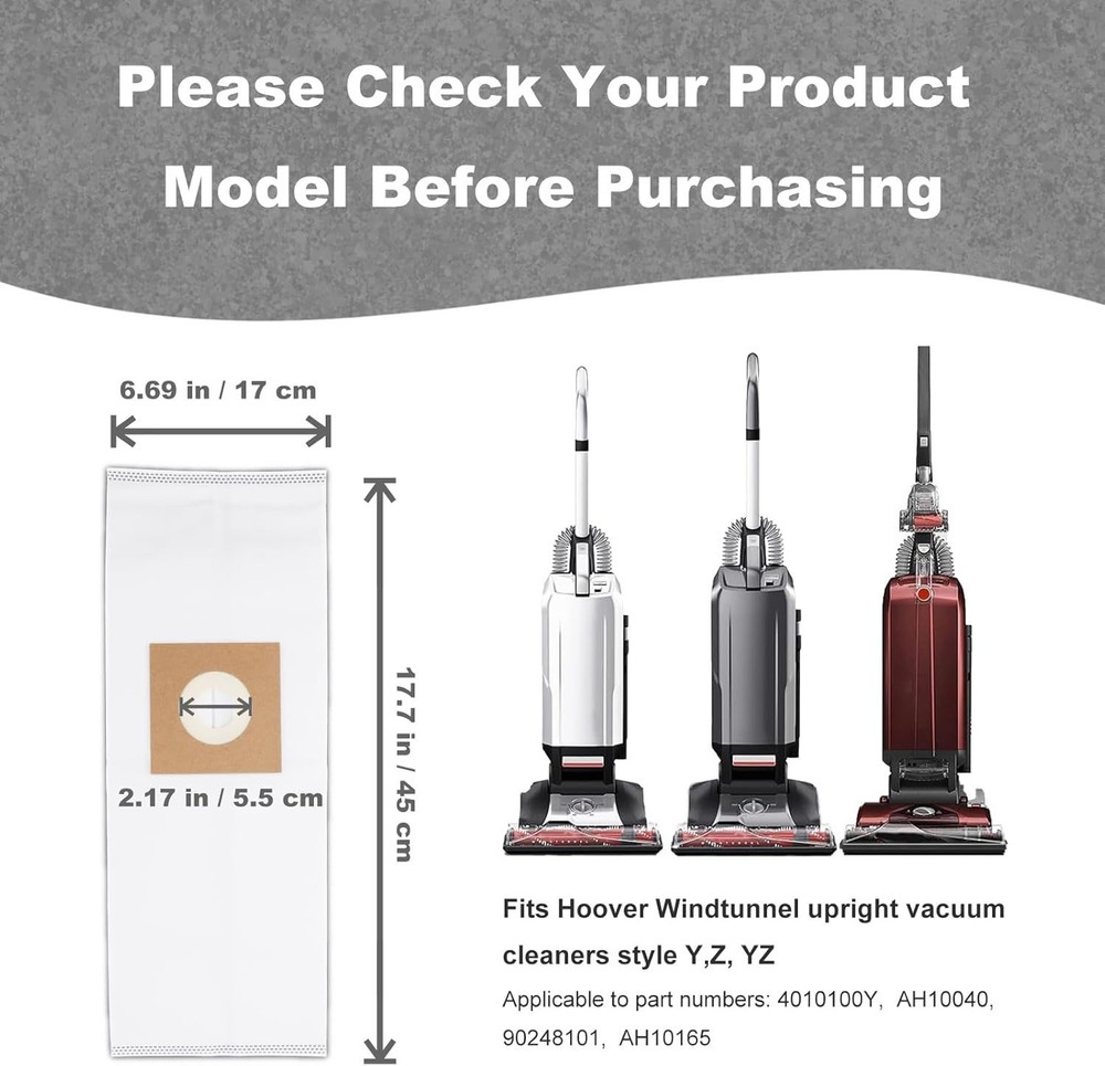 Upgrade your for Hoover WindTunnel vacuum experience with our premium Type Y replacement bags. These bags are engineered with advanced 5-layer filtration technology, capturing both large debris and microscopic particles for superior performance. Featuring a sturdy cardboard collar and built-in rubber gasket, they ensure a secure fit and dust-free disposal. By reducing bag changes and protecting your vacuum motor, these bags save you time and effort while delivering cleaner air around your home or workplace. Each pack includes 6 replacement bags, offering excellent value for money and lasting durability. Compatible for Hoover WindTunnel upright vacuums using Style Y, Z, or YZ bags (Part Numbers: 4010100Y, AH10040, 902481001, AH10165). Please double-check your model to ensure compatibility. What You Get: 6 x Type Y Vacuum Bags Enhanced 5-layer filtration system Durable construction with anti-leak design For Hoover WindTunnel upright vacuums On Jan 1, 2026 at 23:40:05 PST, seller added the following information: