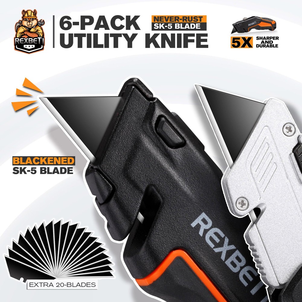 Ultra sharpness and double hardness blade, Perfect for hobby, DIY projects, cardboard, carpet, Rope,boxes, wallpapers, vinyl, rubber, leather, PVC material and etc Comes with 6-pack utility knife, retractable design and folding design. Ergonomical and rubbery handle offers strong grip all the time Blade storage design for easy and quick access. Extra 3 blades storage in the handle Extra 20-piece blades included Quick-change blade mechanism
