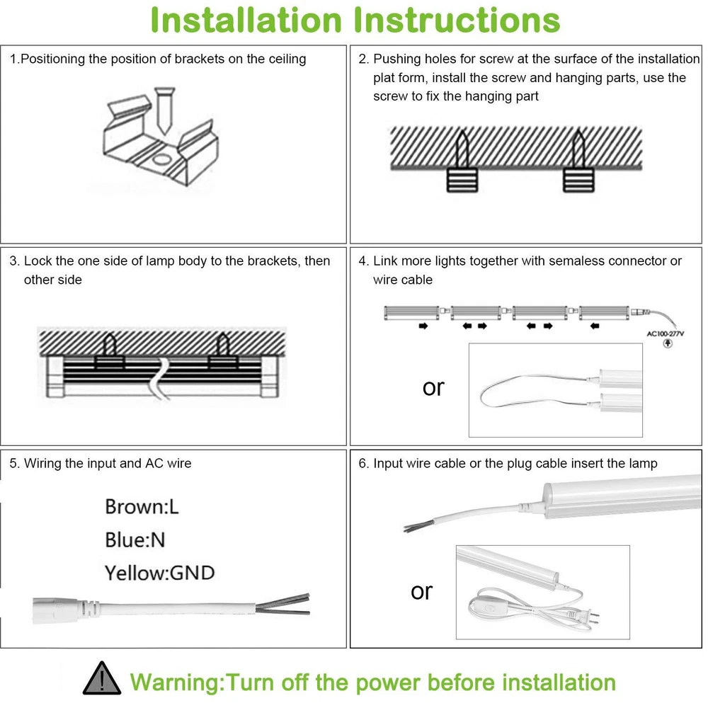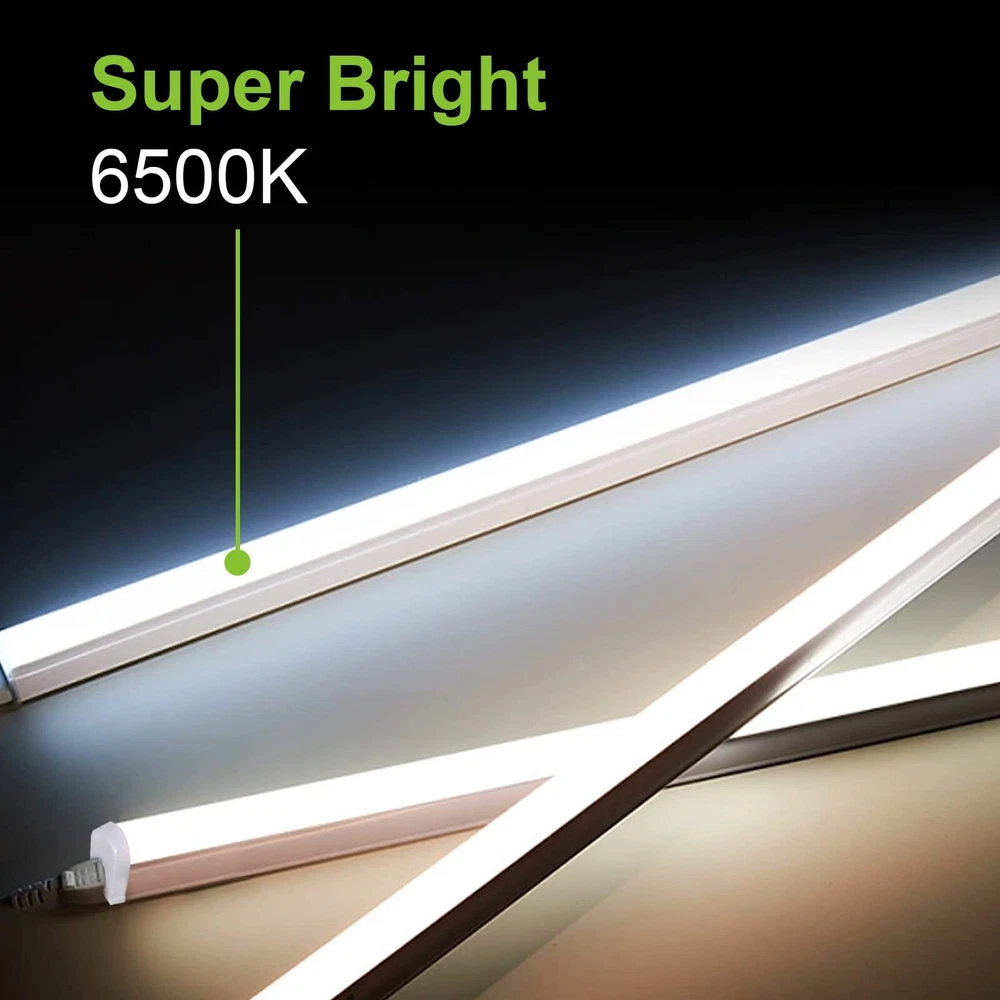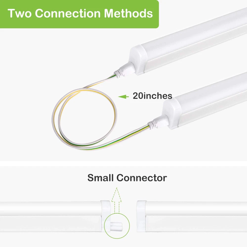 ✔ Up to 65% Energy Saving - T5 LED shop lights features 2200 lumens brightness by using only 22W, 40W equivalent to a fluorescent tube, provides a 65% reduction in energy usage. ✔ Linkable - Using 20" cords or seamless connectors to connect up to 7 pcs linkable shop lights together in your garage, cupboard, workshop, under cabinet and storage room. ✔ Lightweight - The 4ft T5 shop light weighs only 0.8lb/pc, it can be easily fixed firmly by attached 2 screws and 2 clips. ✔ Easy Installation- Plug & Play. Come with 59" power cord with on/off switch, and other small accessories in the INNER BOX, no external or internal wiring needed.