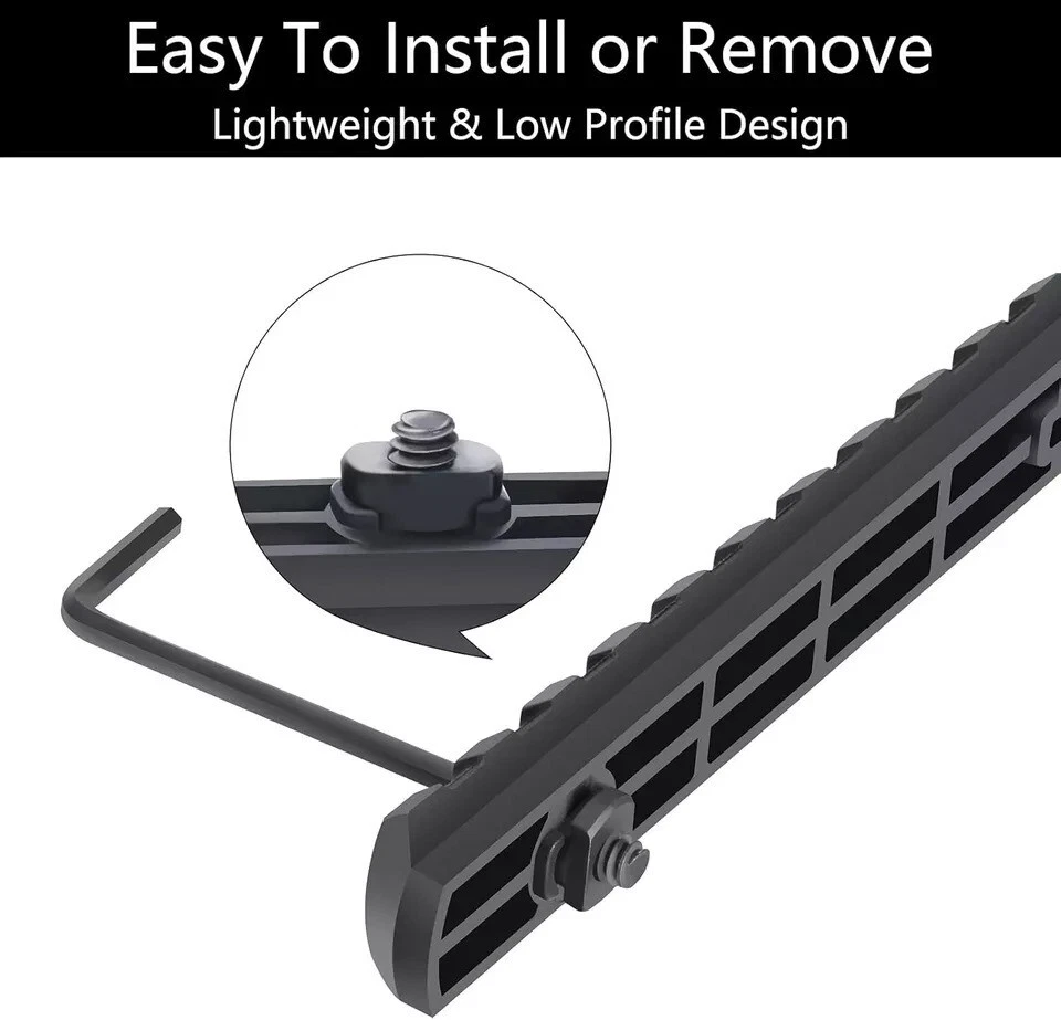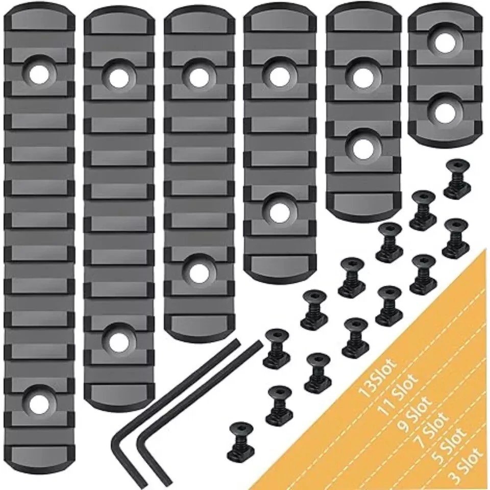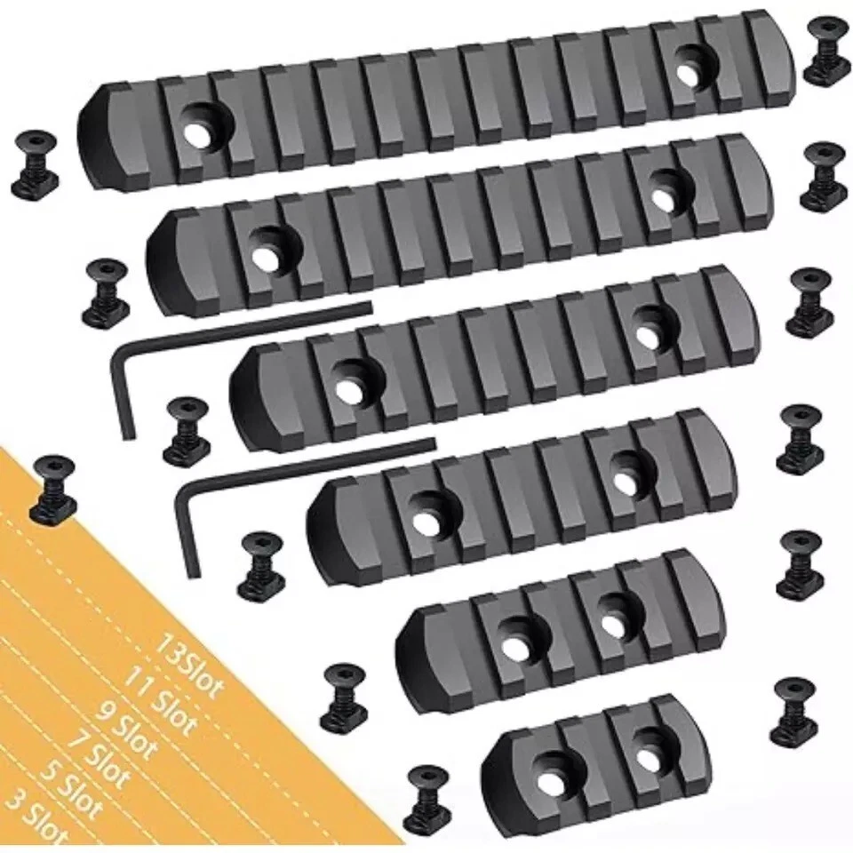 Free eBay listing template designed by dewiso.com 6 Pack Lock Picatinny Rail Aluminum 3/5/7/9/11/13 Slot Set M-Lok Picatinny Rail. About this Item This product is a single Picatinny rail that allows the attachment of all standard 21mm Picatinny-spec, rail-mounted accessories. It provides just enough rail space where you need it for each accessory, and is available in six different lengths. Installation is simple with the included screws and an Allen wrench tool, making it easy to install or remove. The pack includes rail sections with 3, 5, 7, 9, 11, or 13 slots, along with 13 sets of matched screws, 13 sets of locking T-Nuts, and 2 Allen wrenches. The ultra-light rail features solid polymer construction and a low-profile design to reduce bulk. The weight for each length is as follows: 13 slots (0.65 oz), 11 slots (0.56 oz), 9 slots (0.48 oz), 7 slots (0.36 oz), 5 slots (0.28 oz), and 3 slots (0.19 oz)—much lighter than aluminum alloy—while maintaining high strength and safety. These rail sections are injection molded from a proprietary reinforced composite material, offering enhanced strength and durability while keeping the weight low. The beveled ends help reduce snagging and eliminate sharp corners and edges. Contact us We can be contacted at any time through eBay messages if you have any questions, comments or product requests. We will respond to you within 24 hours and do our best to help you out! We encourage our customers to contact us with any questions or concerns! We'd like to be sure you are completely satisfied with your purchase. Payment We accept PayPal, PayPal credit, Visa, Mastercard, American Express, Discover, Google Pay and Apple Pay. Immediate Payment is required. Shipping We provide FAST, FREE SHIPPING to the Continental 48 US States. We do not ship to Alaska, Hawaii, APO/FPO, PO Boxes or any US Protectorates. PLEASE PROVIDEA PHYSICAL ADDRESS. Your order will be processed with in the allowed time frame. Most items ship out with 1-2 Business days after payment is received. Please. not that some orders may be shipped in multiple packages. . Returns If you have any problem with product we can accept return within 30 days after purchase. If you want to return product, you can contact with us. THANKS FOR SHOPPING!