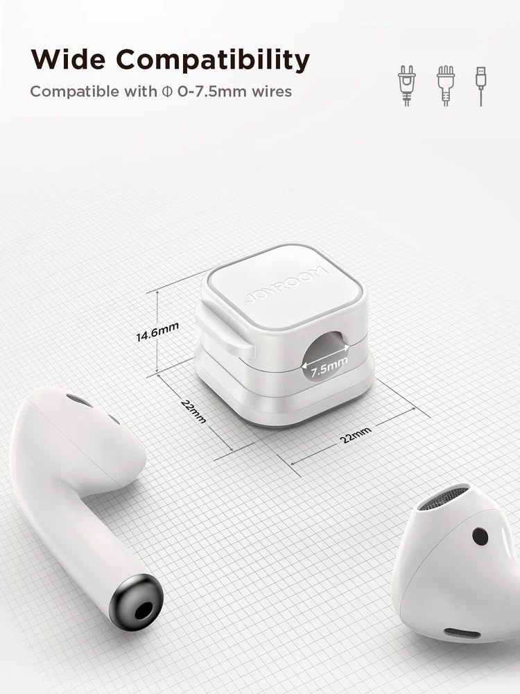 6 Pack Magnetic Cable Clips [Cable Smooth Adjustable] Cord Holder, White Product Details Brand: JOYROOM Color: White Material: Acrylonitrile Butadiene Styrene, Acrylic Style: Modern Product Dimensions: 0.87"L x 0.87"W 7.5 mm Perfect Cable Slot Diameter: Diameter of 0.3 inches (7.5 mm) can hold most cables, such as phone charging cables, USB cords, HDMI thick cables, computer power cords, etc. Besides that, the slot diameter of 7.5 mm can perfectly hold a charging head as small as the iPhone original silicone charging cable without falling off, and the held cable can be pulled out smoothly for use Magnetic Clamp Design: The unique magnetic opening and closing cable clip design allows you to place and remove cables with only one hand. Unlike other cord holders on the market, Joyroom cable organizer uses a sophisticated 60° rotating shaft and magnetic locking cord design, helping you easily snatch a cord off or easily add a cord easily Enhanced No-Residue Acrylic Adhesive: The Upgraded Acrylic Adhesive sticky pad allows the cable organizer to stick firmly to almost any flat& clean surface, such as wooden tables, glass, ceramic tiles, etc. Meanwhile, the transparent removable acrylic adhesive pad will not damage your desktop, wall, no residue left after removal. A replacement stick pad is also included in the box, making it possible to reuse the cord holder Makes Your Cables Organized: Joyroom cable Organizer could hold cables in place firmly and keep them off the floor. More importantly, the 6-pack set allows you to keep cords toward neat traces as you wish, such as setting them on the office desktop, tableside, table corner, wall, or car dashboard Thoughtful Details: The ultimate width of 0.87 inch cord holder allows it to be firmly fixed in most narrow spaces. Joyroom cable organizer does not take up too much sticking area, and it can be perfectly hidden in any small corner you care about. [Kindly Installation Tips: Please clean the desired surface without dust before sticking, and keep pressing for 30 seconds to enhance the adhesion of the sticky pad. Highly recommend waiting for 12~24 hours for better use]