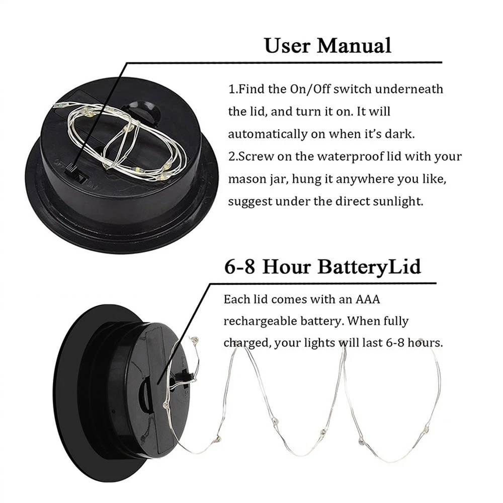♥With this mason jar lights, you could make full use of your mason jar to DIY the beautiful garden decor, deck decor, patio decor etc. If you hang it on the tree, when you have a garden party or wedding night, this light will definitely create beautiful ambient out of your expected. ♥Your solar mason jar lid insert fits into most standard glass mason jars. Simply open the jar and place the LED solar light into the mason jar ring, and close the lid - instant mason jar light! Each light has a built in light sensor so that it automatically turns on in the evenings as the light dims. Each light also includes and On/Off switch underneath the lid. User Manual: 1.Find the On/Off switch underneath the lid,and turn it on. Automatically turn ON/OFF by light sensor(Build-in the Lid), the light will turn ON when the dark,and the light will turn OFF when the daytime. 2.If the lights not bright, please put the lid under the sunny for recharging first. 3.Screw on the lid with your mason jar,hung it anywhere you like,suggest under the direct sunlight. Warning: Please keep the switch on, when you put the solar panel under the sunlight to get charged Please tear the protective films off before you install the mason jar lights into the mason jar lids Please keep the surface of solar panels clean, because the dust or something else will affect the efficient of charging Specification: Light color: Warm White Led Light Quantity: 20 lighting mode: Always(does not flicker) Charging Time: full recharge need 6 hours. Working time: 5-7 hours when the battery fully charged Package includes: 6 x Solar mason jar lid with led string lights(AAA Rechargeable Battery Included in the lid) (Manson Jar Not Included) Solar Powered Mason Jar Lid Lights. - Energy Saving & Environment Friendly. 100% solar powered solar panel, no requires external wiring. 1.2v/600mAH AAA rechargeable battery included. It need take 6-8 hours charging time by fine sun light, light up for about 8-12+hours. Recycle Discarded Mason Jars a Beautiful Lights. - Popular Solar Mason Jar String Lights Lid,be good decorations around apartment. Soft color easy make a indoor romantic atmosphere for family. Waterproof Regular Standard Mouth: The mason jar lid including waterproof gasket to make a better waterproof. Fits for all regular mouth mason canning jars.Great for outdoor garden patio deck wedding Christmas parties. Automatically Turn ON/OFF Smart Light Sensor. - Lights will turn ON when the dark,and turn OFF when the daytime. Each light includes an On/Off switch under the lid, turn it on before charging by solar. 100% for long life used. Any problem can us first for free, we will give you a prefect solution and provide you the best .
