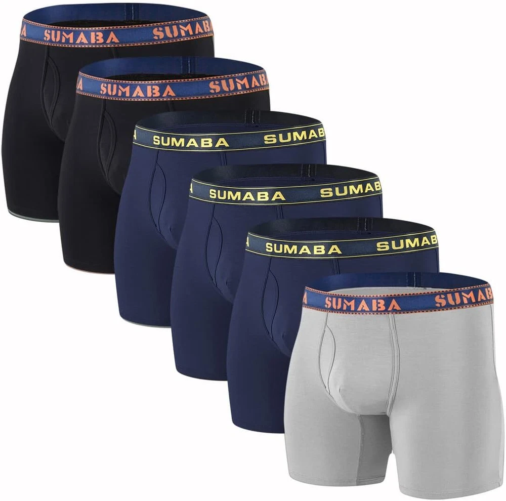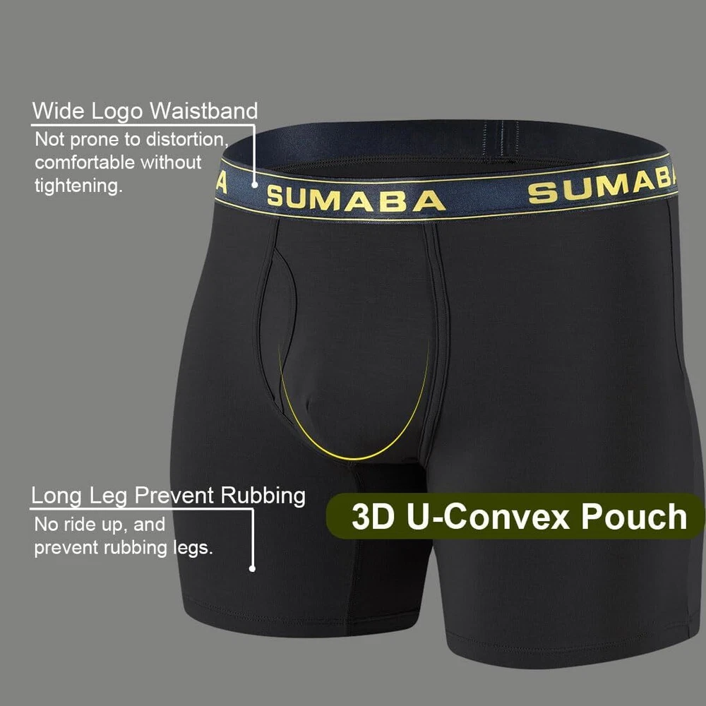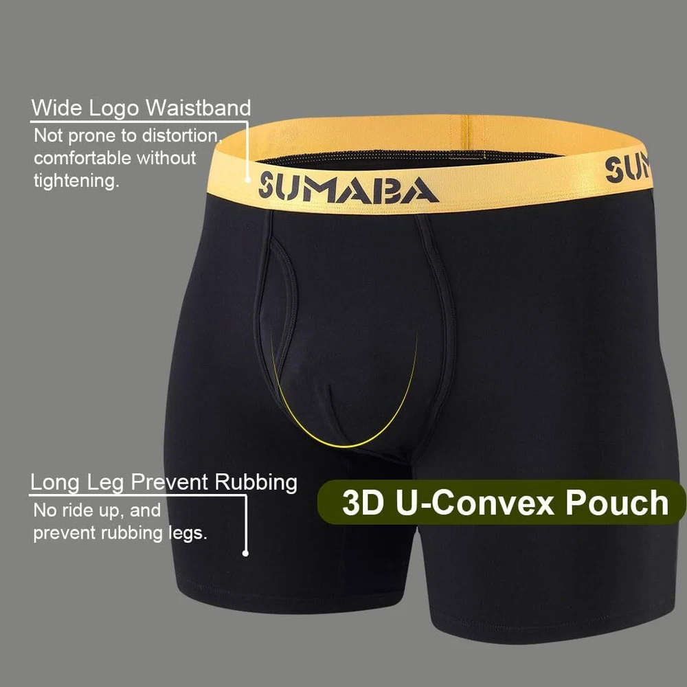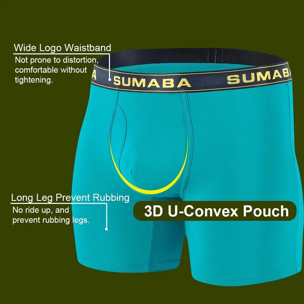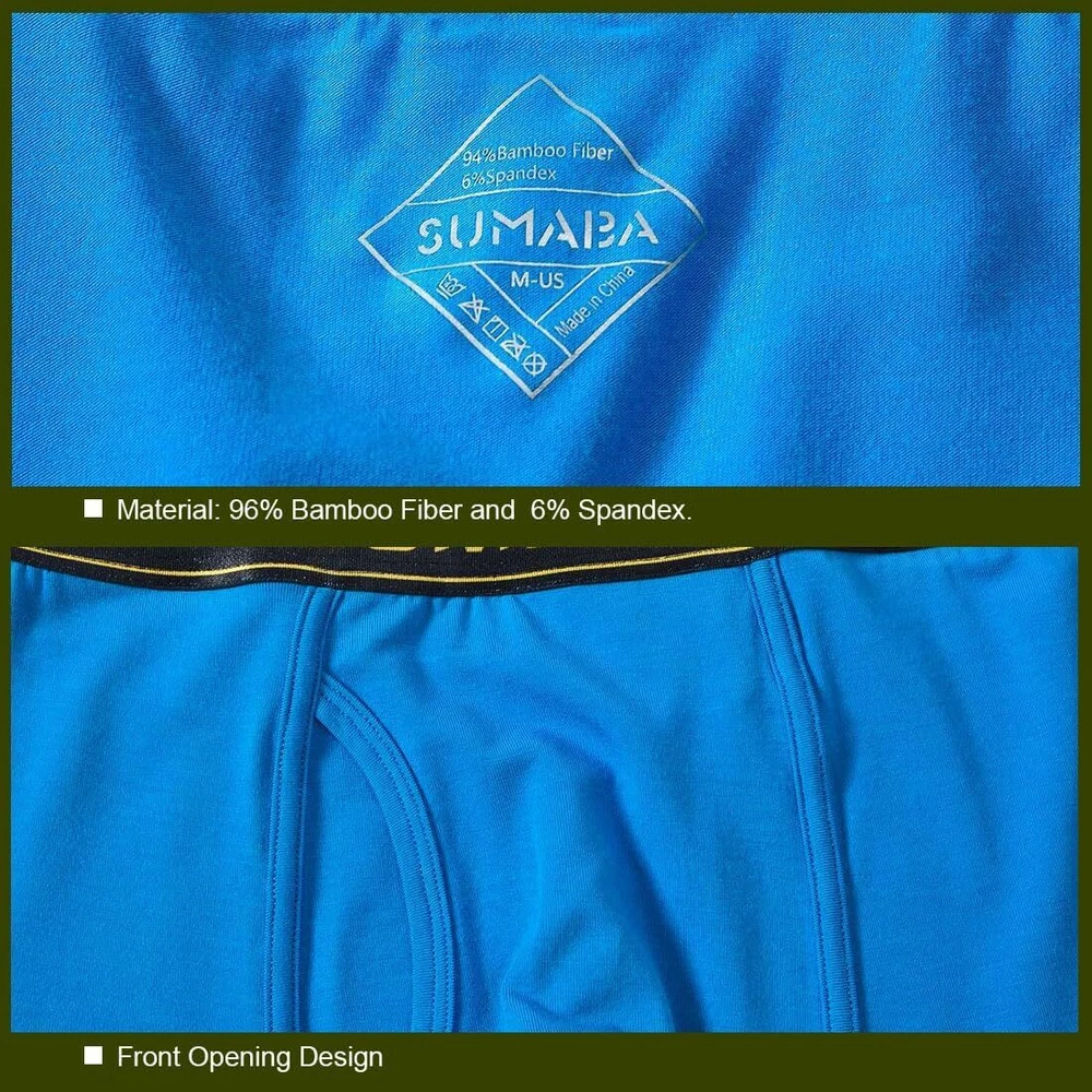 Product Description SUMABA Moisture Wicking Underwear for Men KEY FEATURE: Premium Underwear Material: Made from 95% Bamboo Fiber and 5% Spandex, Super soft, Breathable, Stretch, Anti-Wrinkles. No Ride Up & Avoid Thigh Friction: With 6" Longer Leg Length, No Ride Up More Fitted to the Leg, and Effectively Prevent Pain Caused by Leg Friction. U-Pouch & Open Fly: With U-Pouch Design, Can Provide Good Support to Men. Pocket Open in Front is Easy-Go When Nature Calls. Tag-Free Label and Logo for All-Day Comfort. Healthy Fabric and Soft Touch: Bamboo Fiber is a Natural Material More Skin-Friendly and Feels Very Soft. Smooth Non-Chafing Stitching: No Sides Visible Seaming and Back Seam Feel Smooth on Your Skin. Material: 94%Bamboo Viscose and 6%Spandex The fabric is very soft, skin-friendly and breathable, leaving you comfortable all day long. No Roll Waistband The 1.38 inch wide waistband does not tighten the waist and is comfortable without marks. Mens Underwear with Pouch Open Front Double layer pouch open front , three-dimensional space is more comfortable and convenient. No Inductive Hot Dtamping Label No feeling label, more comfortable and frictionless.
