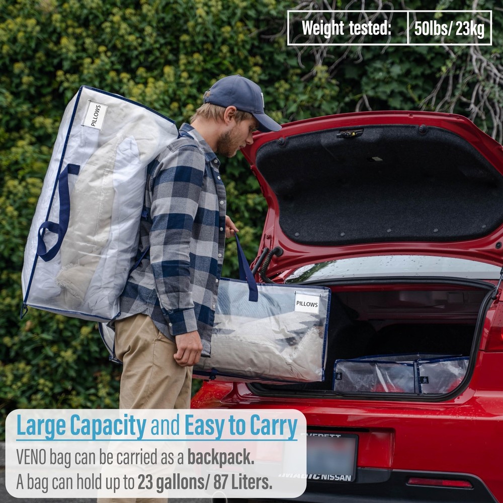 VENO 6 Pack Moving Bags w/Backpack Straps, Heavy Duty, Moving Boxes Alternative, Packing Supplies, Large Storage Totes for Dorm Room Essentials with Zipper for Clothes (Clear, 6 Pack) Hassle-Free Move without Boxes – No need to buy or assemble packing boxes or look for moving supplies. Streamline your move with VENO strong and spacious heavy duty moving bags that make a lightweight, convenient, and economical alternative to moving boxes. Just unfold, unzip, and begin loading to move your essentials into your college dorm room or new home! Use a wipe or damp cloth to clean & followed by air-drying. Collapse and fold flat to store in your drawers, cabinets, or shelves. Dual Carrying Options w/ Backpack Straps & Handles - Carry heavy loads effortlessly with VENO's versatile storage & moving bags. Designed with robust poly webbing straps, our packing bags can be worn like a backpack or carried using the strong handles. Capable of holding up to 50 pounds and offering 23 gallons of space, VENO bags ensure durability and water-resistance with PP-woven material.VENO bags are sustainable and reusable, designed for convenience and durability. 29.1"L x 14.2"W x 13"H. No Need to Remove Clothes Hangers – Skip the hassle of detaching hangers from clothes during moves. Fits hangers up to 16.5", allowing you to place clothes inside with hanger handles peeking out at the top, zip up, and easily hang them again in your new closet. A superior alternative to wardrobe boxes with bars, these bags offer a lightweight design and easy transport for a seamless moving experience, while shielding your hanging clothes from dust and moisture to keep garments safe and clean. Clear Tag Pocket & Wide Opening – Say goodbye to the frustration of searching for your belongings. Make a custom label and insert it into the clear tag pocket for easy identification of items like blankets, bedding, pillows, and clothes. Remember to use this labeling feature for organizing college dorm room essentials, moving to a new home, or storing items in the garage. The bag is equipped with dual extended zippers, creating a wide opening that allows for effortless access to stored items. Multifunctional - These bags excel in transporting camping essentials, featuring a large capacity suitable for sleeping bags, camping accessories, and dry food. Their water-resistant material safeguards belongings against moisture outdoors. The bag's heavy-duty material is designed to withstand wildlife chewing and tearing, offering added protection for your belongings. Additionally, they're ideal for compact spaces like college dorms and RVs, keeping items organized and tidy when not in use. VENO Extra Large Heavy Duty Reusable Storage Moving Bags are incredibly durable and versatile. With durable poly webbing handles, they are perfect alternatives to moving boxes. These bags are ideal for storing linens, pillows, blankets, clothes (with hangers still attached), books, shoes, and holiday decor. They feature a full-length zipper for easy loading and unloading and offer multiple carry options, including backpack straps and bottom straps for ultimate flexibility. Use them as an alternative to Ikea bags with zippers or traditional moving supplies, making them perfect packing bags for moving. These heavy-duty moving bags can hold up to 50 pounds, fitting medium and large moving box needs. They are ideal for college students, families in apartments, and anyone looking for efficient storage and moving solutions. Choose VENO to streamline your move and protect the environment. SHIPPING Domestic Buyers - We have confidence in our products, but if you are not fully satisfied please contact us within 30 days of purchase and you will get full refund. - We ship within 3 business days of payment, usually sooner - We offer FREE shipping on all orders! - We only ship to the lower 48 states, no APO/FPO addresses or PO Boxes allowed International buyers – please note: Import duties, taxes, and charges aren't included in the item price or postage cost. These charges are the buyer's responsibility. - Please check with your country's customs office to determine what these additional costs will be prior to bidding or buying. * Order Cancellation Policy ** You can return a product for up to 30 days from the date you purchased it. 1. The seller reserves the right to cancel the special case only due to eBay cancellation fee. 2. The decision of seller is the final. 3. The seller will respond to the cancellation request within 2 business days. Please wait for the result of cancellation. 4. In case the cancellation is not completed by some reasons, the buyer can follow the options below to get the refund. 4.1 The buyer can reject the item when it arrives. 4.2 The buyer can send the item back to the seller within 30 days If the buyer receives item (USA Shipment ONLY). The seller will provide the FREE return label to the buyer when the buyer opens " Return Item" case on eBay by using the reason as "Change my mind" ONLY. 5. When buyer has placed the order. The order will be processed and completed by automatic warehouse system within 5 minutes. In case that buyer sends the cancellation request after 5 minutes of placing the order, the request will be rejected. **Sending direct message to cancel the order is not allowed for every case.* Return Policy For the return case - If buyer would like to return the items for refund or replacement, please CONTACT SELLER to receive the free return label from seller. The refund or replacement will be processed with the tracking number of return label which is provided by seller only. The other ways of return which are not approved by seller will not be processed for the refund or replacement.