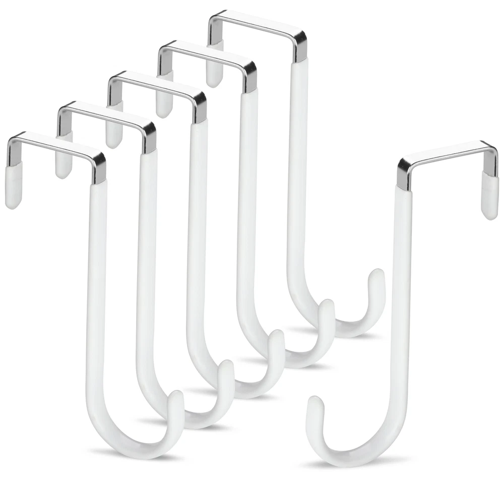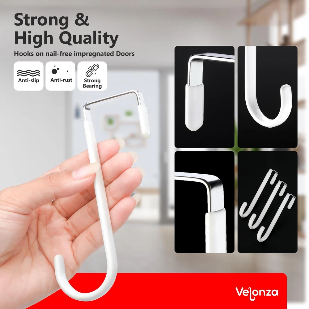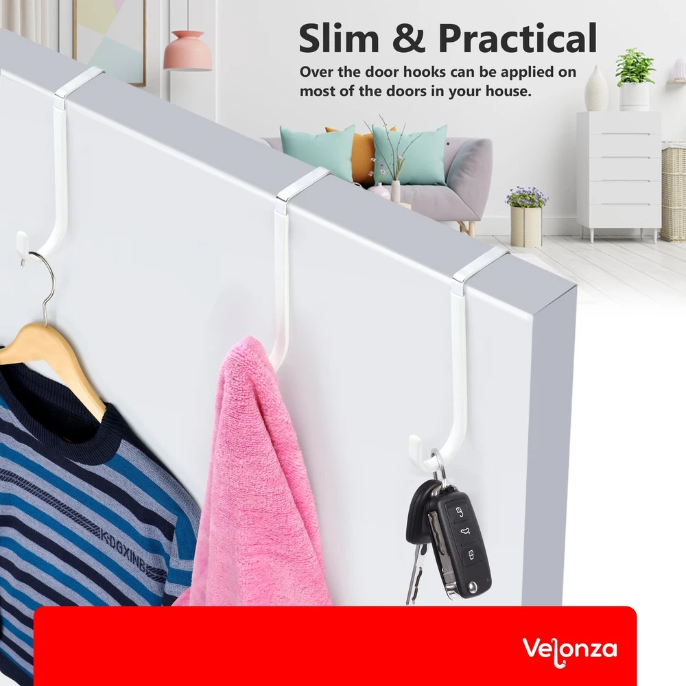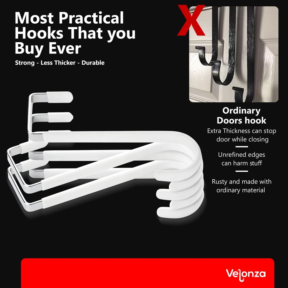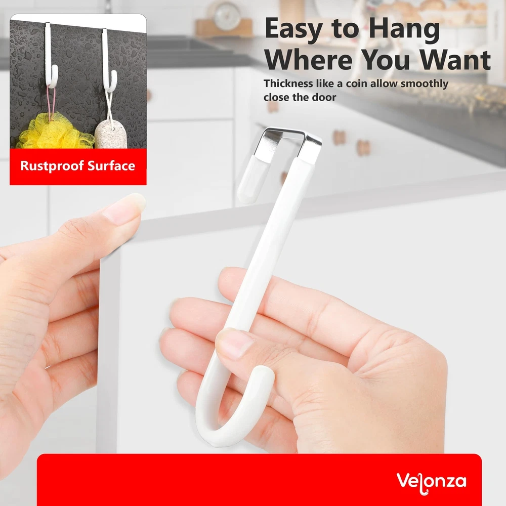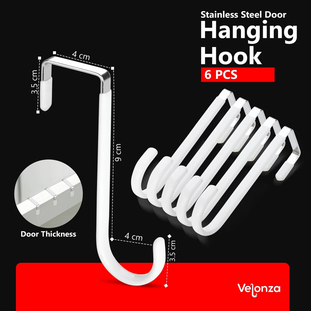 6 Pack Over The Door Hooks Wreath Hanger - White Rubber Coated Door Hanger Hooks - Scratch-Resistant - Ideal for Living Room, Bedroom, Kitchen - Perfect for Towels, Hats, Coats, Bags and clothes Product Details Color: White Brand: Velonza Material: Stainless Steel Finish Type: Polished Mounting Type: Door Mount Item Dimensions: 5.12 x 1.4 x 0.3 inches Item Weight: 0.65 Pounds Shape: S Shapped Style Name: S Shapped Color: White Finish Types: Polished Material Type: Stainless Steel Weight Supported: 15 Kilograms Model Number: VDH-001 Brand Name: Velonza Recommended Uses For Product: Key Hanger, Purse, Closet, Door, Coat Included Components: Mounting Hardware Additional Features: Over the door hooks for hanging purse, clothes, belts, jeans, clothes and many more Number of Hooks: 6 Mounting Type: Door Mount Heavy Duty Door Hanger: Made of high-quality durable metal with a strong load-bearing capacity, these over the door hanger can hold up to 20 pounds, ensuring they can securely hold your items without bending or breaking Rubber Coated Hooks: Door hooks are coated with soft rubber, which are not only to protects your doors from scratches but also provides a comfortable grip for hanging items. Over the door hooks for hanging can be used in bedrooms, bathrooms, living rooms, and kitchens Versatile Usage: Over the door hook can be used to hang a variety of items, such as clothes, towels, hats, coats, bags, and more. They are perfect for organizing your space and keeping your items neat and tidy Easy to Install: With a simple installation process, Over door hooks can be attached with any door in seconds without using any tools, convenient and hassle-free solution for organizing your home. Space Saving: Over door hanger take up minimal space, making them ideal for use in small spaces such as apartments, dorm rooms, and RVs. They can help you maximize your storage space and keep your home clutter-free. Multi-Purpose: Whether you need extra hanging space in your bedroom, bathroom, or kitchen, these hooks are the perfect solution. Ideal for Christmas Wreath Hanger.