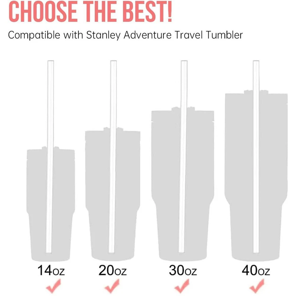 Stanley reusable straws are a must-have for any travel mug or tumbler. Made of durable Tritan material quality,very clear, these straws are built to last through daily use without bending or breaking. this set makes it easy to sip on the go while reducing single-use waste. The straws are easy to clean simply by rinsing with water. Their high quality construction means they'll stand up to repeated use and dishwasher cleaning. Carry your favorite beverage anywhere while doing your part for the environment with these reusable straws from a brand you trust. At over 12 inches in length, these straws are ideal for drinking from tumblers and most standard glasses or bottles. Dishwasher safe for easy cleaning. Perfect Fit :Compatible with STANLEY 40oz 30oz tumbler with handle, It includes 6 pcs reusable clear straws,6 silicone straw cover caps,1 cleaning brush 6PCS Tritan Straws: 12" length x 0.4" wide, plastic thickness is increased to 0.04". Food-grade tritan clear straw is BPA Free and 176F heat resistant. Each straw comes with an airtight snap-on lid to keep drinks sealed when not in use and prevent spills during transport. Better Drinking: Cold and heat resistantcan, stand up to wear and tear, perfect for daily water,beverage, juice. WIDE APPLICATION: The extra-long straws can be used with tumblers, cups and travel mugs up to 40oz like the popular Stanley vacuum bottle for hydration on the go. ECO-FRIENDLY CHOICE: By choosing reusable straws you reduce single-use plastic waste, protecting the environment while enjoying your favorite beverages in a practical and sustainable way.