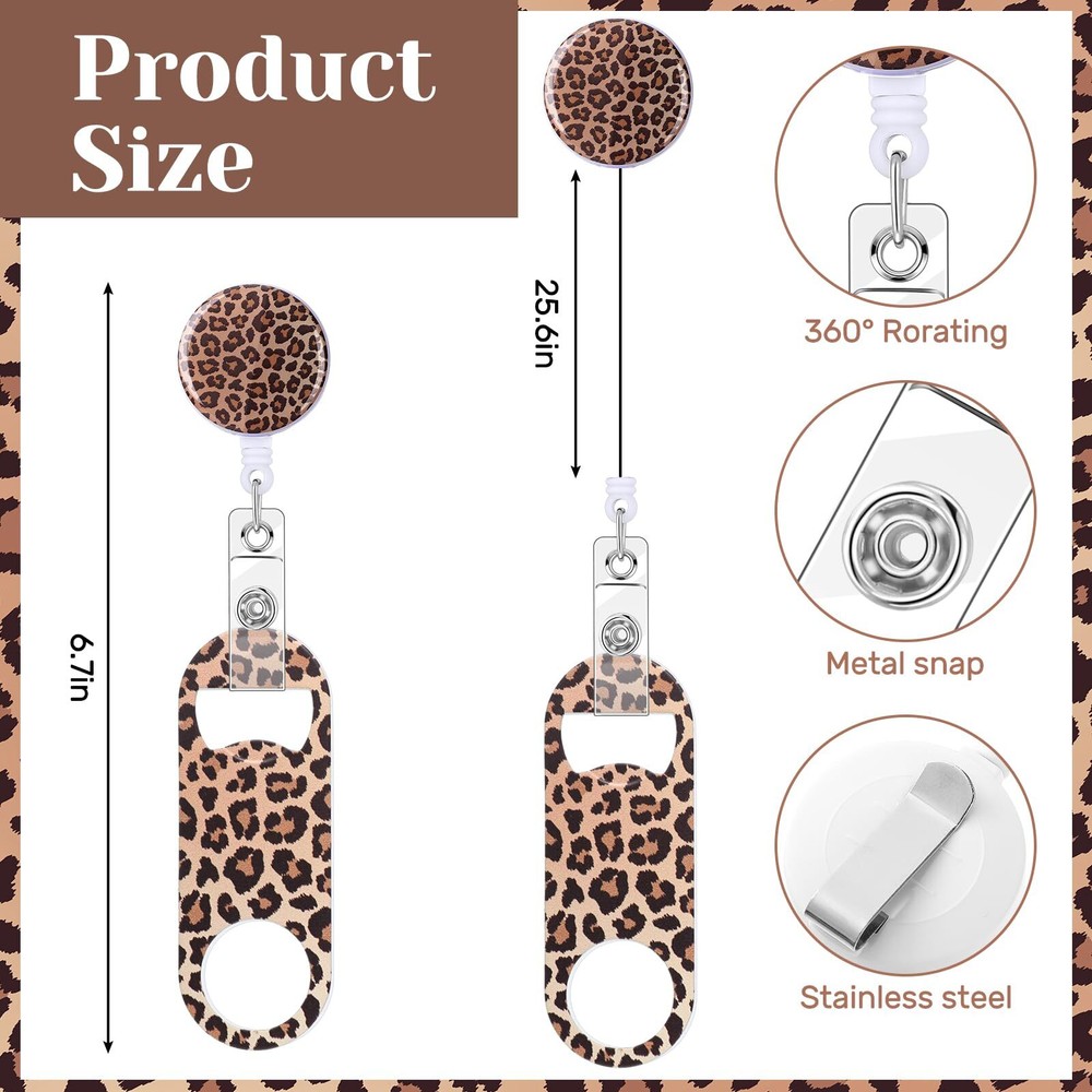 Features: Considerate gifts: Exquisite and useful, our marvel bottle opener can be a nice gift choice for your family, friends, neighbors, colleagues and other people you care for, which will bring them a lot of convenience and show your close relationship. Ideal for daily use: The leopard pattern on the retractable beer opener keychain is delicate and eye catching, suitable for daily wear, and its compact size allows it not to interfere with your movements and can help you open the cap when you need a drink. Specifications: Material: stainless steel and plastic badge reel Color: as shown Size for opener: approx. 3.54 x 1.18 inches/ 9 x 3 cm Package includes: 6 x Retractable bartender beer opener Notes: Manual measurement, please allow slight errors on size. The color may exist a slight difference due to different screen displays. Valuable Pack: you will get 6 sets of beer bottle openers with round badge reel, easy to satisfy your use and needs; The stainless steel beer opener is approx. 3.54 x 1.18 inches/ 9 x 3 cm, easy for you to carry Exquisite Design: our flat bottle opener is printed with 6 different leopard patterns, elegant and charming, exquisite and no longer monotonous, works well with a variety of your clothes styles and multiple occasions Easy to Use: the bartender bottle opener has a retractable feature, you can pin the retractable bottle opener on your pockets, belts and so on, the retractable design allows you to carry it with you and use it almost whenever you want, the flat design makes it easy for you to grasp and pry the cap Built to Long Last: the bartender mini bottle opener is made of quality stainless steel material, and the badge reel is made of quality plastic, reliable and trustworthy for long time applications, not easy to deform, break, fade and rust, please rest assured to use it Wide Applications: delicate yet practical, you can use our clip on bottle opener to open beer, soda, soft drinks, and more, it will play an important role in your birthday parties, anniversaries, bachelor and bachelorette parties, graduation parties, holiday parties, picnics, barbecues and more, ideal for party and daily use
