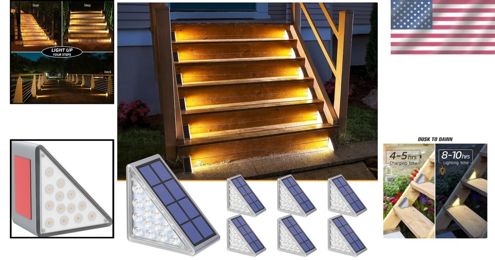 1. These solar step lights are a game-changer for outdoor lighting! The sleek triangular design adds a modern touch while providing bright, reliable illumination. Super easy to install—no wiring needed—and they charge quickly in sunlight. The waterproof build holds up great in any weather. Perfect for stairs, pathways, or garden decor. Love how they automatically turn on at dusk! Highly recommend for both style and function.