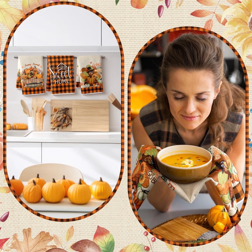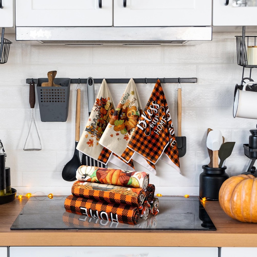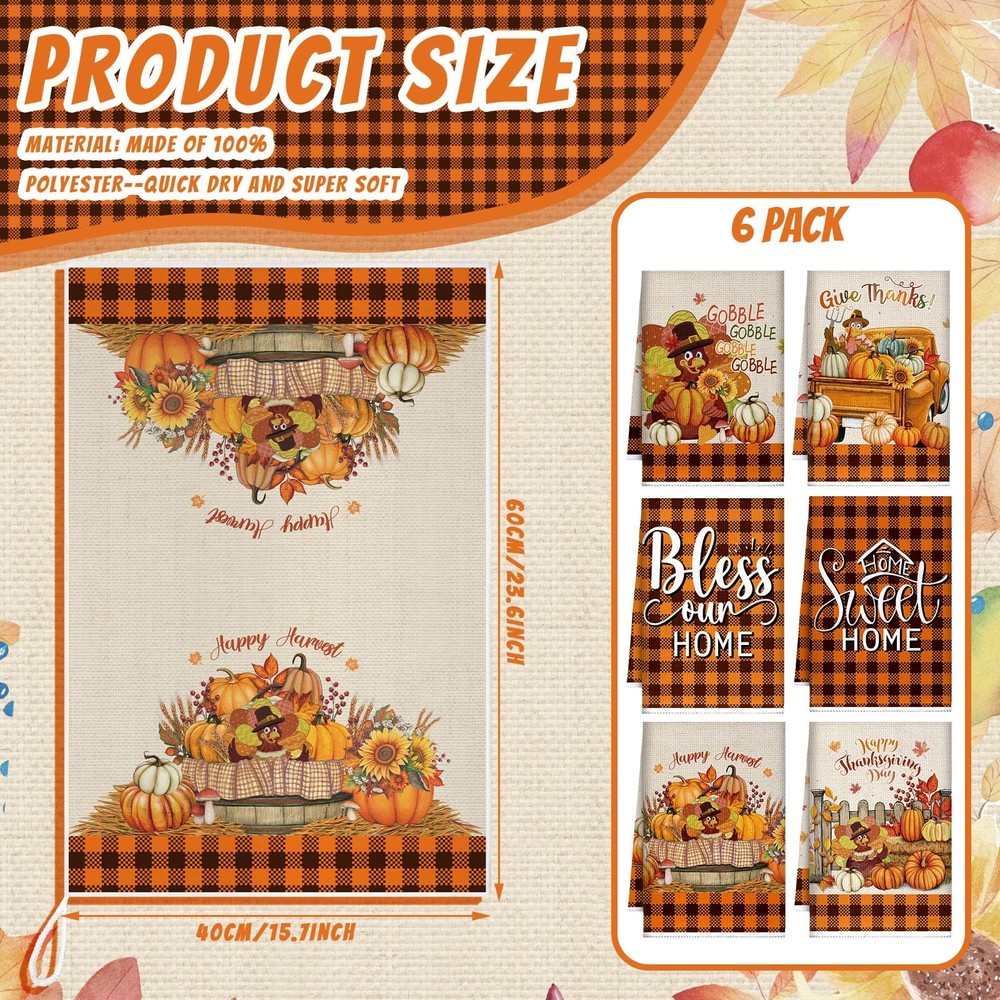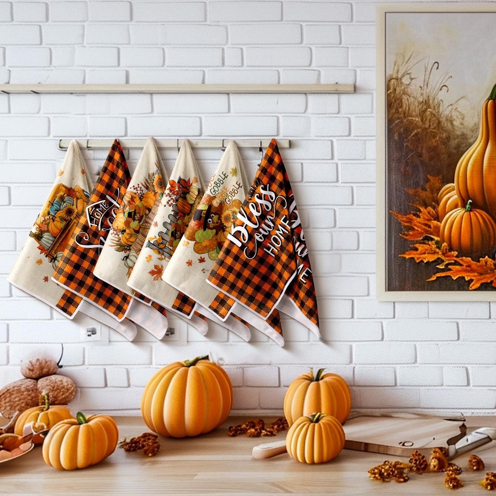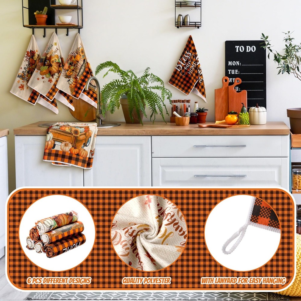 Features: Multifunctional kitchen towels: These fall kitchen towels can wash dishes or clean countertops, tables, windows, and be applied as farm fall kitchen decorations. They are proper for daily hand drying, wrapping delicate items. You can also keep them hanging in your kitchen, that ideal size to be hot pads or cloth napkins Ideal kitchen decor: Add talent to your kitchen decor with fall mode colorful kitchen dish towels. Proper for all of your daily drying and cleaning kitchen jobs Specifications: Material: microfiber Color: mainly black white and yellow Size: about 15.75 x 23.62 inches/ 40 x 60 cm Package includes: 6 x Kitchen towels Notes: Manual measurement, please allow slight errors on size. The color may exist a slight difference due to different screen displays Generous 6 Pack Value Set: this complete set includes 6 pcs coordinating kitchen towels, providing lasting utility for daily kitchen tasks; Rotate between uses while maintaining a cohesive autumn aesthetic throughout your cooking space; Ideal solution for busy households needing accessible kitchen towels near sinks ovens or serving areas, autumn themed elements on each towel help create a warm seasonal atmosphere in the home Seasonal Buffalo Plaid Floral Fusion: showcasing a curated blend of buffalo check and botanical motifs including turkey pumpkins and fall atmosphere; These towels elevate kitchen decor while performing cleaning tasks; Reversible printing ensures pattern visibility during hanging use with integrated hanging loop for convenient storage Ideal Size: each fall hand towel measures approximately 15.75 x 23.62 inches/ 40 x 60 cm; Balancing generous coverage with practical handling Fits standard towel racks while providing adequate surface for drying dishes or covering bread dough; More practical compared to basic size models for improved functionality Quality Material: our fall tea towels for kitchen are crafted from quality microfiber; This quality material ensures a soft and comfortable usage experience, simultaneously providing lightweight and practical durability; These reliable towels are not just for a season, but are designed to be your long lasting companion in the kitchen Autumn Entertaining Essential: in addition to being practical, these kitchen towels are a stylish addition to your kitchen; Coordinate with thanksgiving table settings as napkin alternatives or display folded on harvest themed charcuterie boards; Suitable as hostess gifts for fall gatherings housewarming presents or seasonal home staging accents