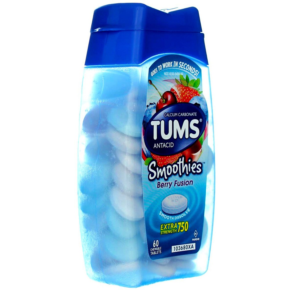 Product Description When you have heartburn, TUMS Smoothies Extra Strength Berry Fusion chewable antacids have extra strength relief that’s so smooth, it’s fast. Don’t let heartburn keep you from enjoying all of your favorite foods! TUMS antacid tablets relieve heartburn, sour stomach, acid indigestion, and upset stomach associated with these symptoms, so you can have it all, without the worry. Many other heartburn medications are absorbed into the bloodstream and can take hours or days to fully work. TUMS heartburn medicine goes to work in seconds, traveling directly to the source of the heartburn. Once there, it neutralizes acid on contact, so you get the fast heartburn relief you need, exactly when you need it. TUMS Smoothies Extra Strength Berry Fusion antacids deliver 50 percent more acid neutralizing power than TUMS Regular Strength antacid. Plus, they taste great too, giving you a deliciously smooth, berry fusion flavor. It’s no wonder TUMS heartburn medicine is America’s number one antacid! Try it today to join the millions of people who have successfully treated their heartburn with TUMS antacid. Fast, effective relief is here! Ingredients Adipic acid, corn starch, dextrose, FD&C blue #1 lake, FD&C red #40 lake, flavors, guar gum, magnesium stearate, maltodextrin, microcrystalline cellulose, sorbitol, sucrose? Contains: soy. Instructions Adults and children 12 years of age and over: chew 2-4 tablets as symptoms occur, or as directed by a doctor. Do not take for symptoms that persist for more than 2 weeks unless advised by a doctor. Other information: Each tablet contains: elemental calcium 300mg. Store below 25 degrees C (77 degrees F). Keep the container tightly closed. Product Description When you have heartburn, TUMS Smoothies Extra Strength Berry Fusion chewable antacids have extra strength relief that‚Äôs so smooth, it‚Äôs fast. Don‚Äôt let heartburn keep you from enjoying all of your favorite foods! TUMS antacid tablets relieve heartburn, sour stomach, acid indigestion, and upset stomach associated with these symptoms, so you can have it all, without the worry. Many other heartburn medications are absorbed into the bloodstream and can take hours or days to fully work. TUMS heartburn medicine goes to work in seconds, traveling directly to the source of the heartburn. Once there, it neutralizes acid on contact, so you get the fast heartburn relief you need, exactly when you need it. TUMS Smoothies Extra Strength Berry Fusion antacids deliver 50 percent more acid neutralizing power than TUMS Regular Strength antacid. Plus, they taste great too, giving you a deliciously smooth, berry fusion flavor. It‚Äôs no wonder TUMS heartburn medicine is America‚Äôs number one antacid! Try it today to join the millions of people who have successfully treated their heartburn with TUMS antacid. Fast, effective relief is here! Ingredients Adipic acid, corn starch, dextrose, FD&C blue #1 lake, FD&C red #40 lake, flavors, guar gum, magnesium stearate, maltodextrin, microcrystalline cellulose, sorbitol, sucrose? Contains: soy. Instructions Adults and children 12 years of age and over: chew 2-4 tablets as symptoms occur, or as directed by a doctor. Do not take for symptoms that persist for more than 2 weeks unless advised by a doctor. Other information: Each tablet contains: elemental calcium 300mg. Store below 25 degrees C (77 degrees F). Keep the container tightly closed. Warnings Safety Warning: Ask a doctor or pharmacist before use if you are presently taking a prescription drug. Antacids may interact with certain prescription drugs. When using this product. Do not take more than 10 tablets in 24 hours. If pregnant do not take more than 6 tablets in 24 hours. Do not use the maximum dosage for more than 2 weeks except under the advice and supervision of a doctor. Keep out of reach of children. Contains: soy. Safety sealed - do not use if printed inner seal beneath cap is missing or broken. Disclaimer The product descriptions and instructions provided by vitabox.com are for informational purposes only and are qualified in their entirety by the information available from manufacturers of the products. You should carefully read all product packaging, and contact the manufacturer with any questions before using a product. While we endeavor to ensure that product descriptions are current, manufacturers sometimes change their products. We are not liable for inaccuracies or misstatements about products. We do not provide medical advice or recommendations. You should not use the information provided by vitabox.com for diagnosing or treating a health problem or disease. If you have or suspect that you have a medical problem, immediately contact your health care provider. Information and statements regarding dietary supplements have not been evaluated by the Food and Drug Administration or any other government agency and are not intended to diagnose, treat, cure, or prevent any disease.