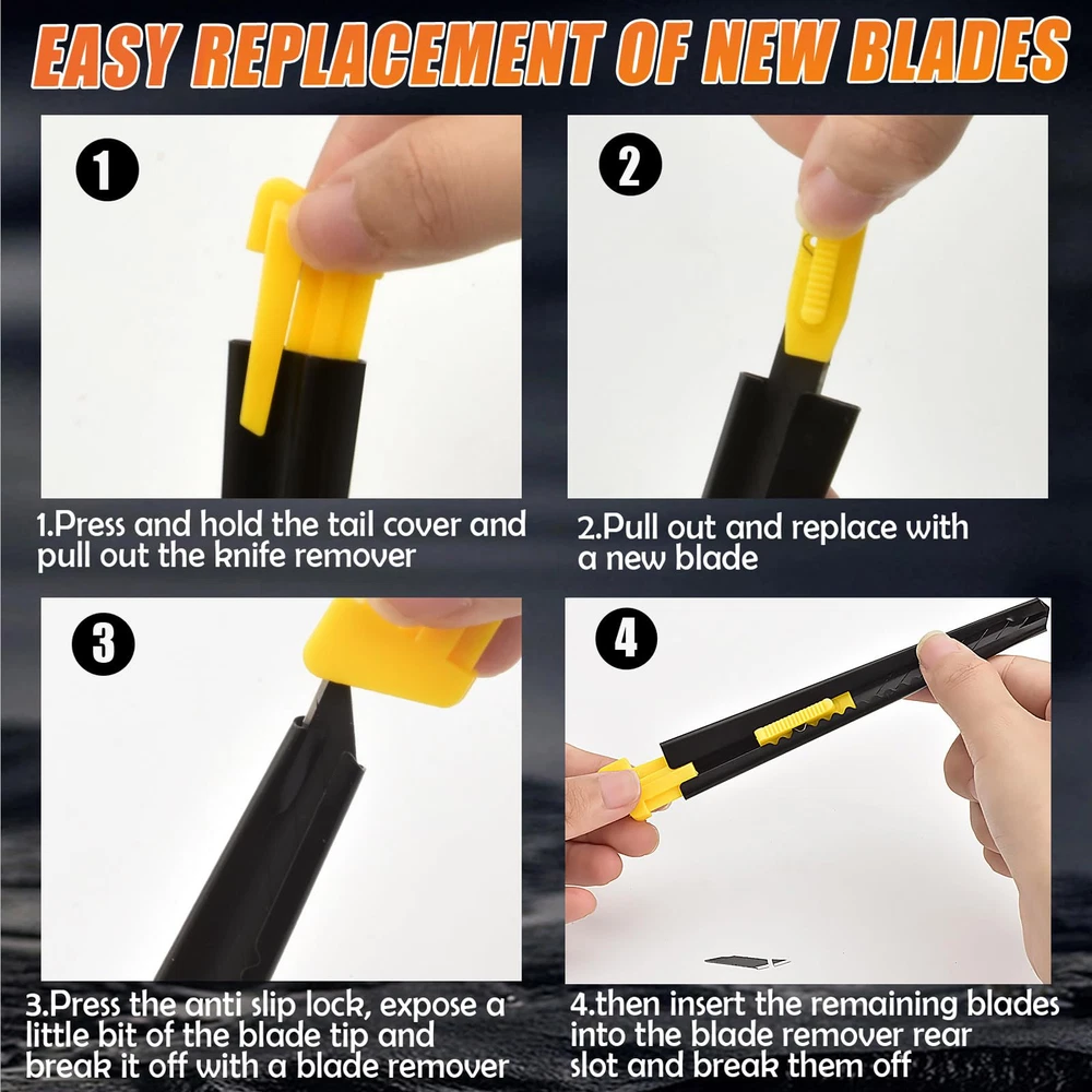 Upgrade Blade: The utility knife blade is made of high grade carbon steel, The upgraded blade angle has been designed with a larger bevel, which is better for cutting and also improves blade durability and cutting accuracy. The 9mm blade has 8 razor-sharp snap-off segments, and in addition, the black blade provides additional corrosion resistance over the regular blade, which extends the life of the blade. Upgrade Metal Handle: The box knife handle is made of metal casing material and thickened, Provides a comfortable feel and grip for stability and comfort when using the box cutter, as well as some protection from damage or loss of the internal blade. Box Cutter Retractable: The retractable design is easy to use and store, you can press the slide to control the retraction of the blade, and the locking function allows you to operate even with one hand, making your work easier. Multipurpose Tool: Utility knife retractable can be used for cardboard, foam board, paper, plastic, box, tape, crafts, vinyl, leather, PVC materials, etc. Practicality making it an home office essentials too, Can also be used as a spare utility knife in the garage Package Contains: You will receive 6 sets of utility knives retractable, Box packaging makes storage more convenient.