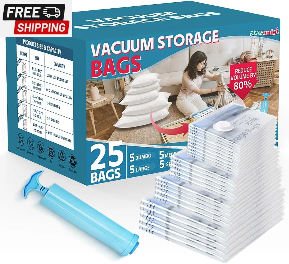 6 Pack Vacuum Storage Bags, Vacuum Seal Bags for Clothing, Comforters, Blankets, Space Saver Compression Bags with Hand Pump. (2×Jumbo, 2×Large, 2×Medium) Vacuum Seal Storage Bags: Variety sizes space saver vacuum storage bags for multiple sizes of items including clothes, comforters, pillows, and bedding. Volume reduction of 80%. Hand Pump Included for Easy Use: Works with a standard vacuum cleaner. Put the items in our storage vacuum bag, seal the zipper, suck out the air, and close the lid. 1 hand pump is included in the combo, which can be used during your trips. PA & PE: The compression bag is made of extra thick PA+PE, With a triple-seal turbo valve & double zipper seal design. Don’t worry about the long-term effects of storage in compression bags. Multi-use: Our vacuum storage bags are essentials for saving household space and organizing travel. It functions as a storage bag for clothes, comforters, and blankets. Package Included: 2×Jumbo(39.37” X27.5”); 2×Large: (31.5” X 26.65”); 2×Medium: (27.56” X 19.68”); 1×Hand Pump. Product Description Our vacuum storage bags combination is a must-have for you to save storage space! The compression bag is made of PA+PE material, which is highly flexible, durable, not easy to leak, and can be reused. Use our space-saver bags and store away various items including clothes, bedding clothes, blankets, pillows, plush toys, and more. What's more: you can use our compression bags to reduce larger and fluffier items such as vests and winter coats to minimal sizes with ease giving your clothing full protection and keeping your outfit dry. The package has vacuum storage bags of different sizes, suitable for various purposes: storage, travel, camping, moving, etc. 6 Pack Includes 2× Jumbo: 39.37” X 31.5”(100cm X 80cm) 2× Large: 31.5” X 23.65”(80cm X 60cm) 2× Medium: 27.56”X 19.68”(70cm X 50cm) 1× Hand Pump How To Use a Vacuum Storage Bag: PACK: Put the items inside our vacuum storage bag SEAL: Zip along the dual-zip 2-3 times and ensure the zipper is fully sealed VACUUM: Suck all the air out with a vacuum cleaner/hand pump included STORE: Close and secure the valve cap Usage Tips : Dehydrate all items before putting them away and storing them in vacuum bags. Avoid over-stuffing beyond the max volume line, use multiple bags instead. Double-check the zippers for full closure, and avoid stuff with sharp corners. Check leaking holes if there is a "hiss" sound, sticky tape should fix this problem. Re-vacuum the bags every 3-4 months for long-term storage. Vacuum storage is not suitable for down fibers and leather items. Shipping Fast shipping is very important for us. Our standard US shipping service is FREE. Your order will be shipped within 2-3 business days upon full payment received. Your order will be delivered within 2-3 business days after the handling time. We only ship to the confirmed PayPal address. We reserve the right to cancel any order for any reason at any time. We are not responsible for undeliverable addresses. Returns and payment We offer a 30 days return policy from checkout winning date. We allow only PayPal as payment method FeedBack Your feedback very important to us, after you get your package and you are satisfied with our service please leave us positive feedback If you have any problem with your order / any questions please before leave any type of feedback For any questions, using eBay contact system Please visit our eBay store to check out other items for sale! Thank you for shopping at our store.