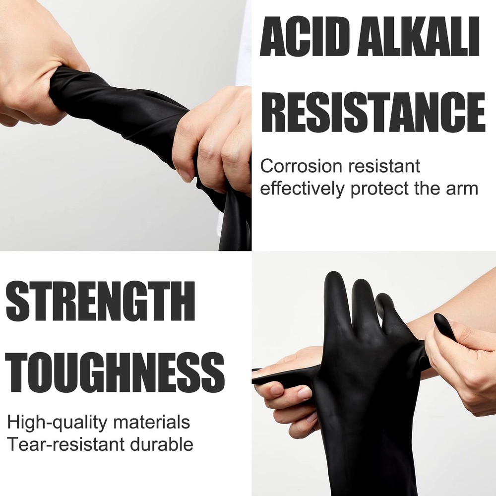 Features: Easy to clean: These reusable cleaning gloves are smooth on surface, which are easy for you to clean, just rinse with water, then air dry for next use, simple and convenient. Wide uses: The thick rubber gloves are suitable for washing dishes, pool cleaning, furniture renovation, yard working, car washing, home cleaning, and so on. They are also nice and practical gifts for family members, colleagues, friends and neighbors. Specifications: Material: latex Color: black Size: 14 x 4.5 inches Package includes: 6 Pairs of heavy duty latex gloves Notes: Manual measurement, please allow slight errors on size. The color may exist slight difference due to different screen displays. Ample Quantity: the package includes 6 pairs of chemical resistant gloves, which are resistant to acid, oil and alkali, keeping your hands from injuries and keeping hands dry and clean; Sufficient quantity is enough to satisfy your daily use and needs Proper Size: these reusable rubber gloves are measured about 14 x 4.5 inches, a suitable size to fit most hands, adopting with rolled edge design, so that the chemical gloves can be fixed in place and not easy to slide, providing much convenience for you when working Reliable Quality: these heavy duty cleaning gloves are made of quality latex material, which is chemical resistance and tear resistance, waterproof and reusable, elastic and tough, skin friendly and easy to put on and take off, and there will be no discomfort after wearing chemical gloves for a long time Practical Functions: these heavy duty dishwashing gloves feature with nice acid base barrier properties to protect your hands and forearms from dangerous liquids or other items, ideal thickness for good safety protection, and smooth surface offering you comfortable tactile and flexible grip Wide Applications: these rubber gloves heavy duty can be applied for car washing, home cleaning, machinery maintenance, yard work, gardening, agriculture, industry, construction, etc., bringing you a wonderful wearing and using experience
