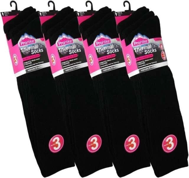 Pattern: Plain Country/Region of Manufacture: Unknown Number in Pack: 3 Pairs Character: Long Hose Socks Occasion: Everyday Handmade: No Material: 80% acrylic, 20% polyester Season: Winter Opacity: Opaque Features: Thermal Style: Thermal Socks Theme: Plain Department: Women Performance/Activity: Outdoors Sock Length: Knee High Brand: ProHike Type: Socks Personalise: No Toe Style: Full Toe Colour: Black Size: 4-8 Character Family: Long Hose