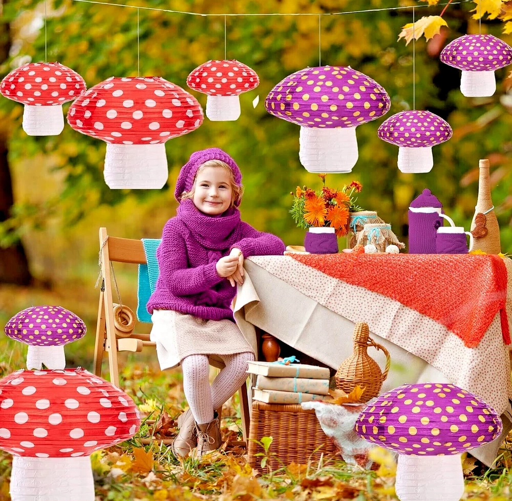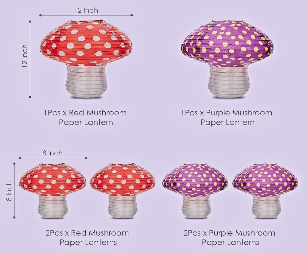 6 Pc. Red & Purple Mushroom Paper Lantern Party Decor Large Wonderland Jungle Themed 3D Mushroom Hanging Ornaments for Nursery, Garden, Halloween, Birthday Party, or Baby Shower. 1x Red Mushroom Paper Lantern, Large 12 Inch 1x Purple Mushroom Paper Lantern, Large 12 Inch 2x Red Mushroom Paper Lanterns, Medium 8 Inch 2x Purple Mushroom Paper Lanterns, Medium 8 Inch New in Package.