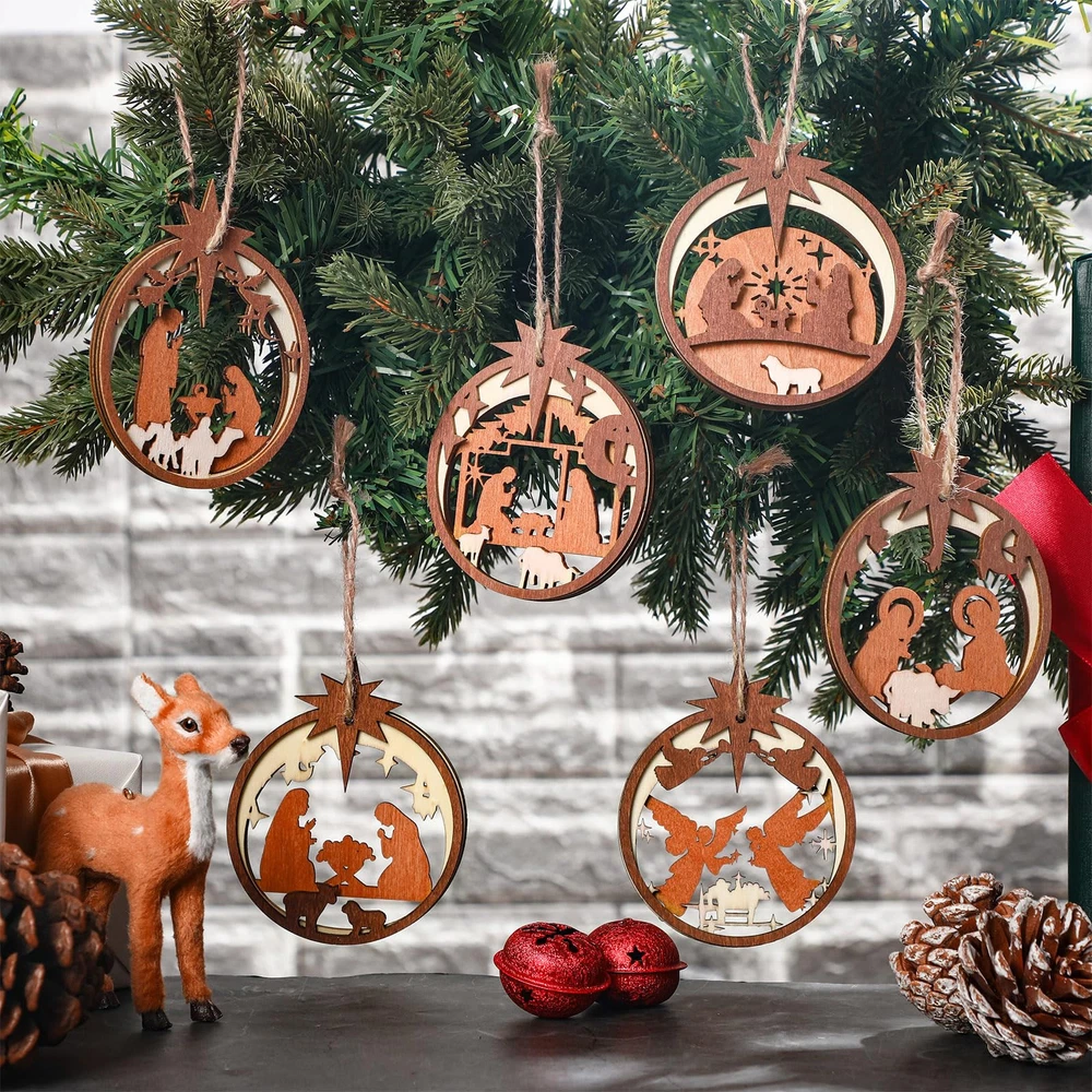 What You Will Receive: you will receive 6 pieces of wooden nativity ornaments; The scene of the birth of Jesus shows us the traditional story and is a stylish way to celebrate the birth of Jesus, and it is also a good way to worship him in our hearts Handmade Nativity Artwork: these Christian Christmas ornaments are hand carved of three layer nature basswood material, combined with high detailed laser cut process, which clearly show us the Christmas story and the birth of Jesus Easy to Hang: the birth of Jesus Christmas decorations are a nice complement to your family Christmas decoration with its classic theme; There is a hole in the top, so you can use the twine included in the package to hang it on the Christmas tree, wall, window or rearview mirror of the car Size Information: each religious ornament for Christmas tree measures approx. 4.7 x 4.3 inches, the right size makes them can be well hung on the Christmas tree; You can put them in the living room, bedroom, bedside, and other places where you want to hang and decorate 3D Christmas Decoration: this nativity scene ornament is always the ideal way to decorate your home in the coming Christmas, its 3D design will create a more vivid atmosphere for your Christmas tree, as well as its classic design