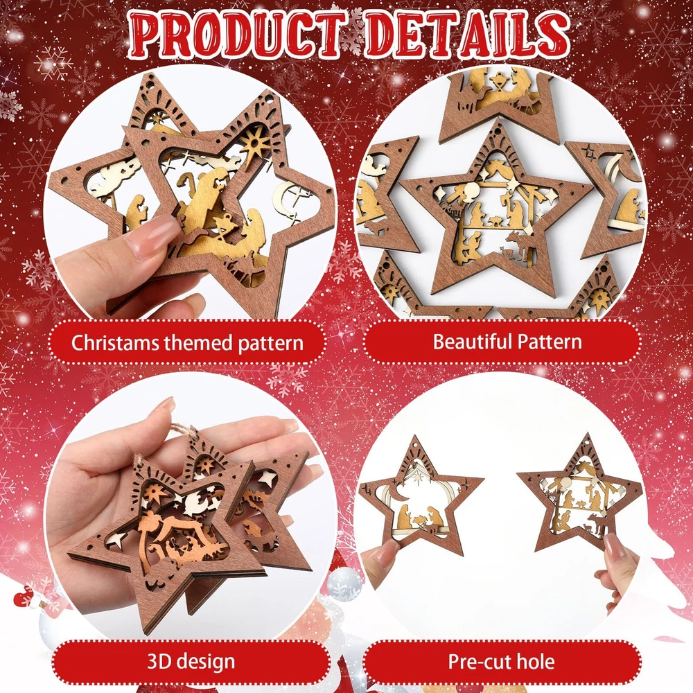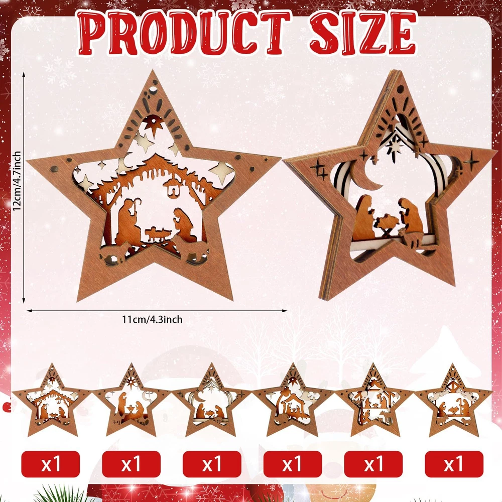 What You Will Receive: you will receive 6 pieces of wooden nativity ornaments; The scene of the birth of Jesus shows us the traditional story and is a stylish way to celebrate the birth of Jesus, and it is also a good way to worship him in our hearts Handmade Nativity Artwork: these Christian Christmas ornaments are hand carved of three layer nature basswood material, combined with high detailed laser cut process, which clearly show us the Christmas story and the birth of Jesus Easy to Hang: the birth of Jesus Christmas decorations are a nice complement to your family Christmas decoration with its classic theme; There is a hole in the top, so you can use the twine included in the package to hang it on the Christmas tree, wall, window or rearview mirror of the car Size Information: each religious ornament for Christmas tree measures approx. 4.7 x 4.3 inches, the right size makes them can be well hung on the Christmas tree; You can put them in the living room, bedroom, bedside, and other places where you want to hang and decorate 3D Christmas Decoration: this nativity scene ornament is always the ideal way to decorate your home in the coming Christmas, its 3D design will create a more vivid atmosphere for your Christmas tree, as well as its classic design