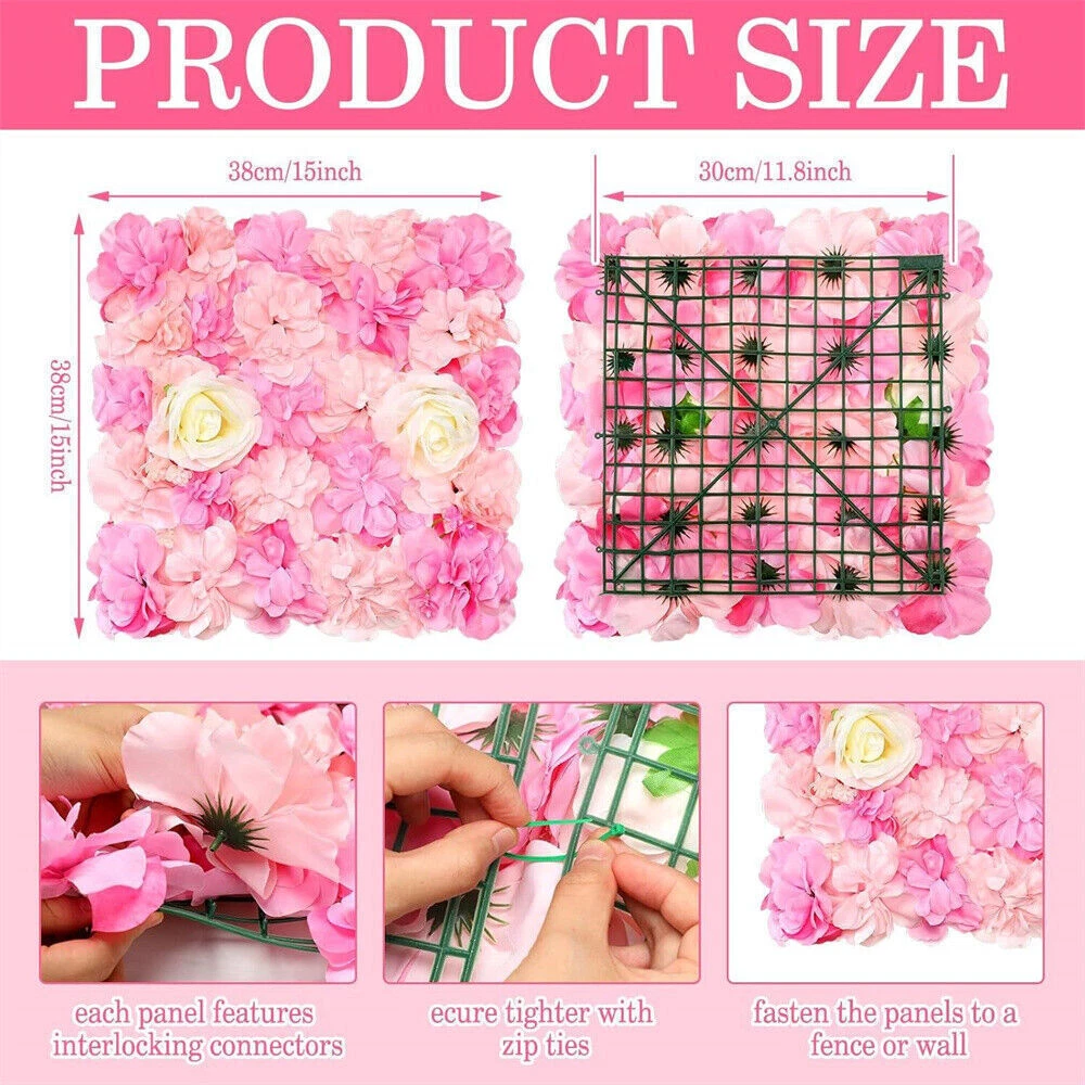 6X Flower Wall Panels 3D Silk Rose Faux Flower Wall Background for Wedding Decor About this item What You Will Receive: you will receive 6 pieces of flower wall panels, about 15 x 15 inches/ 38 x 38 cm, flower head fixed firmly, not easy to fall off and last longer, flowers full and clean, never fade Easy to Use: the back of rose mat is a flexible plastic mesh frame, easy to use, and you can fasten the flowers together by tying straps, ropes and more, or hang them on hooks or nails, bringing you good use experiences Reliable Material: the panel set is made of silk, bright in colors and elegant in outlook, sturdy to use, not easy to tear, fade or deform, meeting the decorative needs of 4 seasons, so you can use it for a long time Safe to Use: with high density flowers, the flower panel can make you invisible to others is a way in order to protect your privacy; You can set it as a background for birthday and party photos or take photos Wide Application: the floral panels for backdrop have a wide range of application, suitable for weddings, parties, birthdays, yards, porches, doors, fences, outdoor activities, decorations, churches, photographs and more.