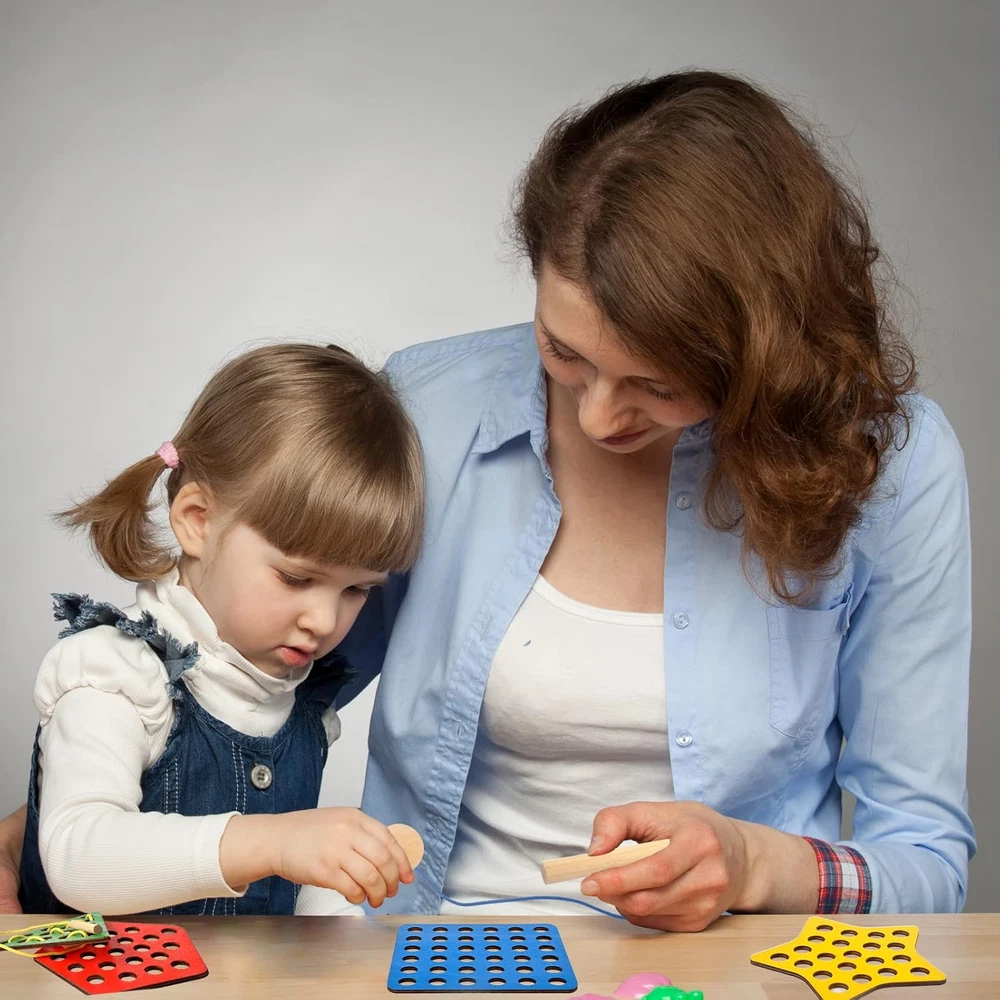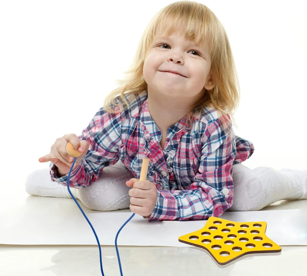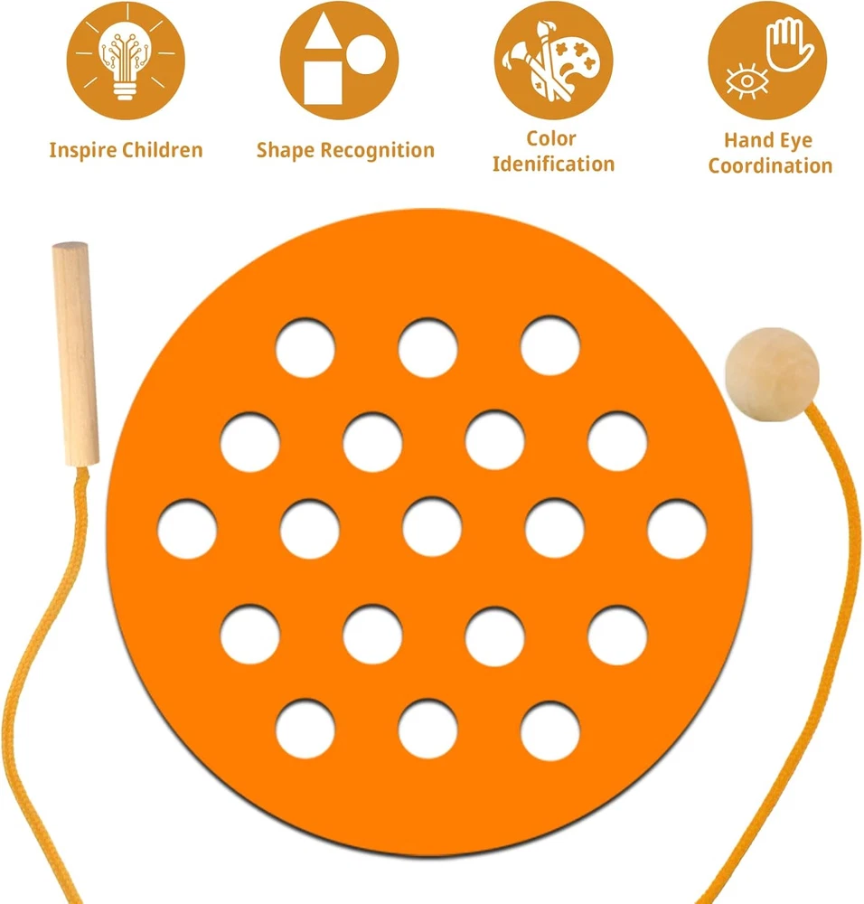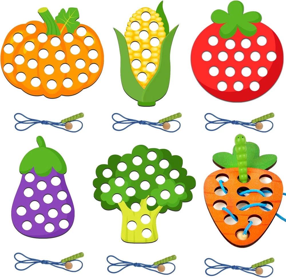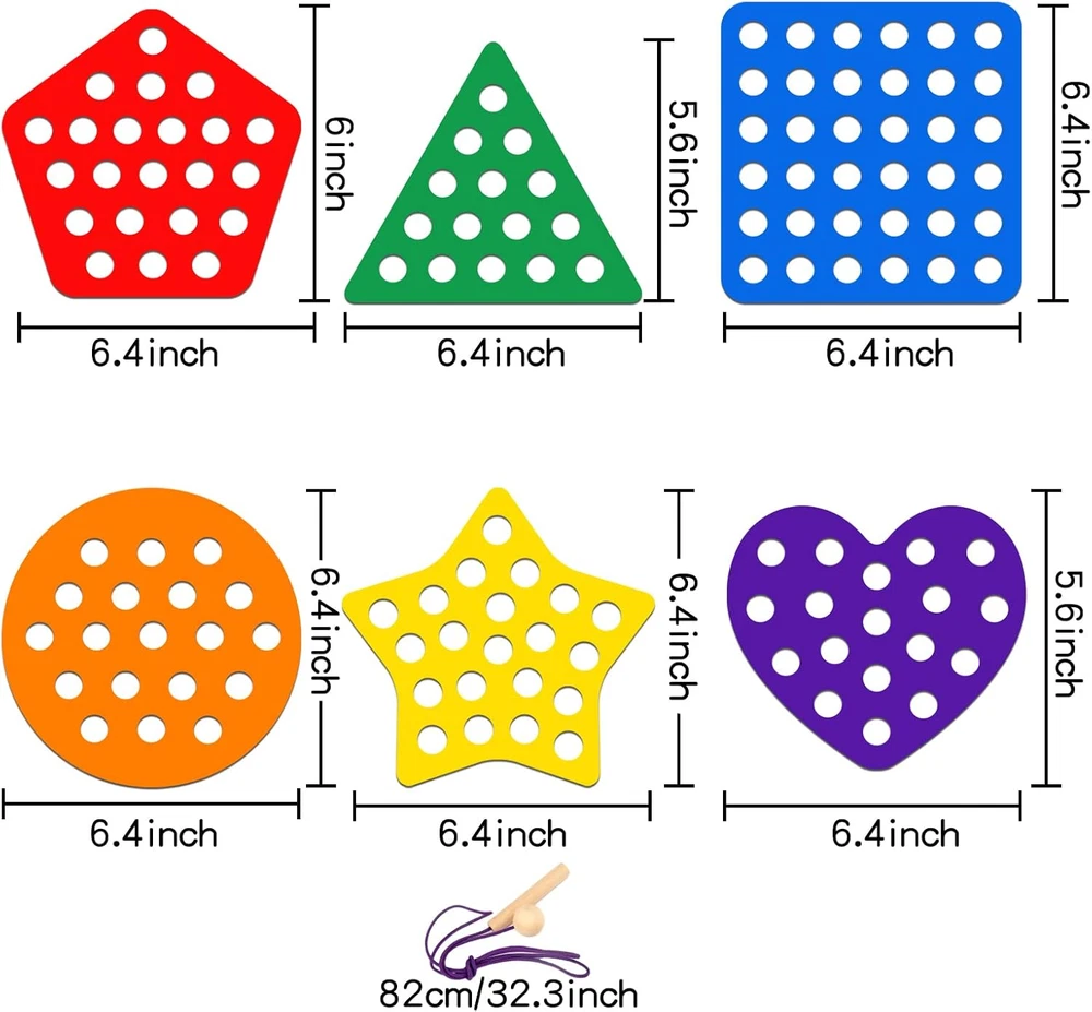 ❤【WOODEN LACING FRUIT TOYS】The lacing toy set includes 6 lacing ropes and 6 different sliced shapes: star, square, heart, circular, triangle, pentagon. These wooden threading toys help to develop kid's imagination, hand-eye coordination, fine motor, cognitive and visual perception skills ♦【EDUCATIONAL MONTESSORI TOYS】These threading toddler toys reference Montessori teaching activities, guide children develop strong essential skills and encourage them independence, such as shoe tying, zippering and buttoning ⭐【TODDLER TRAVEL TOYS】These travel toys are perfect for toddler airplane activities and road trip activities for kids, not only in planes and cars, but even restaurants and schools. Children focus on playing with rope toys to eliminate boredom and irritability from traveling 🔺【ATTRACTIVE DESIGN】A cute wooden caterpillar and log are attached to each end of the lacing rope, the caterpillar is used to thread the rope, and the log is used to stuck the hole of the wooden toys. When children thread the string through the holes of the geometric wooden threading toys, it looks like the caterpillar is "eating" the wood ⚪【SAFETY MATERIAL & DURABLE】 These lacing toys for kids 3-6, made of durable wood, lead-free, BPA-free, and no chemical smell. Suitable size easy for small hands to hold and play, it is also large enough to prevent accidental swallow. Perfect gift for Birthdays, Easter, Children's Day WARM FAMILY TIME Enjoy warm family time while everybody interacting together, playing children's wooden toys. To build a colorful childhood for your kids. GIFT TOYS FOR KIDS This lacing toy set is a great gift for kids, it can bring classic endlessly fun for toddlers, also can keeps children busy for hours. TRAVEL TOYS ACCOMPANY This is a great star & square & heart & circular & triangle & pentagon lacing toy for toddler, perfect size and portable carry around, kids can enjoy the happiness of wooden toys accompany during the trip and adults can feel more comfortable. Package: 1 x star slice (6.4 x 6.4 x 0.2 in) 1 x square slice (6.4 x 6.4 x 0.2 in) 1 x heart slice (6.4 x 5.6 x 0.2 in) 1 x circular slice (6.4 x 6.4 x 0.2 in) 1 x triangle slice (6.4 x 5.6 x 0.2 in) 1 x pentagon slice (6.4 x 6.4x 0.2 in) 6 x lacing rope with caterpillar (30.5 x 0.8 x 0.8 in) Material: Wood & Nylon Color: As picture shown