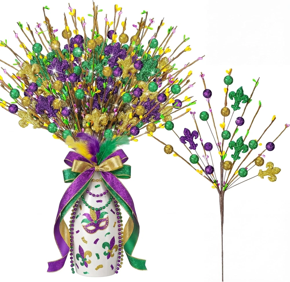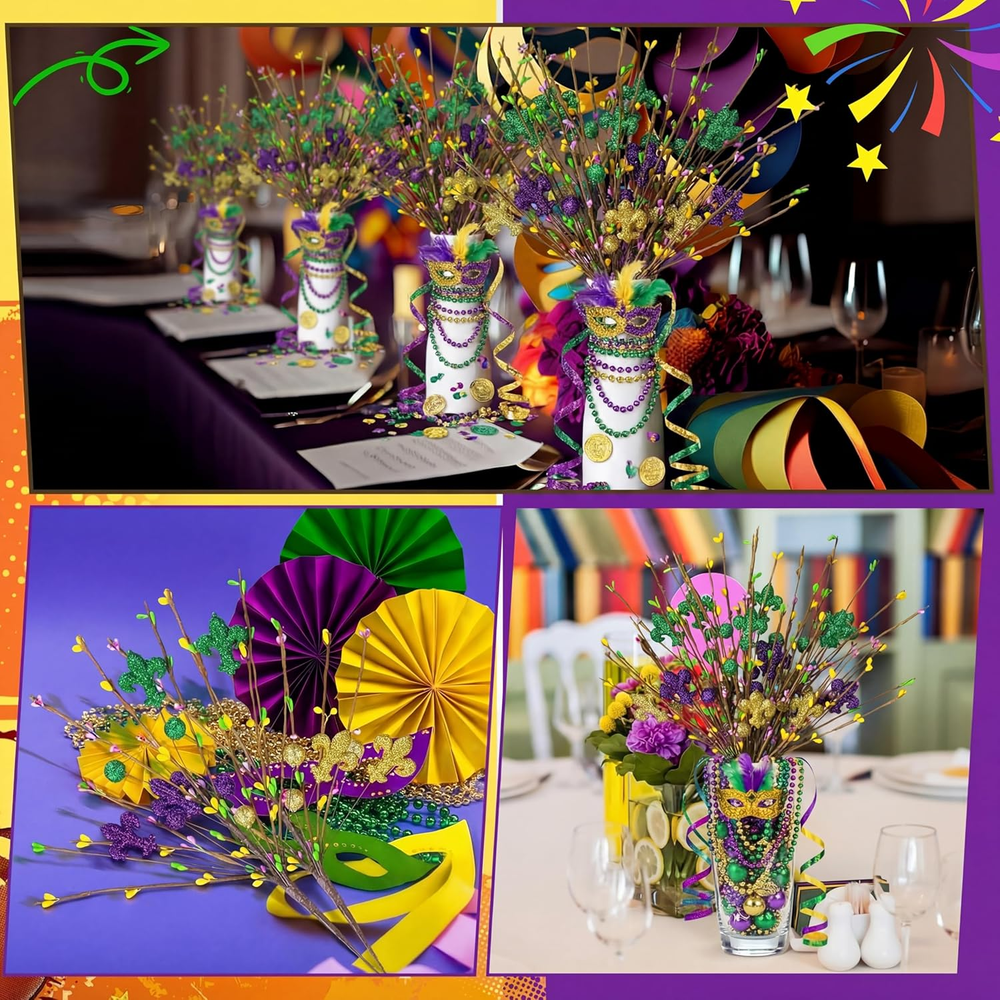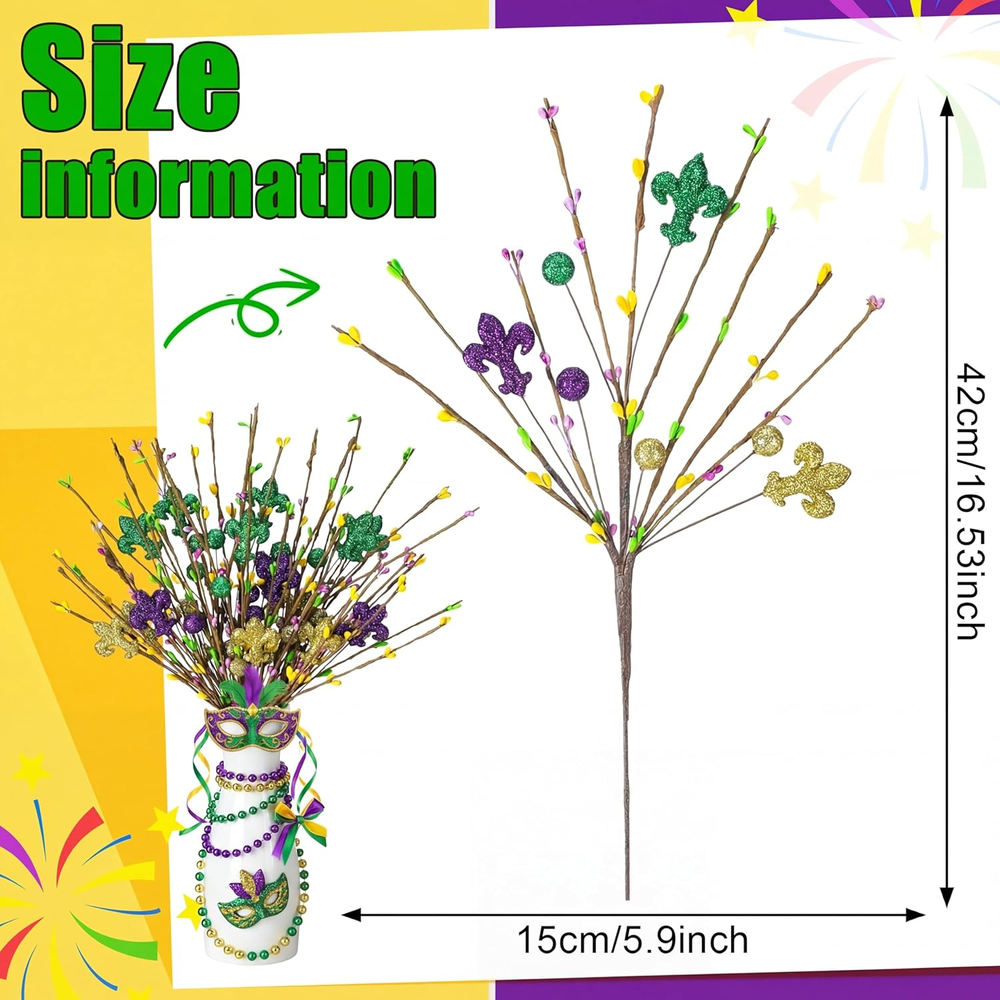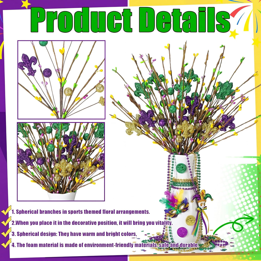 6 Pcs Mardi Gras Centerpiece Table Decor 16.5" Mardi Gras Glitter Table Picks Meet Your Party Decoration Needs: you will receive 6 Mardi Gras glitter table picks, each featuring a gold, green, and purple color scheme and various Mardi Gras elements; The vibrant decorative effect and ample quantity will easily satisfy all your Mardi Gras party decoration needs Ideal Size: the Mardi Gras centerpiece table decor measures approximately 16.5 inches long, making it the ideal size for vase decoration; You can also cut or bend the stem to adjust the length for optimal display Made of Materials: Mardi Gras centerpiece sticks are made of plastic stems and foam balls, and are covered in beautiful glitter; They're lightweight yet durable, offering reliable performance and reusability, creating a warm and festive atmosphere in any room for years to come Inspiring Creativity: these Mardi Gras purple, gold, and green tree topper picks are a versatile addition to your Mardi Gras decor; Whether use in flower arrangements, table centerpieces, or placed on a mantel, their dazzling shimmering effect will enhance any occasion Versatile Applications: crafted with materials, these Mardi Gras flower branches are suitable for a variety of crafting ideas; Use them to fill vases, create attractive flower arrangements, and create wreaths and garlands; They're also ideal for display or party venues, adding a touch of sparkle to any Mardi Gras celebration centerpiece, mantel, or doorway Features: Ideal for both holidays and everyday occasions: Our Mardi Gras branches tree decoration is suitable for holiday occasions like Mardi Gras, but it also works well in everyday home decor. Use it in a vase to enhance any space, as part of a holiday themed decoration, or combine it with other craft projects to add a charming touch to any holiday or event. Highly compatible with decorations: Measuring approximately 16.5 inches, this Mardi Gras branches tree decoration is adaptable to a variety of decorating needs, making it large enough to stand out in any space. Its classic design of irises and berries makes it easily integrated into a variety of Mardi Gras decor styles, enhancing the overall coordination and beauty of your overall decor. Specifications: Material: plastic and foam balls Color: purple, gold, and green Size: about 16.5 inches/ 42 cm Package includes: 6 x Mardi Gras tree topper picks Notes: Manual measurement, please allow slight errors on size. The color may exist a slight difference due to different screen displays Item model number LAY--4252 Item Package Quantity 6 Number of Items 6 Color Purple, Gold, and Green Item Weight 9.6 ounces Package Information Vase Product Dimensions 16.85"D x 3.15"W x 3.15"H Complimentary Shipping and Easy Returns Need to return something? Enjoy our 30-day hassle-free return policy! Take advantage of free shipping across all 48 contiguous states! Your order will be dispatched within 1-2 business days once payment is confirmed. Your Opinion Matters! Your happiness is our main goal! We welcome your feedback! If you encounter any problems, reach out to us right away, and we’ll be here to help. Explore the Extraordinary! Our collection showcases fascinating products that are sure to capture your attention. What surprises await you? Delve in and discover unique items that enrich your daily life. Don't miss the amazing things we have in store for you!