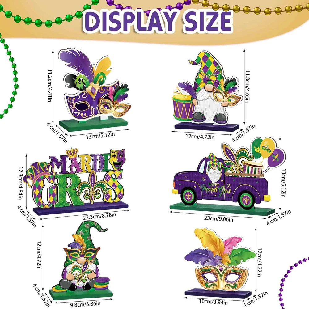 Store New Arrivals Add to Favorite View Feedback Contact Fast deliveries to the customer's home Quality customer service John Make the customers happy! 6 Pcs Mardi Gras Table Decorations Mardi Gras Wooden Table Centerpieces Masquerade Party Fleur De Lis Mask Gnome Truck Signs for Dinner Table Carnival New Orleans Style Party Decor Description Mardi Gras Wooden Decor: you will receive a set of 6 Mardi Gras table decorations, each is designed and marked with Mardi Gras themed words and patterns, the beautiful and vibrant color matching makes the Mardi Gras centerpieces truly reflect the festive atmosphere of Mardi Gras, these decorations are ready to liven up your party instantly Thoughtful Gifts for Festive Celebrations: these masquerade party decorations serve as a delightful present choice, the holiday related engravings can easily convey your heartfelt wishes and blessings, whether for friends or family members, they will certainly appreciate this charming Mardi Gras table decor and feel your love and care Quality Material: these Mardi Gras centerpieces are made of wood, ensuring their safety and longevity, each table sign set on a sturdy wooden base that offers stability when placed on the tabletop; Please note the slot of the wooden base may be a little tight, and you can push the wooden topper into slot Suitable Size: this Mardi Gras gnome sign comes in 2 pieces, measuring about 4.72 x 4.65 inches and 3.86 x 4.72 inches; And the Mardi Gras eye mask decor comes in 2 pieces, measuring about 5.12 x 4.41 inches and 3.94 x 4.72 inches; Wooden Mardi Gras table sign is about 8.78 x 4.84 inches; The happy Mardi Gras truck sign is about 9.06 x 5.12 inches, and please check the size before purchasing Wide Application: these Mardi Gras centerpieces for table are suitable for a variety of occasions such as Mardi Gras, masquerade mask parties, engagement ceremonies and cosplay parties, they also serve as ideal background props for photos and videos; And you can place these Mardi Gras table centerpieces on desktop, shelf, or add them to the desk decor at your office, wherever they are, the Mardi Gras holiday atmosphere follows Product Description Item model number DI--2347 Style Modern Mounting Type Tabletop Batteries required No Product Dimensions 5.12"L x 9.06"W Country of Origin China Item Weight 0.29 Kilograms Included Components 6 x Mardi Gras wooden table centerpieces ABOUT US We offer the best prices around on high quality products. Our E-store includes media such as books, movies, music and games while offering electronics, toys, sporting apparel, clothing, tools, general home, garden items and more. SHIPPING We are always working hard to ensure your package arrives as soon as possible. Please understand that some factors like weather, high postal traffic, and the performance of shipping companies are outside of our control. We offer free shipping to the lower 48 states and ship within 2 business days of payment, usually sooner. We do not accept P.O. Boxes. Please provide a physical address. For shipping outside of the continental USA, we only use eBay's Global Shipping Program. The item is shipped to KY and then sent to the rest of the world. International customers are responsible for all duties and taxes. Continue to 'check out' to calculate costs for shipping the item to your country. Messages regarding eBay's Global Shipping Program MUST be directed at eBay EXCLUSIVELY. RETURNS We offer a 30-Day Return Policy on items in which you are not completely satisfied with. You have the option of a full-refund or an exchange of the item. No returns are available on items shipped outside of the USA PAYMENT We accept PayPal. CONTACT US This page content is yet to come Please ad us to your favorite seller and visit again later Thank You CUSTOMER SATISFACTION We try our very best to make sure every customer is completely satisfied. If there's a problem, message us! We're happy to help. WE ACCEPT