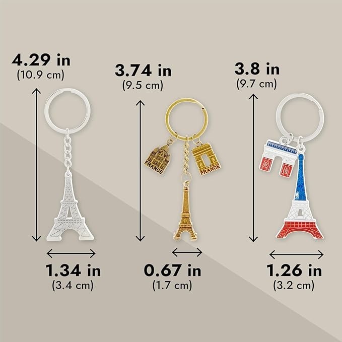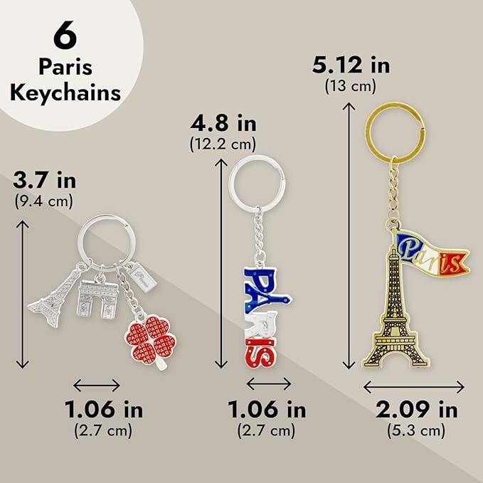 6 Pcs Paris Keychain France Souvenir Gifts Eiffel Tower French Flag Key Chains Style: Paris Paris Keychain Collection: Celebrate your love for Paris with these chic bag charms. Attach these keychains to your keys, bag, or backpack for a stylish touch. Each keychain features iconic Parisian designs like the Eiffel Tower and Arc de Triomphe Unique Paris Souvenirs: With 6 distinctive designs, these keychains serve as perfect Paris souvenirs from France. Share the allure of Paris with friends and family through these memorable mementos Stylish And Functional: Easily attach your keys to the ring, complemented by the elegant Eiffel Tower embellishments. The silver and bronze hues add a sophisticated flair to your belongings Compact And Convenient: The keyring has a 1-inch diameter, and each French keychain measures between 3.5 to 5 inches in length. Easily attach to keys, purses, fanny packs, or luggage Ideal Paris Gifts: These Paris key chains make wonderful travel gifts for any occasion. Delight your loved ones with a piece of Parisian charm that embodies the essence of France souvenirs Return Policy: We offer a 30 day return policy from the receiving date. Please contact us for a Free Return Label. Please use our return label so it will go back to our supplier and we can do a refund or replacement afterwards. Feedback: Your satisfaction is very important to us! If you have any problem with your order, please contact us and we will do our very best to make you satisfied. As long as you are happy with your purchase, please leave a positive feedback for us. We will always leave you a positive feedback in return. If you have any problem with your purchase, please do not leave a negative feedback. Please Contact us ... and your issue will be solved quickly and positively We are a small family-owned business trying to make a living, not a huge company that does not care ... We will ALWAYS do our best for you!
