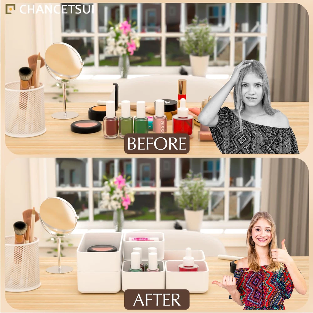 【6 Pcs Set 】 This multifunctional organising trays comes in a 6 pcs set. Package includes : 3.35 x 3.35 x 1.77'' (3 pcs), 3.35 x 6.6 x 1.77'' (3 pcs). You can flexibly use our storage organizer for house organization and storage according to your needs. 【Customize and Stackable】 Individual Plastic Storage Bins can be used to separate your messy drawer and fit all kinds of drawers, such as vanity, bathroom, kitchen, and office drawers. You can customize the layout of the drawer organizers to suit any specific needs. 【Sturdy and Durable】 The desk drawer organizer trays set are made of durable and environmental PET plastic, ensuring a long life of use. Drawer organizer bins are break-resistant and could accommodate different items keeping the organiser nice and steadily stacked. 【Stackable and Space Saving】 These storage bins fit any part of your home. Suitable for use in different drawers to keep your desktop neat and tidy. Offer a generous capacity for storing toiletries, hair accessories, cosmetics, medicine, toothpaste, office supplies, craft supplies, nail polish, jewelry, etc. 【Easy to Clean】These desk drawer storage bins are easy to be wiped clean with a damp cloth. It is very convenient to keep your desktop tidy and easy to find items in the drawer to save time. Making everything look beautiful and better organized.
