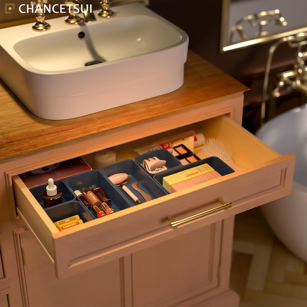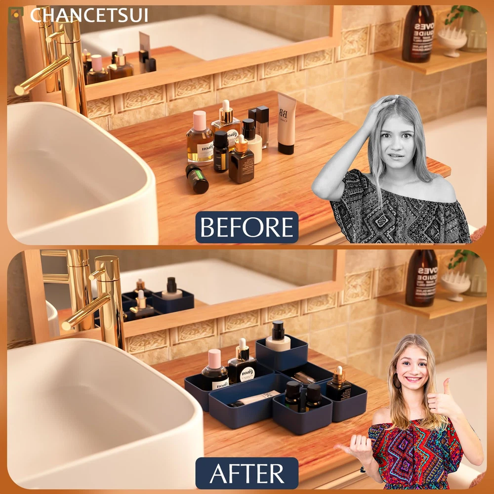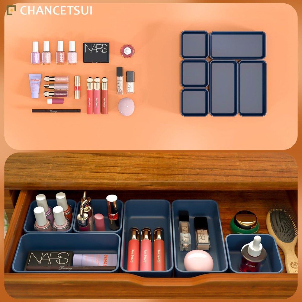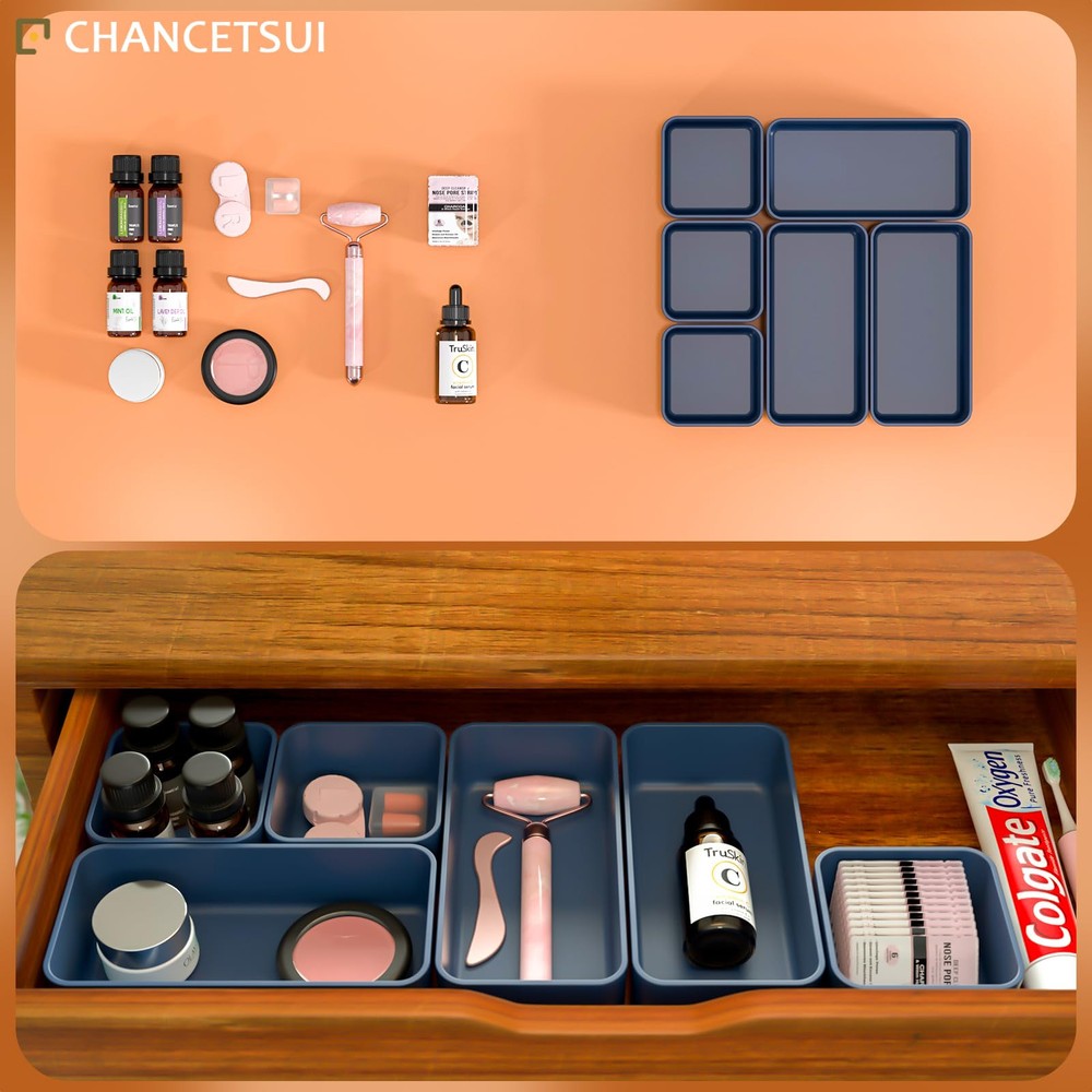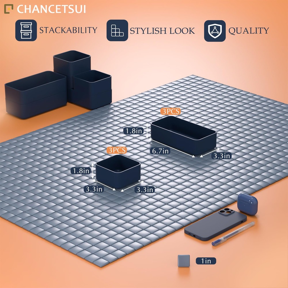 【6 Pcs Set 】This multifunctional organising trays comes in a 6 pcs set. Package includes : 3.35 x 3.35 x 1.77'' (3 pcs), 3.35 x 6.6 x 1.77'' (3 pcs). You can flexibly use our storage organizer for house organization and storage according to your needs. 【Customize and Stackable】 Individual Plastic Storage Bins can be used to separate your messy drawer and fit all kinds of drawers, such as vanity, bathroom, kitchen, and office drawers. You can customize the layout of the drawer organizers to suit any specific needs. 【Sturdy and Durable】 The desk drawer organizer trays set are made of durable and environmental PET plastic, ensuring a long life of use. Drawer organizer bins are break-resistant and could accommodate different items keeping the organiser nice and steadily stacked. 【Stackable and Space Saving】These storage bins fit any part of your home. Suitable for use in different drawers to keep your desktop neat and tidy. Offer a generous capacity for storing toiletries, hair accessories, cosmetics, medicine, toothpaste, office supplies, craft supplies, nail polish, jewelry, etc. 【Easy to Clean】These desk drawer storage bins are easy to be wiped clean with a damp cloth. It is very convenient to keep your desktop tidy and easy to find items in the drawer to save time. Making everything look beautiful and better organized.