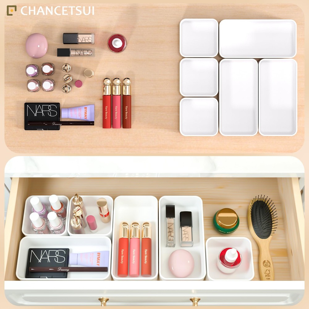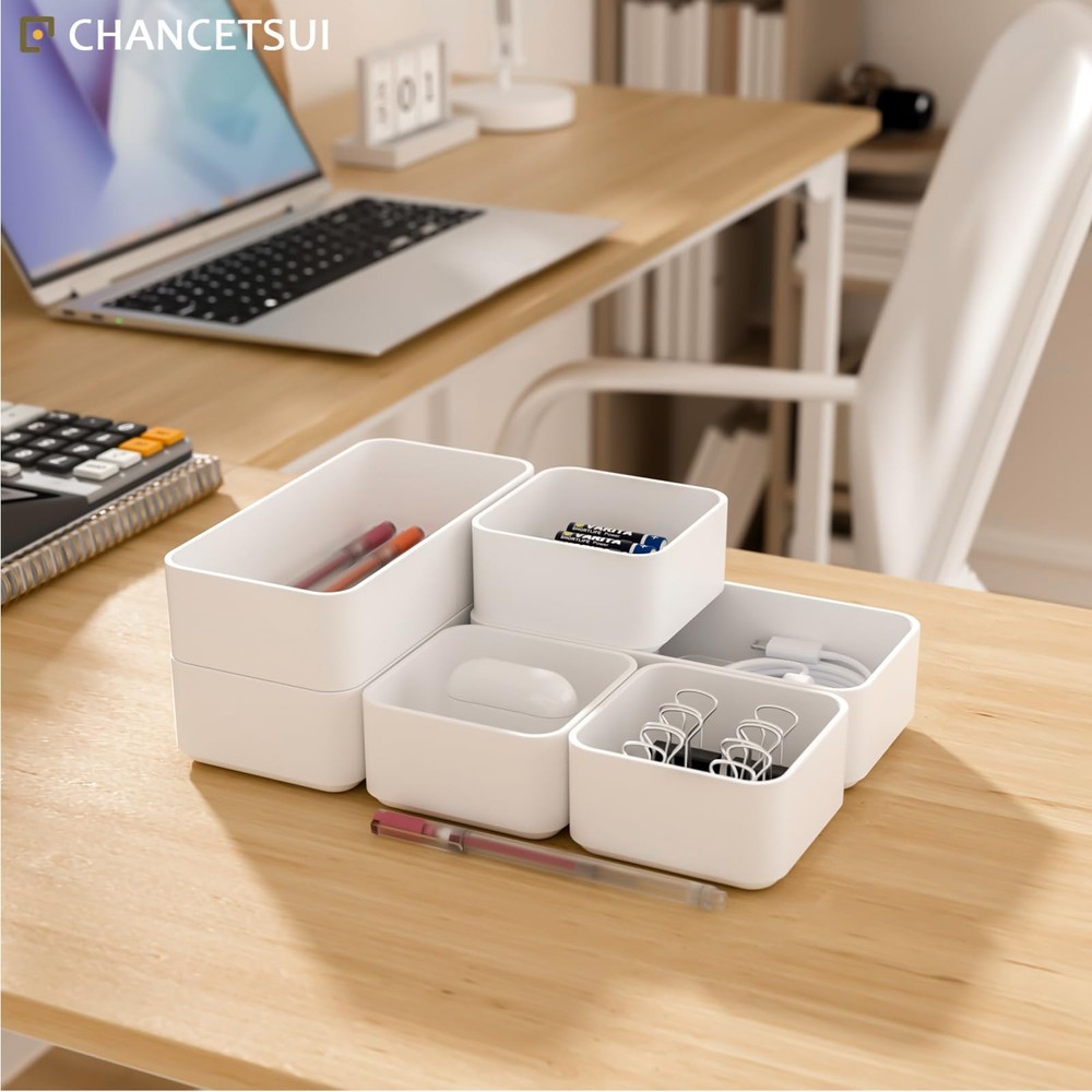 【6 Pcs Set 】 This multifunctional organising trays comes in a 6 pcs set. Package includes : 3.35 x 3.35 x 1.77'' (3 pcs), 3.35 x 6.6 x 1.77'' (3 pcs). You can flexibly use our storage organizer for house organization and storage according to your needs. 【Customize and Stackable】 Individual Plastic Storage Bins can be used to separate your messy drawer and fit all kinds of drawers, such as vanity, bathroom, kitchen, and office drawers. You can customize the layout of the drawer organizers to suit any specific needs. 【Sturdy and Durable】 The desk drawer organizer trays set are made of durable and environmental PET plastic, ensuring a long life of use. Drawer organizer bins are break-resistant and could accommodate different items keeping the organiser nice and steadily stacked. 【Stackable and Space Saving】 These storage bins fit any part of your home. Suitable for use in different drawers to keep your desktop neat and tidy. Offer a generous capacity for storing toiletries, hair accessories, cosmetics, medicine, toothpaste, office supplies, craft supplies, nail polish, jewelry, etc. 【Easy to Clean】These desk drawer storage bins are easy to be wiped clean with a damp cloth. It is very convenient to keep your desktop tidy and easy to find items in the drawer to save time. Making everything look beautiful and better organized.
