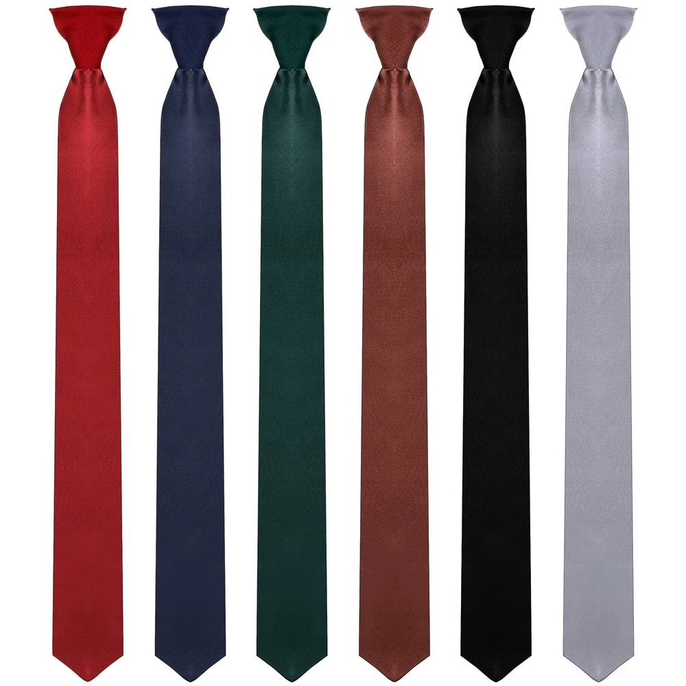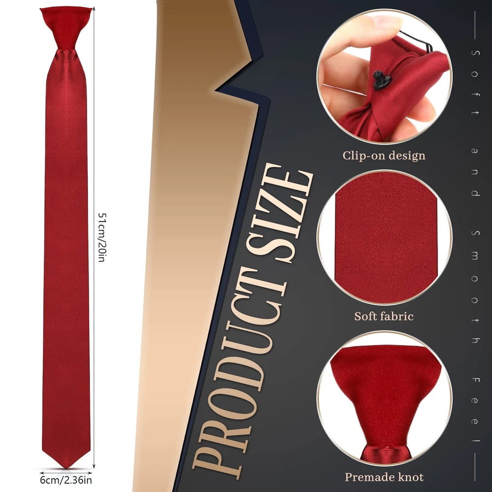 Description Features: Warm gift: The pre tied neckties for men are designed with 6 different colors, classic and beautiful, warm gift choice for your boyfriend, lover, father, colleague or other close people in your life, showing your love and care for them. Easy to match: These neck ties men are elegant and generous, easy to match with your different clothes, suitable for formal, professional or casual occasions, making you more eye catching in the crowd. Specifications: Material: polyester fiber Color: as pictures shown Length: 51 cm/ 20 inch Package includes: 6 x Men's clip on ties Notes: Manual measurement, please allow slight errors on size. The color may exist slight difference due to different screen displays. Winding risk may exist, please keep away from little . What You Will Receive: this package comes with 6 pieces of uniform ties for men, which are available in 6 different colors, classic and exquisite, enough quantity and rich colors to meet your use and needs Comfortable to Wear: the men's tie is made of quality polyester fiber material, soft, smooth, not easy to , pilling or fade, and washable, which can be applied for a long time, brining you a comfortable using experience Convenient Clip on Design: the clip on neck tie was tied beforehand, convenient for you to wear, saving your time and energy, just clip it to your shirt, not easy to loosen, brining convenience to your life Ideal Size: the length of each clip on tie for men is 51 cm/ 20 inch, suitable for men's everyday wear, and the size also suitable for most men, please carefully check the size before purchasing Widely Applicable: the long clip on ties for men can be applied to different occasions, such as office, school, party, birthday, or other occasions, all suitable for formal, professional or casual occasions, meeting your different needs