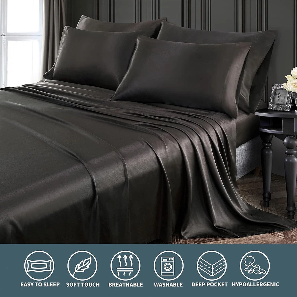 Store New Arrivals Add to Favorite View Feedback Contact Fast deliveries to the customer's home Quality customer service John Make the customers happy! 6 Pieces Queen Satin Sheets Luxury Silky Black Satin Bedding Sheet Set, 1 Deep Pocket Fitted Sheet + 1 Flat Sheet + 4 Pillow Cases Description 100% Polyester Satin 6 PIECES SILKY SATIN BED SHEET SET - Luxury satin sheets queen set includes 1 x Deep Pocket Fitted Sheet (60" x 80" + 16"), 1 x Flat Sheet (90" x 102"), 4 x Pillowcases (20" x 30"). Deep pocket fitted sheet with elastic all around, suitable for 14" to 16" deep mattress. P Pothuiny have collected everything you need to upgrade your bedding, these are some of the softest and most affordable sheets you will ever find. TOP QUALITY CONSTRUCTION - Black Silky Satin Sheets is made of 100% Polyester (Satin Fabric), soft like as silk, smooth, breathable and sensitive skin-friendly. Polyester satin provided a beautiful glossy luster and heavenly soft texture, let you enjoy unparalleled comfort just like in a 5-star luxury hotel ! P Pothuiny satin sheet set will definitely surprise you and fall in love with it! WONDERFUL CHOICE FOR HAIR AND SKIN - Do you wake up with crazy bed hair? P Pothuiny satin bed sheets silky soft against your skin, will NOT absorb moisture to help retain your shiny hair and prevent dry skin and facial wrinkles. Smooth Satin pillow cases create less friction than sleeping on cotton pillowcase to prevents hair from breakage, tangle and loss. EASY TO CARE - Machine wash cold with a mild detergent, gentle cycle, tumble dry low. Do not bleach. Polyester satin sheet is best alternatives for silk sheet, wrinkle free, stain and fade resistant, easy to care. If your skin is sensitive, we recommended that you wash it before using. ZERO RISK PURCHASE - We are so confident in the quality of satin sheets, bringing you satin sheets are good value for money. If you have any dissatisfaction with our product, you can return them for a refund or replacement within 30 days, no question asked! Enjoy Your Comfort Sleep with P Pothuiny Luxury Bedding Sets P Pothuiny committed to providing comfortable, durable and easy-to-care bedding, allowing you to feel warmth and love in your busy life. Luxury you can afford even if you're looking to save without compromising on quality, P Pothuiny satin sheet set is the perfect choice for you. High Quality Fabric: Silky Satin is extreme soft and as fine as silk, breathable and natural. Cool in the summer and warm in the winter, a satin sheet is a luxury to be enjoyed throughout the year. Flawless Craftsmanship: We also use superior craftsmanship to make sure the quality of the bed sheets and pillowcases. The stitches are fine and straight, so you can't find any flaws even when you look at them up close, while also ensuring the durability of the sheets. Fits Most Mattress and Rooms: Fully elasticized fitted sheet fits most mattress. Best choice for bedroom, guest room, kids room, dorm or vacation home. 6 Pieces Full Size Bedding Set 4 x Pillowcases (20" x 30"), 1 x Flat Sheet (81" x 92"), 1 x Fitted Sheet (54" x 75" + 16") 6 Pieces Queen Size Bedding Set 4 x Pillowcases (20" x 30"), 1 x Flat Sheet (90" x 102"), 1 x Fitted Sheet (60" x 80" + 16") 6 Pieces King Size Bedding Set 4 x Pillowcases (20" x 40"), 1 x Flat sheet (108" x 102"), 1 x Fitted sheet (78" x 80" + 16") P Pothuiny Customer Service: We take every customer opinions seriously and fine-tune every detail to ensure quality, fit and comfort. Item model number Jinyin201215-0001 Style Bedding Sheet Set Weave Type Satin Pattern Solid Country of Origin China Theme Love Number of Pieces 6 Unit Count 1 Count Batteries required No Pillowcase Quantity 4 Material Satin Age Range (Description) Adult Seasons Winter, Summer Package Dimensions 14.96 x 10.61 x 2.68 inches Closure Type Pull-On Item Weight 3.1 pounds Sham Quantity 4 Special Feature Wrinkle Resi Color Black Included Components Fitted She Fabric Type 100% Polyester Satin Product Care Instructions Machine Wash, Do Not Bleach, Mild Detergent, Tumble Dry Low Size Queen ABOUT US We offer the best prices around on high quality products. Our E-store includes media such as books, movies, music and games while offering electronics, toys, sporting apparel, clothing, tools, general home, garden items and more. SHIPPING We are always working hard to ensure your package arrives as soon as possible. Please understand that some factors like weather, high postal traffic, and the performance of shipping companies are outside of our control. We offer free shipping to the lower 48 states and ship within 2 business days of payment, usually sooner. We do not accept P.O. Boxes. Please provide a physical address. For shipping outside of the continental USA, we only use eBay's Global Shipping Program. The item is shipped to KY and then sent to the rest of the world. International customers are responsible for all duties and taxes. Continue to 'check out' to calculate costs for shipping the item to your country. Messages regarding eBay's Global Shipping Program MUST be directed at eBay EXCLUSIVELY. RETURNS We offer a 30-Day Return Policy on items in which you are not completely satisfied with. You have the option of a full-refund or an exchange of the item. No returns are available on items shipped outside of the USA PAYMENT We accept PayPal. CONTACT US This page content is yet to come Please ad us to your favorite seller and visit again later Thank You CUSTOMER SATISFACTION We try our very best to make sure every customer is completely satisfied. If there's a problem, message us! We're happy to help. WE ACCEPT