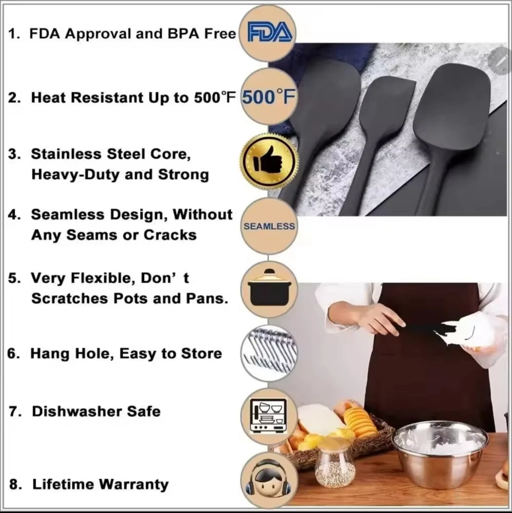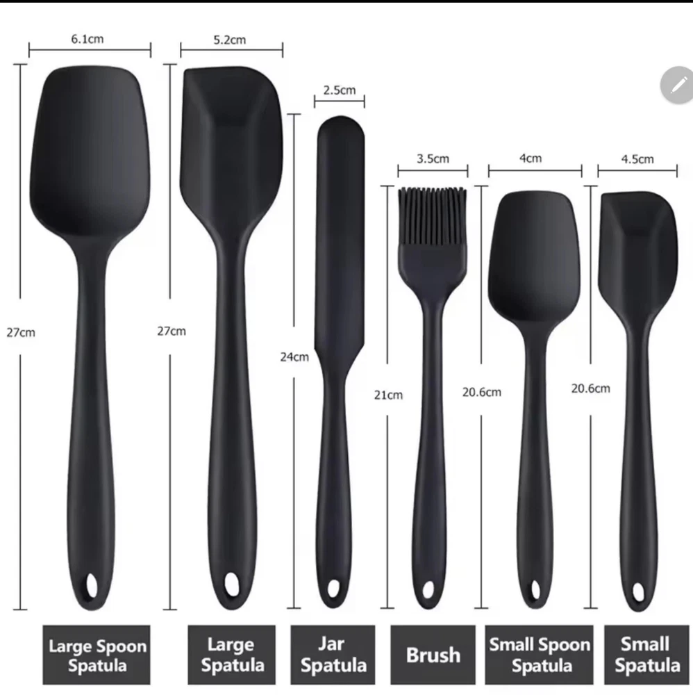 This is a set of 6 black silicone spatulas designed for cooking in the kitchen. The spatulas are heat-resistant and non-stick, making them ideal for a variety of cooking tasks. The handle material is plastic, providing a comfortable grip during use. These spatulas are a versatile and essential addition to any kitchen for cooking and baking needs.