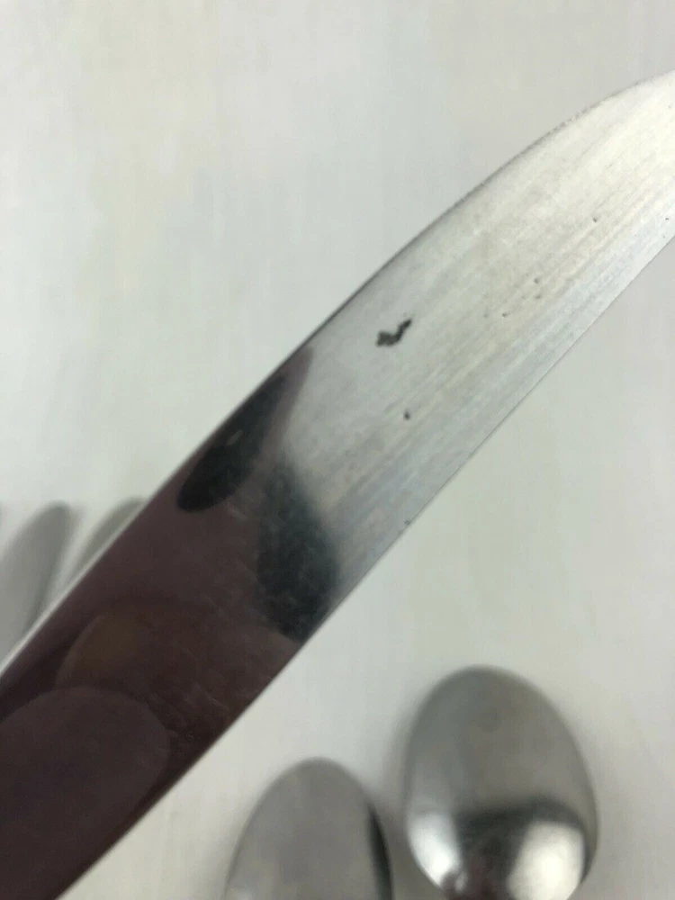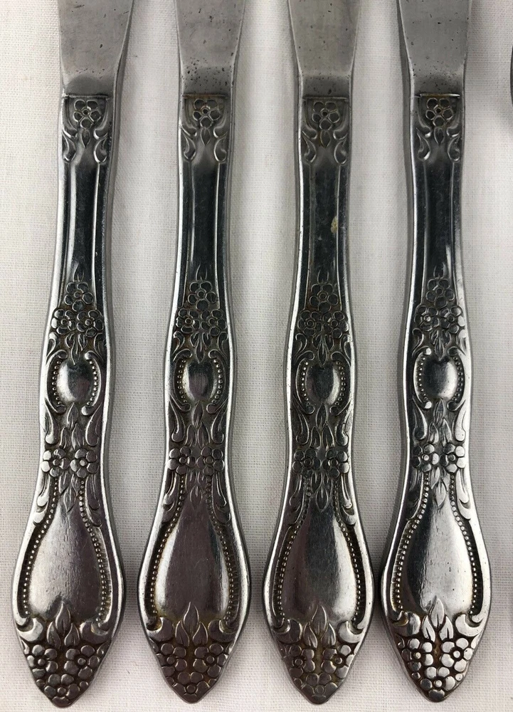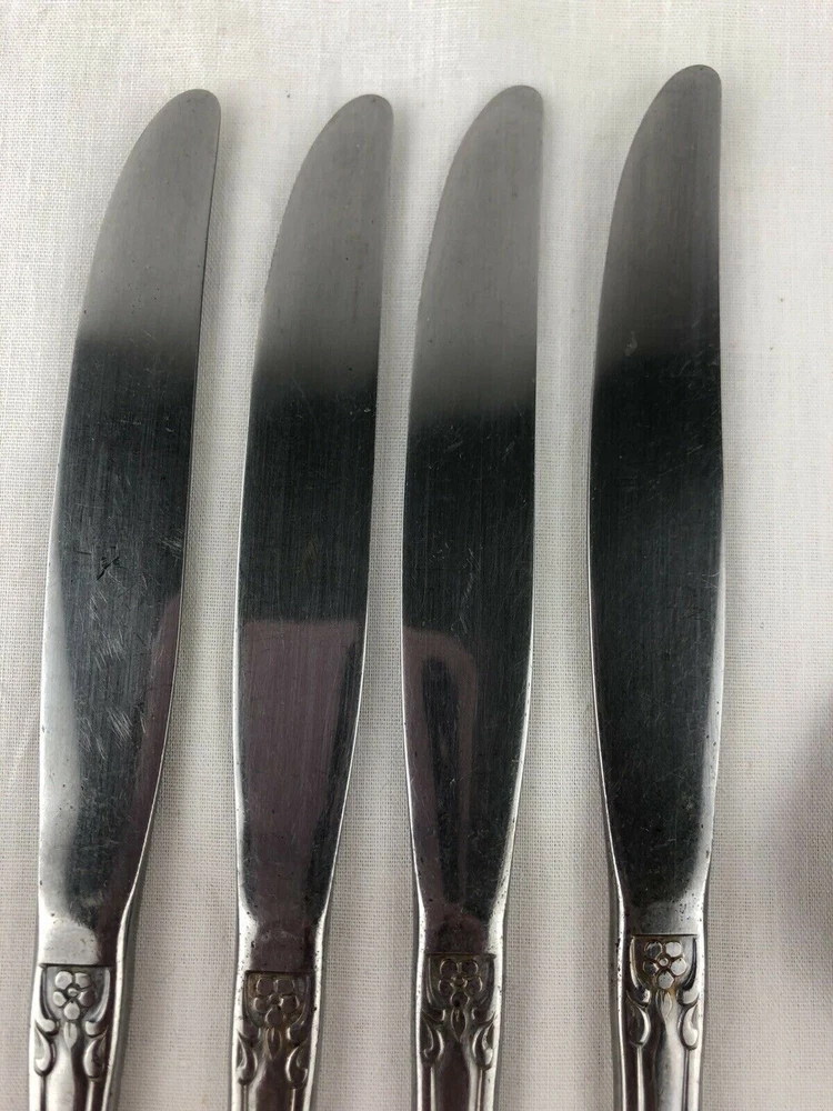 Wm A Rogers Oneida Flatware Lot includes: 4 dinner knives, 1 teaspoon and 1 tablespoons. Shows signs of light use and may need additional cleaning. Little spotting in places but no dishwasher or disposal damage. Overall very nice condition. Please see pictures for details as this is part of my description. Feel free to ask if you have any questions.