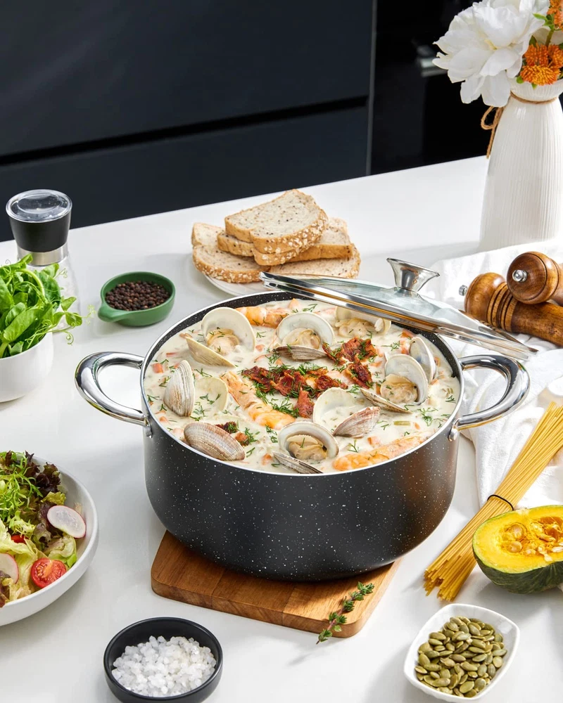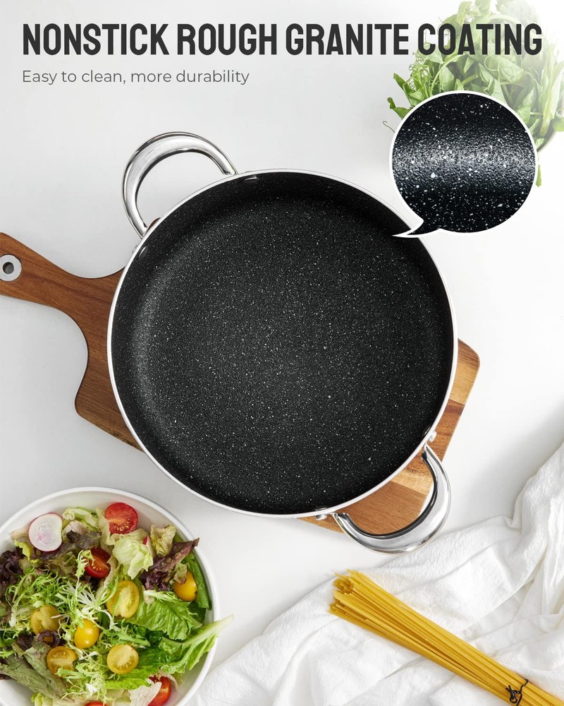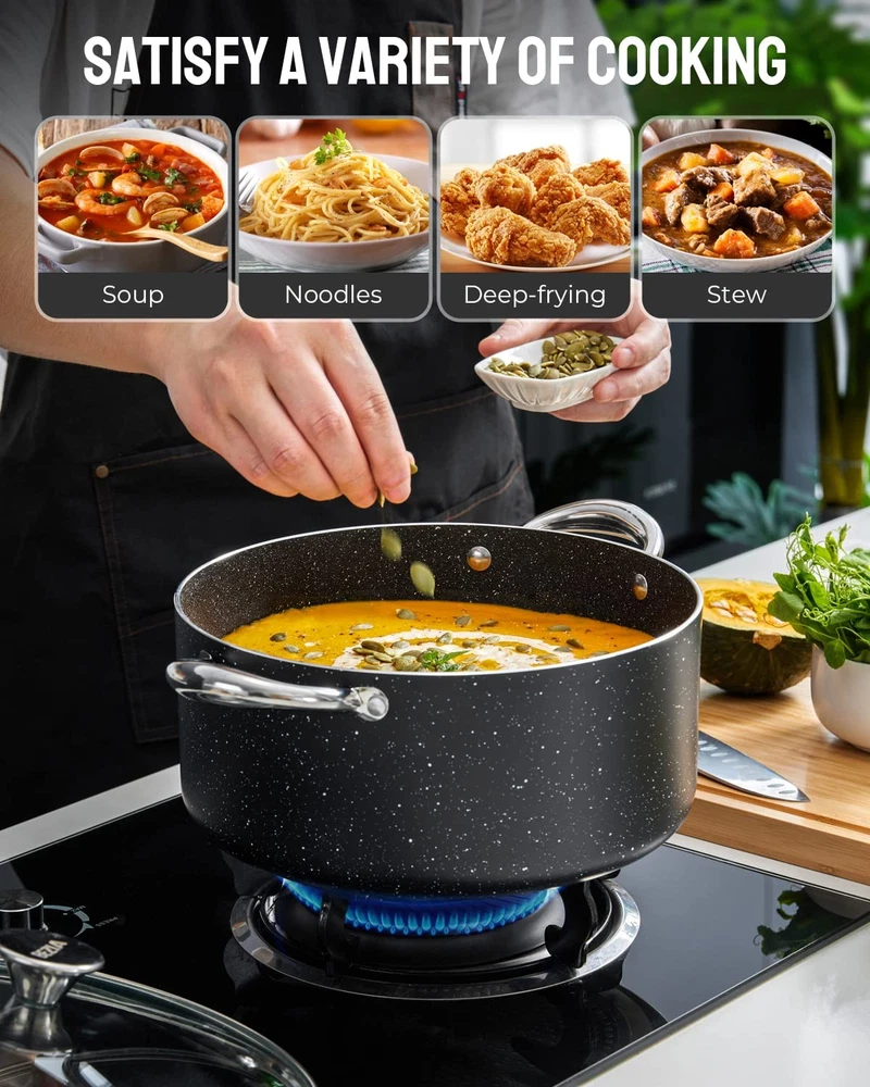 Healthy and Non-Toxic: The 6-quart cooking pot with lid has a healthy granite coating that is free of PFOS, PFOA etc, allowing you to enjoy delicious and nutritious meals with peace of mind. Easy to Clean: The rough granite non-stick coating prevents food and sticky sauces from sticking and burning to the stock pot, making cleaning a breeze. Efficient Heating: The aluminum body structure of this soup pot ensures efficient heat distribution, resulting in fast and even cooking throughout the soup pot, saving you time in the kitchen. Compatible with All Stove Types: Including gas, electric, halogen, ceramic, and induction cookers, this induction pot provides flexibility for any kitchen setting. Oven Safe: The 6 quart pot is oven safe up to 450°F, but the lid should not be placed in the oven. When using the big pot at high temperatures, be sure to wear oven gloves to avoid burns. Shatterproof Glass Lid: The perforated design allows excess water vapor to escape, retaining the original flavor of the food and allowing you to monitor the cooking status at any time. Multiple Cooking Methods: The non-stick pot with lid is an essential piece of cookware in the kitchen, enabling you to easily cook a variety of dishes, including curry, pasta, vegetables etc. at home.