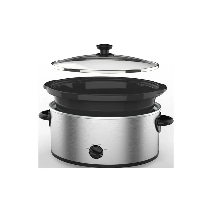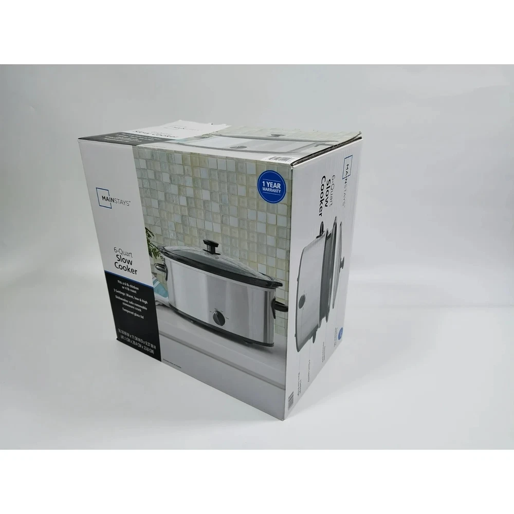 Product details The Mainstays 6 Quart Slow Cooker in stainless steel is the perfect kitchen appliance for those who enjoy delicious, homemade meals with minimal effort. With its large 6 quart volume capacity, this slow cooker is perfect for families or for meal prep, allowing you to cook large portions of your favorite recipes and save time in the kitchen. The stainless steel exterior of the slow cooker is not only durable and long-lasting, but also stylish and modern, making it a great addition to any kitchen. Three temperature settings - low, high and warm - allows you to customize your cooking to suit your needs. Low setting is perfect for slow-cooking meats and stews, while the high setting is ideal for cooking soups and chili. The warm setting is great for keeping your food at the perfect temperature until you're ready to eat. The Mainstays 6 qt. Slow Cooker also features a glass lid that seals in moisture and flavor, and the cool-touch handle, making it easy to open and close the slow cooker. Purchase a new Mainstays 6 Quart Slow Cooker in stainless steel and start cooking delicious, homemade meals today. MODEL# MS54100112168S Six (6) quart volume capacity for cooking large portions Removable stoneware 6 qt. crock for easy cleaning Makes delicious, homemade meals with minimal effort Perfect for slow-cooking meats, stews, soups, and chili Cool-touch lid handle for safe and easy use Tempered glass lid to retain moisture and flavor Fits a 6 lb chicken or 4 lb roast Three temperature settings - low, high, and warm - for customized cooking Rated: 210 Watts Condition: New Model Number: MS54100112168S