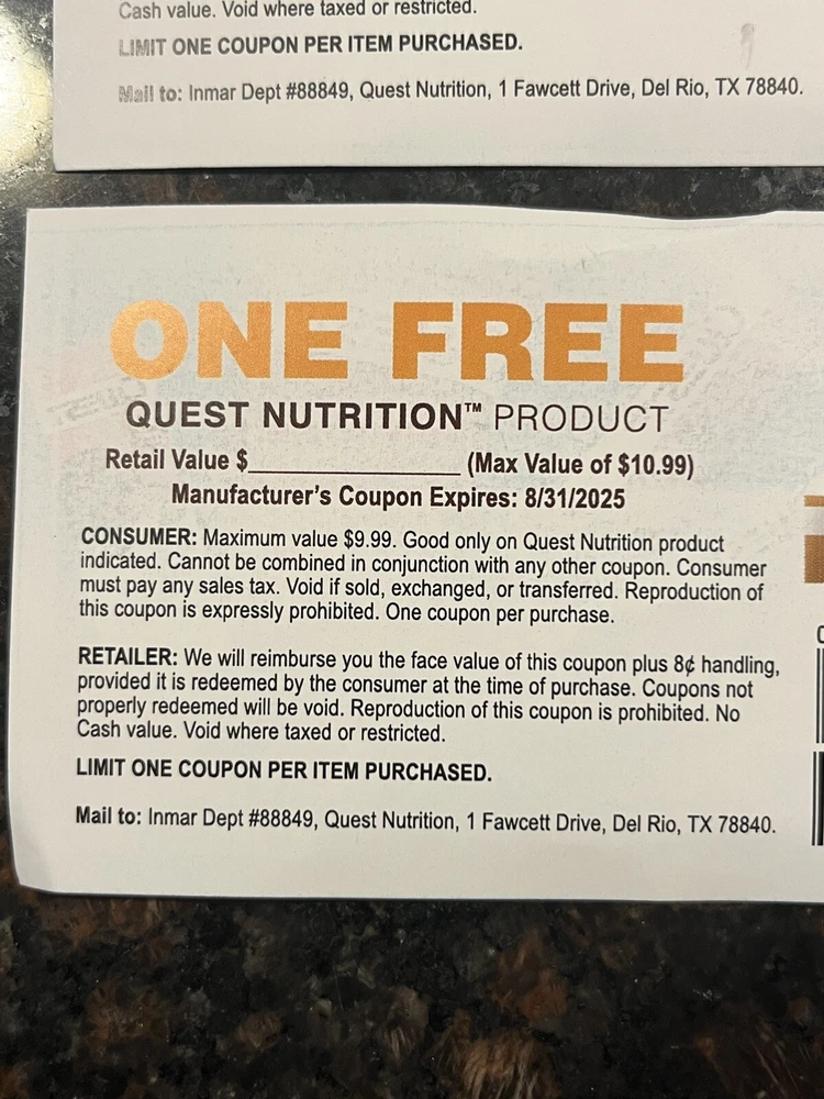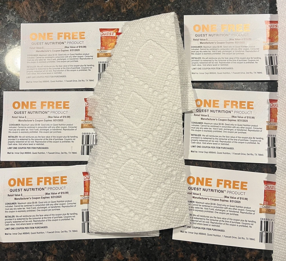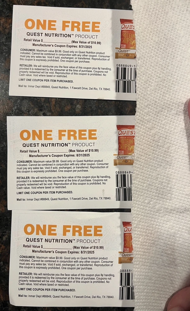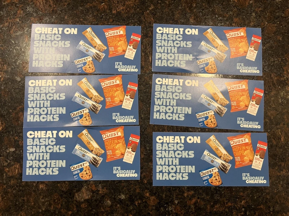 6 Quest Nutrition Coupons $65 Value. You will receive 6 individual coupons for quest nutrition items. Each coupon has a value of $10.99 for an item. This is a $65.94 value! Expires 8/31/2025