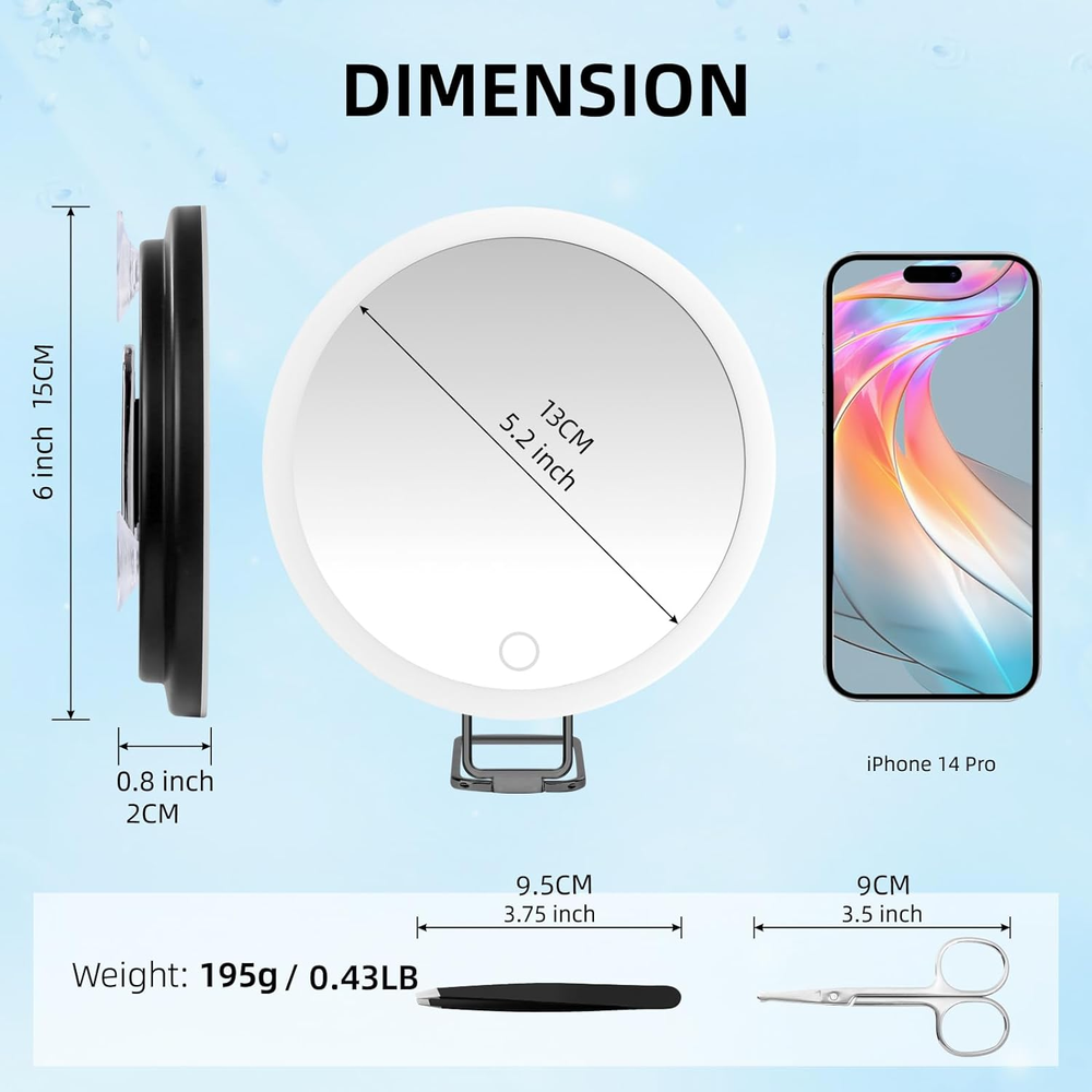 Store New Arrivals Add to Favorite View Feedback Contact 30X Magnifying Mirror with Light, Large 6" Rechargeable Lighted 30X Magnified Mirror with Suction Cups & Table Stand, 3 Color Modes Dimmable Light up Travel Magnifying Makeup Mirror High Magnification Description Style Modern Number of Items 1 Magnification Maximum 3E+1 Theme Travel Frame Color Black Number of Pieces 1 Room Type Bedroom, Bathroom, Dressing Room, Living Room, Hotel, Travel Assembly Required No Material Glass, Acrylonitrile Butadiene Styrene Batteries 1 Lithium Ion batteries required. (included) Frame Material Acrylonitrile Butadiene Styrene (ABS) Finish Type Polished Specific Uses For Product Makeup Item Weight 5.5 ounces Surface Recommendation Wood Special Feature Rechargeable Battery, Large Size of 6inch, 3 Color Dimmable Light, With Tweezers & Scissors, Can be Handheld, Table Stand & Hanging Mounting Type Table Stand, Wall Mounted, Portable, Handheld Color 30x -Black Is Hanging Yes Shape Round Frame Type Framed Product Dimensions 6"L x 6"W Size 6"L x 6"W 【3 COLOR MODES & DIMMABLE LIGHT】 The 30X magnifying mirror provides 3 color lighting- cold, natural and warm light for different makeup occasion. Tap the touch screen switch, changing the color of light; Hold the touch switch longer, brightness dim or bright. 30X magnification is very powerful. The pores of the face are clearly visible, making it ideal for focusing on specific parts of your face or eyes in great detail. A great gift for people with delicate facial needs and blurred vision. 【COMPACT & LARGER 6” VIEWING AREA】The 30x magnifying mirror with light is made with high-quality ABS plastic and mirror glass, weighs 7 oz and is 6" in diameter. It is lightweight, and handy making it easy for you to put them in a handbag, shoulder bag, backpack or suitcase, and more. And the viewing area of 5.8inch is 65% larger than others of 3.4inch. 【RECHARGEABLE 1500mAh BATTERY】 The 30x lighted magnifying mirror with suction cups built-in 1500mAh rechargeable battery,7 days only need one charge. Type-C charging ports can be charged for this magnifying mirror through laptop, power bank, charging head. A great makeup essential for travel. 【MULTI-USE METHOD】This light up travel magnifying mirror 30x have 3 sturdy suction cups and a 360° adjustable stand, it can be suctioned on any smooth surface, or used on tables, hand-held or suspended. You can use the magnifying mirror anywhere. 【DURABLE TWEEZERS & SCISSORS】Made with stainless steel for durability and long-lasting performance. The slanted tweezers with matte finish grabs every hair with ease and precision, suitable for eyebrow grooming and all-around use. The grooming scissors with rounded tip used for facial hair removal, ear, nose and eyebrow trimming. 【THINGS YOU NEED TO KNOW】Unlike flat mirrors, 30x magnification is a concave mirror, please hold the mirror VERY CLOSE to eyes (2-3inchs) and focus on the MIDDLE AREA of it to get a clear image. If your image is upside down,distorted or blurry, please get closer to the mirror, the mirror itself has no quality problems. And the mirror designed for specific facial need instead of whole face makeup. Product Description ABOUT US We offer the best prices around on high quality products. Our E-store includes media such as books, movies, music and games while offering electronics, toys, sporting apparel, clothing, tools, general home, garden items and more. SHIPPING We are always working hard to ensure your package arrives as soon as possible. Please understand that some factors like weather, high postal traffic, and the performance of shipping companies are outside of our control. We offer free shipping to the lower 48 states and ship within 2 business days of payment, usually sooner. We do not accept P.O. Boxes. Please provide a physical address. RETURNS We offer a 30-Day Return Policy on items which you are not completely satisfied with. You have the option for a full-refund or an exchange of the item. No returns are available on items shipped outside of the USA. PAYMENT We accept PayPal. CONTACT US This page content is yet to come Please ad us to your favorite seller and visit again later Thank You CUSTOMER SATISFACTION We try our very best to make sure every customer is completely satisfied. If there's a problem, message us! We're happy to help