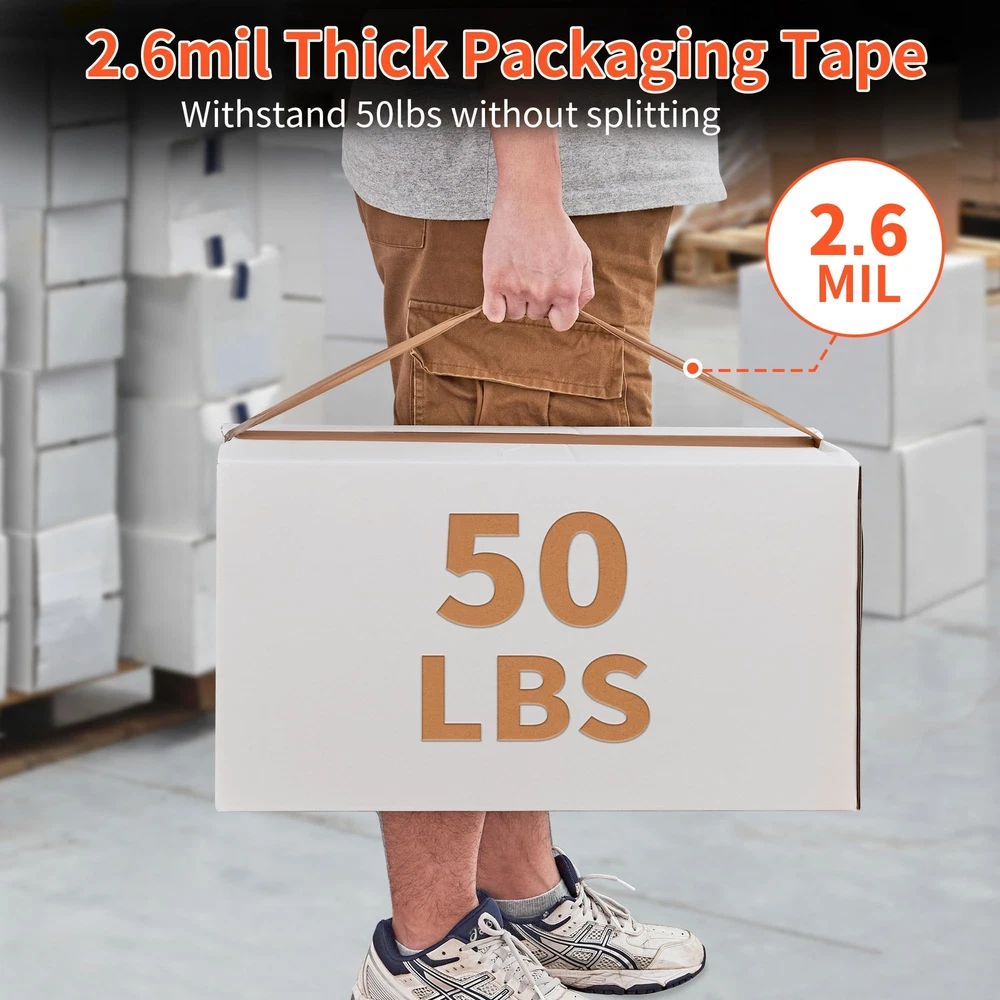 Value Pack: This set includes 6 rolls of brown packing tape and a dispenser, each roll offering 55 yards of tape that is 1.88 inches wide. With a total of 330 yards (990 feet), it's a cost-effective solution for all your packing and sealing projects. High-Quality Adhesive: Featuring a robust BOPP acrylic adhesive, this packaging tape creates a strong and lasting bond. It maintains its adhesive performance under a variety of conditions, ensuring long-term reliability and stickiness. Superior Durability: At 2.6 mils in thickness, this shipping tape provides excellent toughness and durability. It's highly resistant to tears and splits, making it the ideal choice for general industrial packing and boxes that weigh up to 50 pounds. Easy to Use: Designed for use with standard handheld dispensers with a core diameter of 3 inches and a width of 2 inches. The heavy-duty tape is simple to tear and peel, allowing for quick and efficient application without the need for additional tools. Versatile Applications: Perfect for more than just warehouse use, this moving tape is also great for household, industrial, and office settings. It's suitable for sealing, packing, repairing, labeling, and decorating, ensuring the safety and integrity of items during transit.