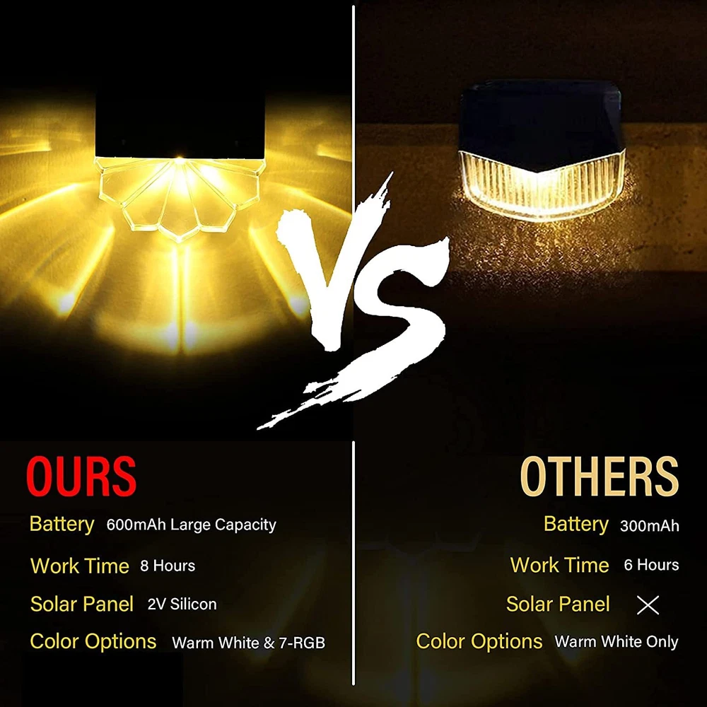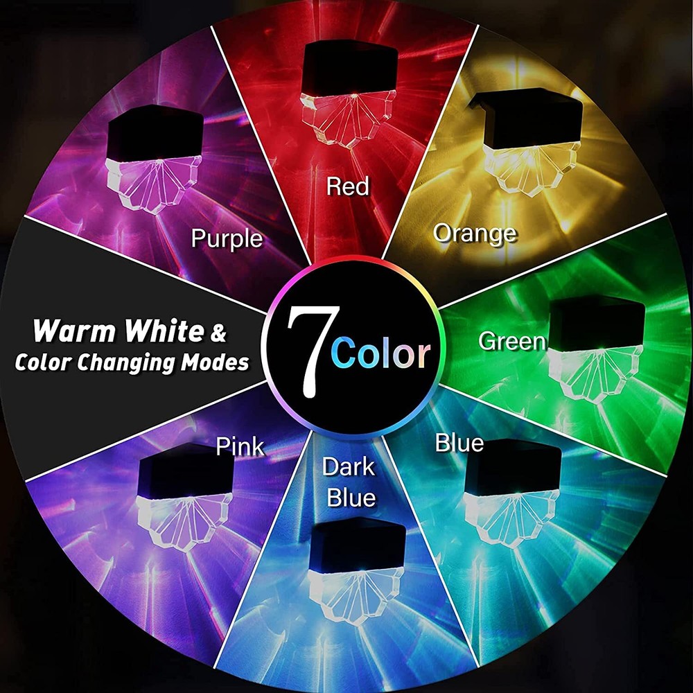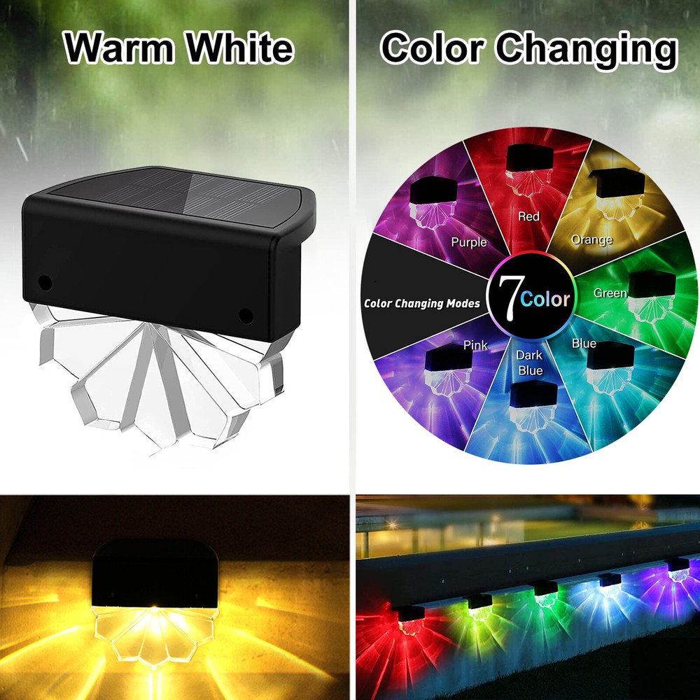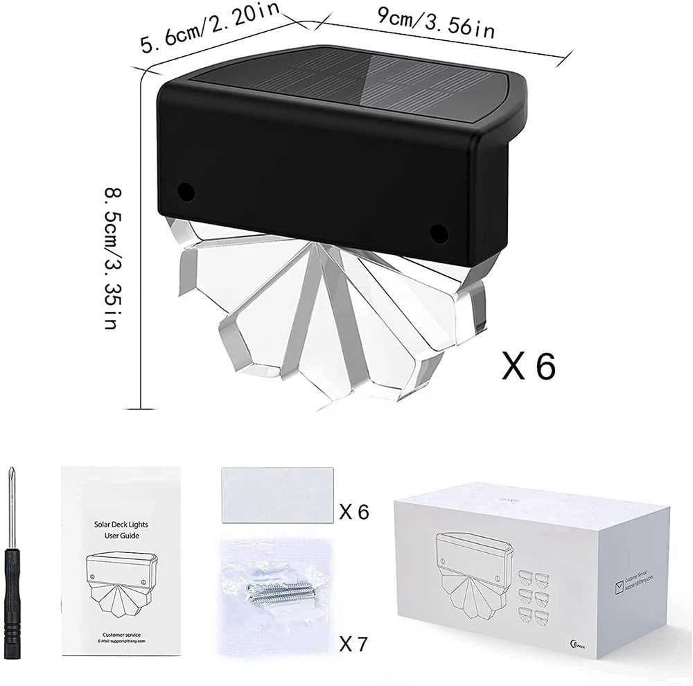 Ltteny Solar Deck Lights Outdoor,6 Pack Solar Step Lights Outdoor Waterproof LED Solar Fence Lights, Warm White/Color Changing ,Stair Lights for Patio Stairs Yard Garden Pathway Step Fences 【Color-switchable & 2 Lighting Modes】 Ltteny 2021 New outdoor solar step light has 2 lighting modes: warm white and 7 changing color lighting. Warm white mode is suitable for daily lighting and decoration. 7 changing color lighting mode especially suitable for festival decoration. Creates a nice ambience for your patio, stair, fence, deck, garden, porch, pathway, etc. 【High Conversion Rate & Auto on/off】Larger solar panel made of polysilicon silicon, it charges much faster than other solar fence light in the same sun condition. Only takes about 4-5 hours to fully charge in sunny day and it can work about 10-15 hours at night. Don't worry about turning lights on and off. Ltteny solar deck lights will turn on automatically at dusk, and off at dawn. 【IP65 & All-day Support】The solar deck light outdoor is made of the IP65 waterproof technology by durable ABS material, which can 【Easy Installation】The solar deck light was designed with two screws hole to fixed.Use the included tools with the light, mounts on 【Widespread Use】The solar step lights outdoor perfect for illuminating stairs, paths, gardens, decks, also use lighting front door Package Included: 6 * Solar Step Light 7 * Screw Set 18 * Screw 7 * Double-sided tape