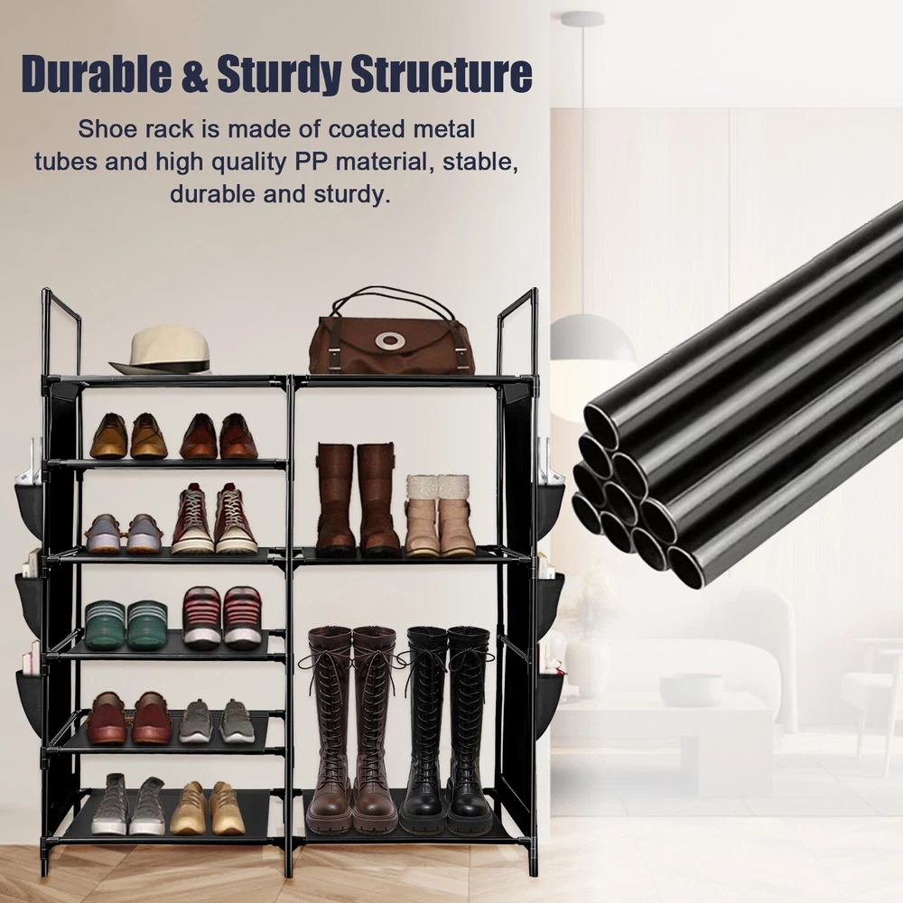 Features Durable & Sturdy Structure: Shoe rack is made of coated metal tubes and high quality PP parts, stable durable sturdy. Large Capacity: 6 Tires + Storage Bag, the design of increasing height and width makes this large shoe rack can store more styles of shoes. Extar Storage Bag: The side of the shoe rack is equipped with a storage bag to add more convenience to your life. Versatile Shoe Shelf: It can store all kinds of shoes, such as sports shoes, boots, high-heeled shoes, flip flops, sandals, slippers, etc. It is very suitable for your family and guests to tidy shoes. Specification Type: Shoe Rack Product Type: Assembled Material: Coated Metal Tubes, PP, Non-woven fabric Color: Black Size: 43.3*36.64*11.02in Package 1x Shoe Rack 、 On Jun 26, 2025 at 03:21:45 PDT, seller added the following information: