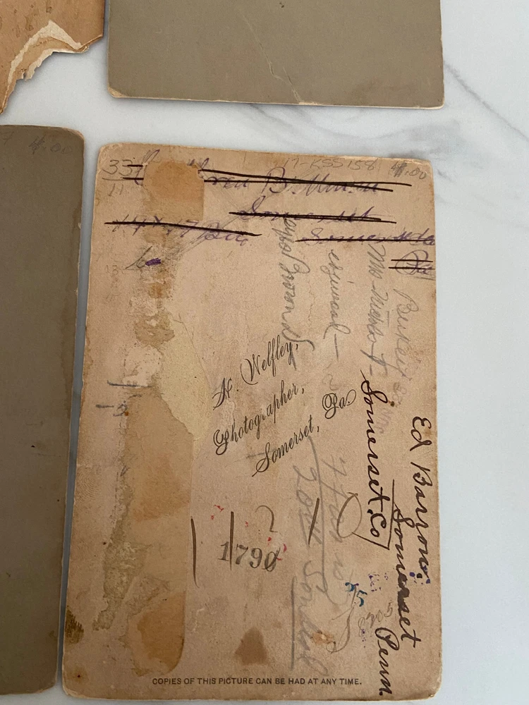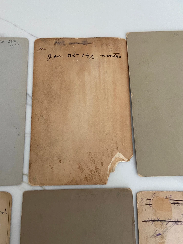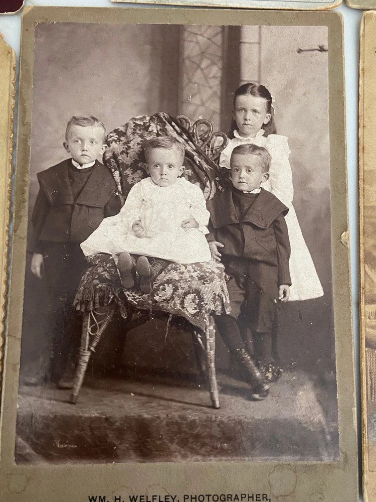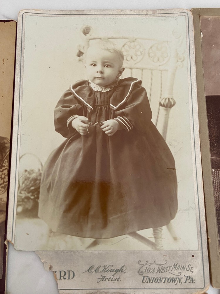 Cabinet cards are photographs mounted on stiff pieces of cardboard. They were introduced in the 1860s. The front of the card is usually printed or embossed with the photographer’s details, and the back of the cabinet card is often printed with elaborate designs. The popularity of the cabinet card waned around the turn of the century, particularly after the introduction of the photographic postcard, but they were still being produced right until the First World War. The color of the cardboard mount can also help date the photograph. Cream mounts were always popular, but bolder, dark colors like black, dark brown, green or burgundy began to appear in the 1880s and 1890s. All in really good shape except for the CC Hough photograph of an infant - it has damage to lower left corner.