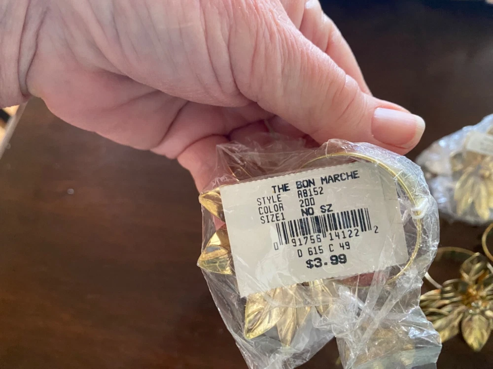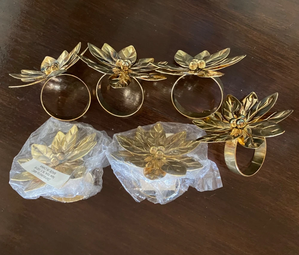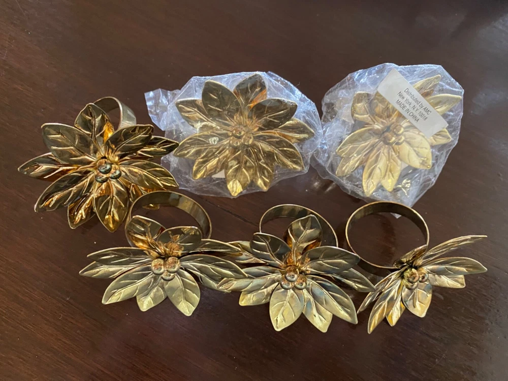 6 Vintage Christmas Napkins Rings Brass Poinsettia Bon Marche NWOT Shiny Gold