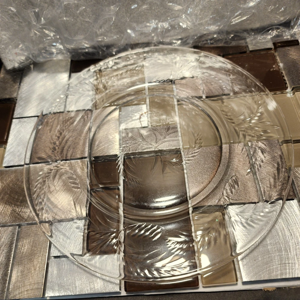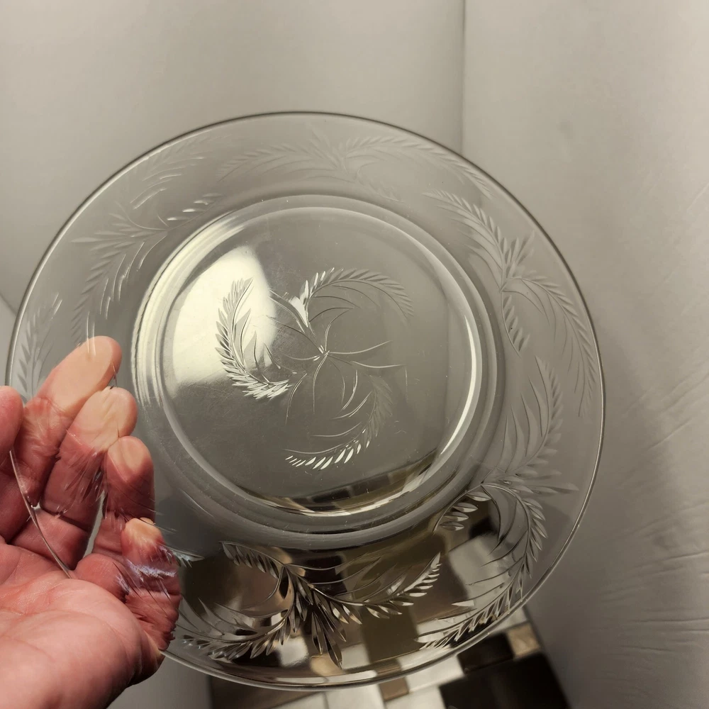 Add a touch of vintage elegance to your dinnerware with this set of six round salad plates. Measuring 8 inches in diameter, these plates are made of clear cut glass and feature a beautiful laurel leaf pattern that will elevate any table setting. Perfect for all occasions, these mid-century modern style plates are ideal for serving salads or lunch. This set of salad plates is part of the Early American Prescut/EAPC product line and was made in the United States using press cut production technique. The plates are in excellent condition and are perfect for collectors or anyone who loves vintage decor. Whether you're hosting a dinner party or simply looking for unique pieces to add to your collection, these plates are sure to impress.