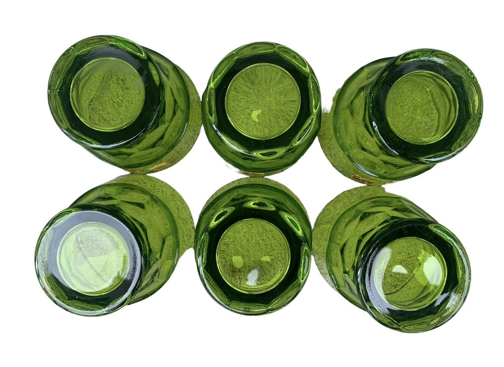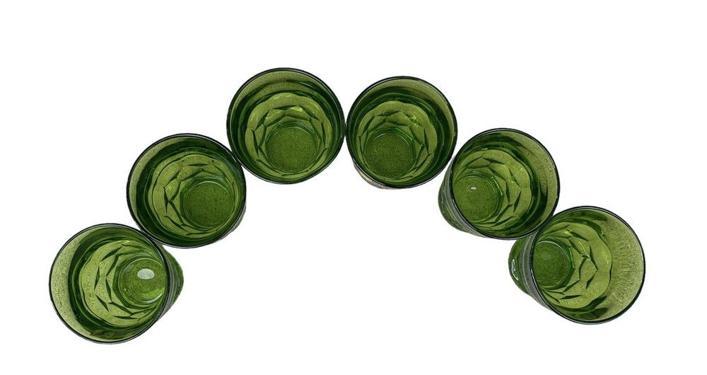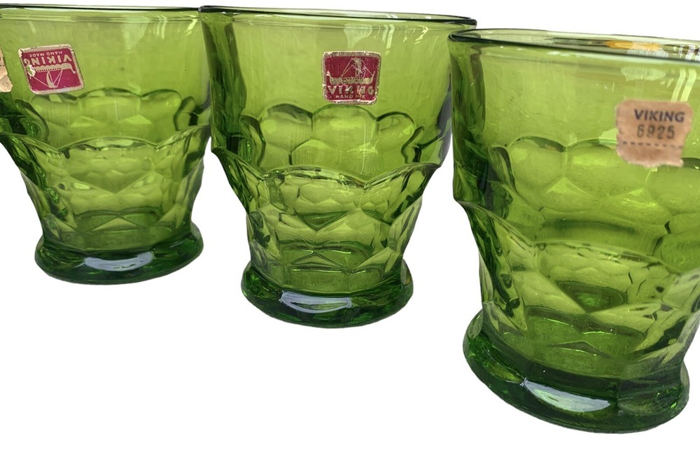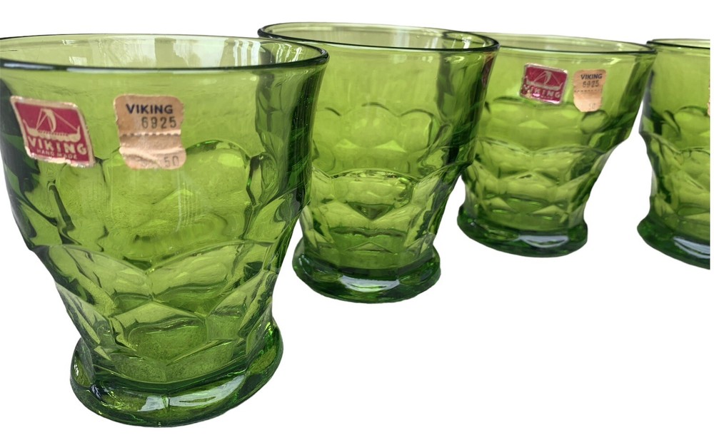 This set of six vintage Viking #6925 honeycomb drinking glasses in emerald green is a must-have for any collector or lover of mid-century modern style. The glasses feature a Georgian-inspired design with a honeycomb pattern, making them both elegant and unique. Tags show wear but are present on all but one glass