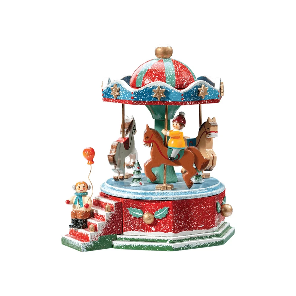 Description A Kathe W0hlfahrt designed music box, depicting a winter carousel filled with happy children taking a ride at a Christmas Market. The music box plays “It's a Small World". Height: 6 in