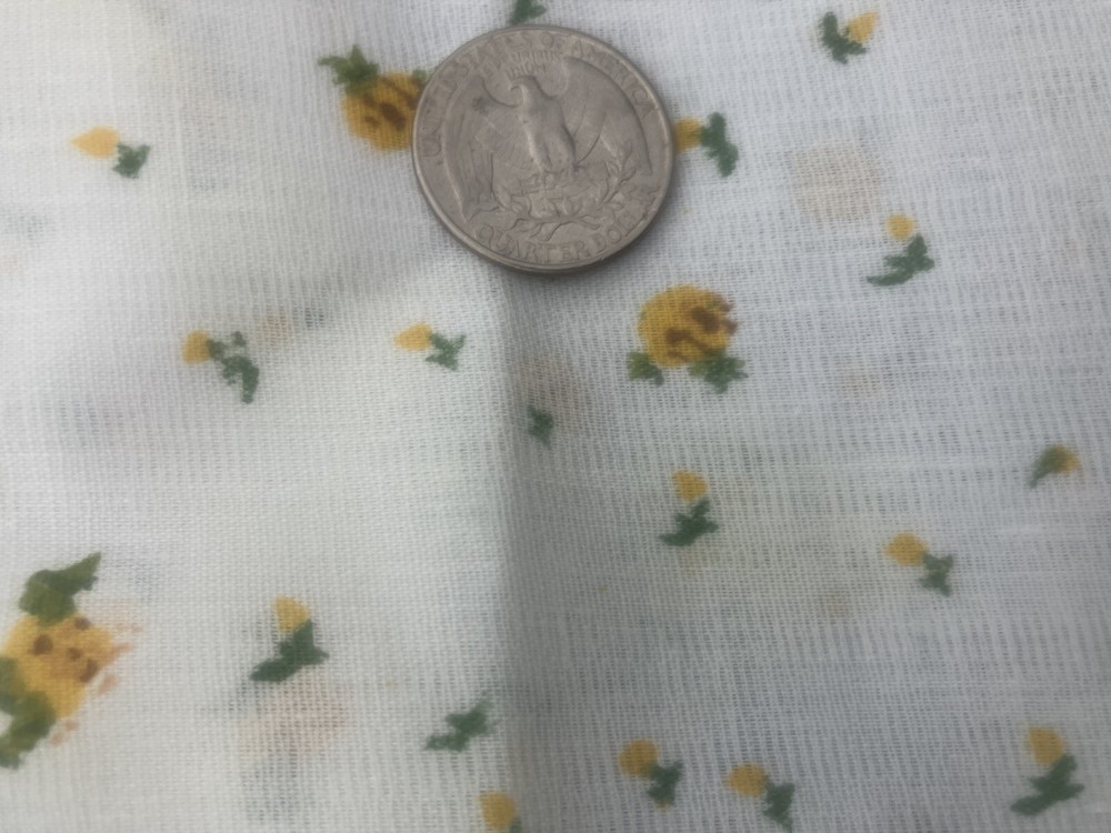 6 yards white semi sheer cotton voile fabric with tiny yellow flowers..that is 44" wide. very sweet fabric. Being sold with two areas of yellow shading. Please see this on my pictures. . Most of the fabric is perfect so the areas are very small. where the fabric has bled. Please take a moment to look at all of my fabric and feed sacks listed on ebay at this time. I am always happy to combine shipping. All of my fabrics vintage clothing and textiles come from a smoke free, animal free home. Shipping of this fabric will be $10.95 priority.